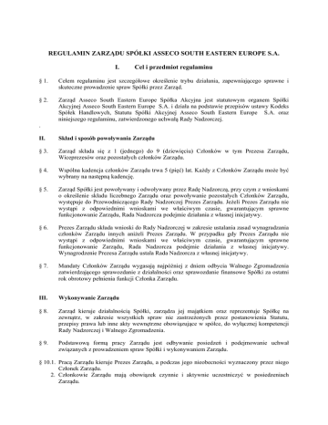 REGULAMIN ZARZĄDU SPÓŁKI ASSECO SOUTH EASTERN EUROPE S.A. I. Cel i przedmiot regulaminu § 1. Celem regulaminu jest szczegółowe określenie trybu działania, zapewniającego sprawne i skuteczne prowadzenie spraw Spółki przez Zarząd. § 2. Zarząd Asseco South Eastern Europe Spółka Akcyjna jest statutowym organem Spółki Akcyjnej Asseco South Eastern Europe S.A. i działa na podstawie przepisów ustawy Kodeks Spółek Handlowych, Statutu Spółki Akcyjnej Asseco South Eastern Europe S.A. oraz niniejszego regulaminu, zatwierdzonego uchwałą Rady Nadzorczej. . II. Skład i sposób powoływania Zarządu § 3. Zarząd składa się z 1 (jednego) do 9 (dziewięciu) Członków w tym Prezesa Zarządu, Wiceprezesów oraz pozostałych członków Zarządu. § 4. Wspólna kadencja członków Zarządu trwa 5 (pięć) lat. Każdy z Członków Zarządu może być wybrany na następną kadencję. § 5. Zarząd Spółki jest powoływany i odwoływany przez Radę Nadzorczą, przy czym z wnioskami o określenie składu liczebnego Zarządu oraz powoływanie pozostałych Członków Zarządu, występuje do Przewodniczącego Rady Nadzorczej Prezes Zarządu. Jeżeli Prezes Zarządu nie wystąpi z odpowiednimi wnioskami we właściwym czasie, gwarantującym sprawne funkcjonowanie Zarządu, Rada Nadzorcza podejmie działania z własnej inicjatywy. § 6. Prezes Zarządu składa wnioski do Rady Nadzorczej w zakresie ustalania zasad wynagradzania członków Zarządu innych aniżeli Prezes Zarządu. W przypadku gdy Prezes Zarządu nie wystąpi z odpowiednimi wnioskami we właściwym czasie, gwarantującym sprawne funkcjonowanie Zarządu, Rada Nadzorcza podejmie działania z własnej inicjatywy. Wynagrodzenie Prezesa Zarządu ustala Rada Nadzorcza z własnej inicjatywy. § 7. Mandaty Członków Zarządu wygasają najpóźniej z dniem odbycia Walnego Zgromadzenia zatwierdzającego sprawozdanie z działalności oraz sprawozdanie finansowe Spółki za ostatni rok obrotowy pełnienia funkcji Członka Zarządu. III. Wykonywanie Zarządu § 8. Zarząd kieruje działalnością Spółki, zarządza jej majątkiem oraz reprezentuje Spółkę na zewnątrz, w zakresie wszystkich spraw nie zastrzeżonych przez postanowienia Statutu, przepisy prawa lub inne akty wewnętrzne obowiązujące w spółce, do wyłącznej kompetencji Rady Nadzorczej i Walnego Zgromadzenia. § 9. Podstawową formą pracy Zarządu jest odbywanie posiedzeń i podejmowanie uchwał związanych z prowadzeniem spraw Spółki i wykonywaniem Zarządu. § 10.1. Pracą Zarządu kieruje Prezes Zarządu, a podczas jego nieobecności wyznaczony przez niego Członek Zarządu. 2. Członkowie Zarządu mają obowiązek czynnie i aktywnie uczestniczyć w posiedzeniach Zarządu. 3. Okresowych zwolnień od wykonywania Zarządu (urlopy) Członkowi Zarządu udziela Prezes Zarządu. §11.1. Prezes Zarządu sprawuje zwierzchni nadzór nad wszystkimi pracownikami i komórkami organizacyjnymi Spółki, które - w ramach ustalonej struktury organizacyjnej - podlegają bezpośrednio poszczególnym Członkom Zarządu. 2. W stosunkach wewnętrznych, a w szczególności w stosunkach pracowniczych Prezes Zarządu ma prawo do jednoosobowego podejmowania decyzji ostatecznych. W ramach powyższej kompetencji Prezes Zarządu może w szczególności uchylić decyzję innego Członka Zarządu chyba, że co innego wynika z uprzednio podjętej uchwały Zarządu lub przepisów prawa. 3. Szczegółowy podział kompetencji pomiędzy Członków Zarządu określa odrębna uchwała. Zmiana wewnętrznego podziału, pomiędzy Członków Zarządu, obowiązków dotyczących sprawowania nadzoru i zarządzania poszczególnymi sferami działalności w przedsiębiorstwie Spółki wymaga stosownej uchwały Zarządu. 4. Zarząd może w drodze uchwały okresowo powierzyć Członkowi Zarządu dodatkowe obowiązki, inne niż to wynika z przyjętego podziału pracy, określając w treści uchwały ich zakres oraz czas wykonywania. 5. Prezes Zarządu może wskazać spośród Wiceprezesów I-szego i II-go Wiceprezesa uprawnionych do zastępowania go w czasie swojej nieobecności. W takim przypadku w pierwszej kolejności uprawnionym do zastępowania Prezesa będzie I-szy Wiceprezes, a w przypadku nieobecności zarówno Prezesa, jak i I-szego Wiceprezesa uprawnionym do zastępowania Prezesa będzie II-gi Wiceprezes. W powyższym przypadku wyznaczonemu Członkowi Zarządu przysługują w stosunkach wewnętrznych wszystkie kompetencje Prezesa Zarządu. § 12. Oświadczenia woli w zakresie praw i obowiązków majątkowych i niemajątkowych spółki składają Członkowie Zarządu, zgodnie z postanowieniami określającymi zasady reprezentacji, zawartymi w Statucie Spółki. § 13.1. Do zawierania umów pomiędzy Spółką a pracownikami przedsiębiorstwa Spółki, a także do reprezentowania przedsiębiorstwa Spółki i dokonywania czynności wynikających ze stosunku pracy wobec pracowników, Prezes Zarządu może upoważnić pracownika przedsiębiorstwa Spółki, nie będącego Członkiem Zarządu. 2. Zarząd może udzielić prokury. Udzielenie prokury wymaga uchwały Zarządu podjętej jednomyślnie przez wszystkich Członków Zarządu. 3. Do wykonywania czynności określonego rodzaju Zarząd może ustanowić pełnomocników upoważnionych do działania w granicach określonych w udzielonym pełnomocnictwie. 4. Prokura lub pełnomocnictwo mogą zostać odwołane na wniosek każdego Członka Zarządu, działającego na zasadzie reprezentacji ujawnionej w rejestrze przedsiębiorców. Wniosek o odwołanie prokury lub pełnomocnictwa, złożony przez jednego Członka Zarządu, jest wiążący dla pozostałych Członków Zarządu. § 14. Uchwały Zarządu wymagają w szczególności następujące sprawy: 1/ Określanie strategii rozwoju Spółki i Grupy Kapitałowej oraz wprowadzanie w niej zmian, które okażą się niezbędne w trakcie jej realizacji, a także określanie zasad wykonywania nadzoru właścicie