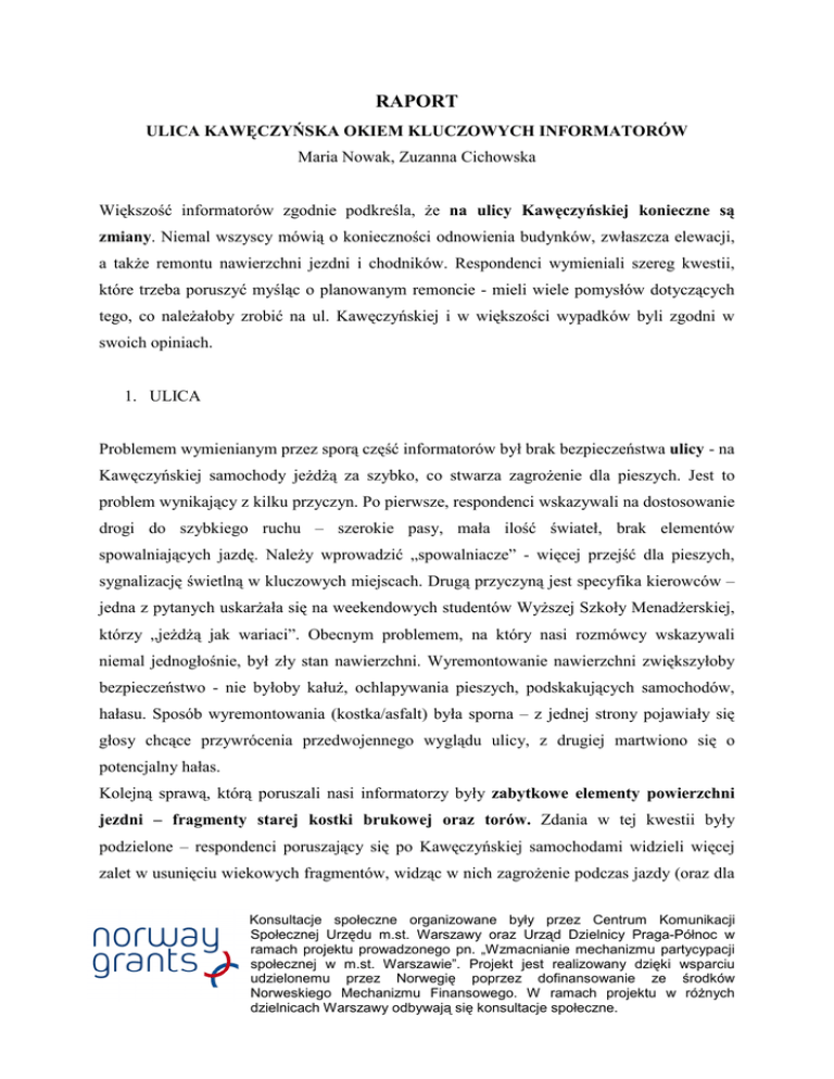 RAPORT ULICA KAWĘCZYŃSKA OKIEM KLUCZOWYCH INFORMATORÓW Maria Nowak, Zuzanna Cichowska Większość informatorów zgodnie podkreśla, Ŝe na ulicy Kawęczyńskiej konieczne są zmiany. Niemal wszyscy mówią o konieczności odnowienia budynków, zwłaszcza elewacji, a takŜe remontu nawierzchni jezdni i chodników. Respondenci wymieniali szereg kwestii, które trzeba poruszyć myśląc o planowanym remoncie - mieli wiele pomysłów dotyczących tego, co naleŜałoby zrobić na ul. Kawęczyńskiej i w większości wypadków byli zgodni w swoich opiniach. 1. ULICA Problemem wymienianym przez sporą część informatorów był brak bezpieczeństwa ulicy - na Kawęczyńskiej samochody jeŜdŜą za szybko, co stwarza zagroŜenie dla pieszych. Jest to problem wynikający z kilku przyczyn. Po pierwsze, respondenci wskazywali na dostosowanie drogi do szybkiego ruchu – szerokie pasy, mała ilość świateł, brak elementów spowalniających jazdę. NaleŜy wprowadzić „spowalniacze” - więcej przejść dla pieszych, sygnalizację świetlną w kluczowych miejscach. Drugą przyczyną jest specyfika kierowców – jedna z pytanych uskarŜała się na weekendowych studentów WyŜszej Szkoły MenadŜerskiej, którzy „jeŜdŜą jak wariaci”. Obecnym problemem, na który nasi rozmówcy wskazywali niemal jednogłośnie, był zły stan nawierzchni. Wyremontowanie nawierzchni zwiększyłoby bezpieczeństwo - nie byłoby kałuŜ, ochlapywania pieszych, podskakujących samochodów, hałasu. Sposób wyremontowania (kostka/asfalt) była sporna – z jednej strony pojawiały się głosy chcące przywrócenia przedwojennego wyglądu ulicy, z drugiej martwiono się o potencjalny hałas. Kolejną sprawą, którą poruszali nasi informatorzy były zabytkowe elementy powierzchni jezdni – fragmenty starej kostki brukowej oraz torów. Zdania w tej kwestii były podzielone – respondenci poruszający się po Kawęczyńskiej samochodami widzieli więcej zalet w usunięciu wiekowych fragmentów, widząc w nich zagroŜenie podczas jazdy (oraz dla Konsultacje społeczne organizowane były przez Centrum Komunikacji Społecznej Urzędu m.st. Warszawy oraz Urząd Dzielnicy Praga-Północ w ramach projektu prowadzonego pn. „Wzmacnianie mechanizmu partycypacji społecznej w m.st. Warszawie”. Projekt jest realizowany dzięki wsparciu udzielonemu przez Norwegię poprzez dofinansowanie ze środków Norweskiego Mechanizmu Finansowego. W ramach projektu w róŜnych dzielnicach Warszawy odbywają się konsultacje społeczne. pieszych – zabytkowe kostki, gdy pada deszcz, są bardzo śliskie – trudno przez nie przejść, szczególnie osobom starszym). Respondenci poruszający się w inny sposób po ulicy Kawęczyńskiej, pragnęli zachowania elementów jako stanowiących o wyglądzie przedwojennej Warszawy. Wszyscy rozmówcy są jednak zgodni, Ŝe naleŜy zmienić obecny stan, kiedy spod dziurawego asfaltu wyziera dziurawa kostka i stare tory, a nawierzchnia jest zupełnie nierówna. Pytani przez nas wskazywali jeszcze na, z punkt widzenia pieszych (którzy stanowią liczną na tej ulicy grupę), waŜna kwestię – czyli przejścia dla pieszych. Zdaniem większości respondentów, przejść dla pieszych jest za mało, a te, które są, są słabo oznaczone. Wskazywali przy tym na kilka miejsc, które w szczególny sposób wymagają poprawy: skrzyŜowanie z ulicą Folwarczną (tam ludzie bardzo często przechodzą „na dziko” i zagraŜają im nie tylko rozpędzone samochody ale i skręcające tramwaje). W tym miejscu powinny być zdaniem jednej z rozmówczyń takŜe światła – jest to niebezpieczne skrzyŜowanie, bo znak „STOP” dla samochodu jest za wcześnie. Istniejące przejścia dla pieszych mogłyby być bardziej widoczne – na przykład to przy Domu Pomocy Społecznej Brata Alberta (Kawęczyńska 4b), czy przy bazarku. 2. CHODNIKI Obecny stan chodników pozostawia bardzo wiele do Ŝyczenia. Ta kwestia była w rozmowach z naszymi informatorami, obok problemu parkingów (omówionego poniŜej), wymieniana jako najbardziej paląca. Zdaniem większości informatorów naleŜałoby je poszerzyć oraz zmienić nawierzchnię. Obecnie, chodniki są bardzo złej jakości – kostka jest nierówna, połamana – stwarza tym samym zagroŜenie dla osób starszych oraz niedogodność dla osób z wózkami i niepełnosprawnych. Nasi rozmówcy wskazywali równieŜ na krawęŜniki – obecnie są niedostosowane do potrzeb niepełnosprawnych, rodziców z dziecięcymi wózkami, jak i parkujących samochodów. Problem dotyczy nawet przejść dla pieszych. Wiele punktów usługowych takŜe nie jest dostosowanym dla potrzeb osób mających problemy z poruszaniem się, co naleŜałoby zmienić. Konsultacje społeczne organizowane były przez Centrum Komunikacji Społecznej Urzędu m.st. Warszawy oraz Urząd Dzielnicy Praga-Północ w ramach projektu prowadzonego pn. „Wzmacnianie mechanizmu partycypacji społecznej w m.st. Warszawie”. Projekt jest realizowany dzięki wsparciu udzielonemu przez Norwegię poprzez dofinansowanie ze środków Norweskiego Mechanizmu Finansowego. W ramach projektu w róŜnych dzielnicach Warszawy odbywają się konsultacje społeczne. Problemem są takŜe latarnie – często stoją na środku chodników, co utrudnia przejście, zwłaszcza osobom starszym (nie wspominając o osobach na wózkach, które muszą zjeŜdŜać na jezdnię). 3. PARKINGI Parkowanie jest odrębnym, duŜym problemem na ulicy Kawęczyńskiej. NatęŜa się on zwłaszcza w weekendy, podczas zjazdów w WyŜszej Szkole MenedŜerskiej. Kierowcy parkują wtedy wszędzie – na podwórkach, na chodnikach (całkowicie uniemoŜliwiając chodzenie po nich), na jezdni (co stwarza niebezpieczeństwo stłuczki i korki, bo jest mniej miejsca na jezdni). Jest to problemem zarówno dla mieszkańców, jak i dla klientów instytucji mieszczących się przy ulicy Kawęczyńskiej. Informatorzy proponują róŜne rozwiązania. Niektórzy