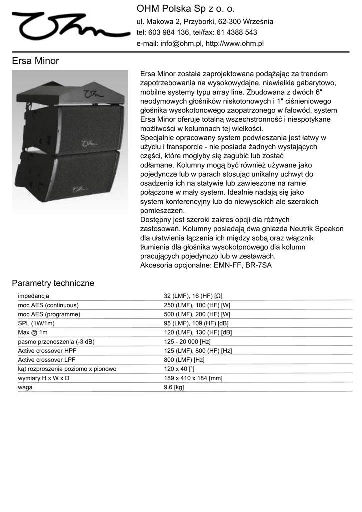 OHM Polska Sp z o. o. ul. Makowa 2, Przyborki, 62-300 Września tel: 603 984 136, tel/fax: 61 4388 543 e-mail: [email protected], http://www.ohm.pl Ersa Minor Ersa Minor została zaprojektowana podążając za trendem zapotrzebowania na wysokowydajne, niewielkie gabarytowo, mobilne systemy typu array line. Zbudowana z dwóch 6" neodymowych głośników niskotonowych i 1" ciśnieniowego głośnika wysokotonowego zaopatrzonego w falowód, system Ersa Minor oferuje totalną wszechstronność i niespotykane możliwości w kolumnach tej wielkości. Specjalnie opracowany system podwieszania jest łatwy w użyciu i transporcie - nie posiada żadnych wystających części, które mogłyby się zagubić lub zostać odłamane. Kolumny mogą być również używane jako pojedyncze lub w parach stosując unikalny uchwyt do osadzenia ich na statywie lub zawieszone na ramie połączone w mały system. Idealnie nadają się jako system konferencyjny lub do niewysokich ale szerokich pomieszczeń. Dostępny jest szeroki zakres opcji dla różnych zastosowań. Kolumny posiadają dwa gniazda Neutrik Speakon dla ułatwienia łączenia ich między sobą oraz włącznik tłumienia dla głośnika wysokotonowego dla kolumn pracujących pojedynczo lub w zestawach. Akcesoria opcjonalne: EMN-FF, BR-7SA Parametry techniczne impedancja moc AES (continuous) moc AES (programme) SPL (1W/1m) Max @ 1m pasmo przenoszenia (-3 dB) Active crossover HPF Active crossover LPF kąt rozproszenia poziomo x pionowo wymiary H x W x D waga 32 (LMF), 16 (HF) [Ω] 250 (LMF), 100 (HF) [W] 500 (LMF), 200 (HF) [W] 95 (LMF), 109 (HF) [dB] 120 (LMF), 130 (HF) [dB] 125 - 20 000 [Hz] 125 (LMF), 800 (HF) [Hz] 800 (LMF) [Hz] 120 x 40 [˚] 189 x 410 x 184 [mm] 9.6 [kg]
