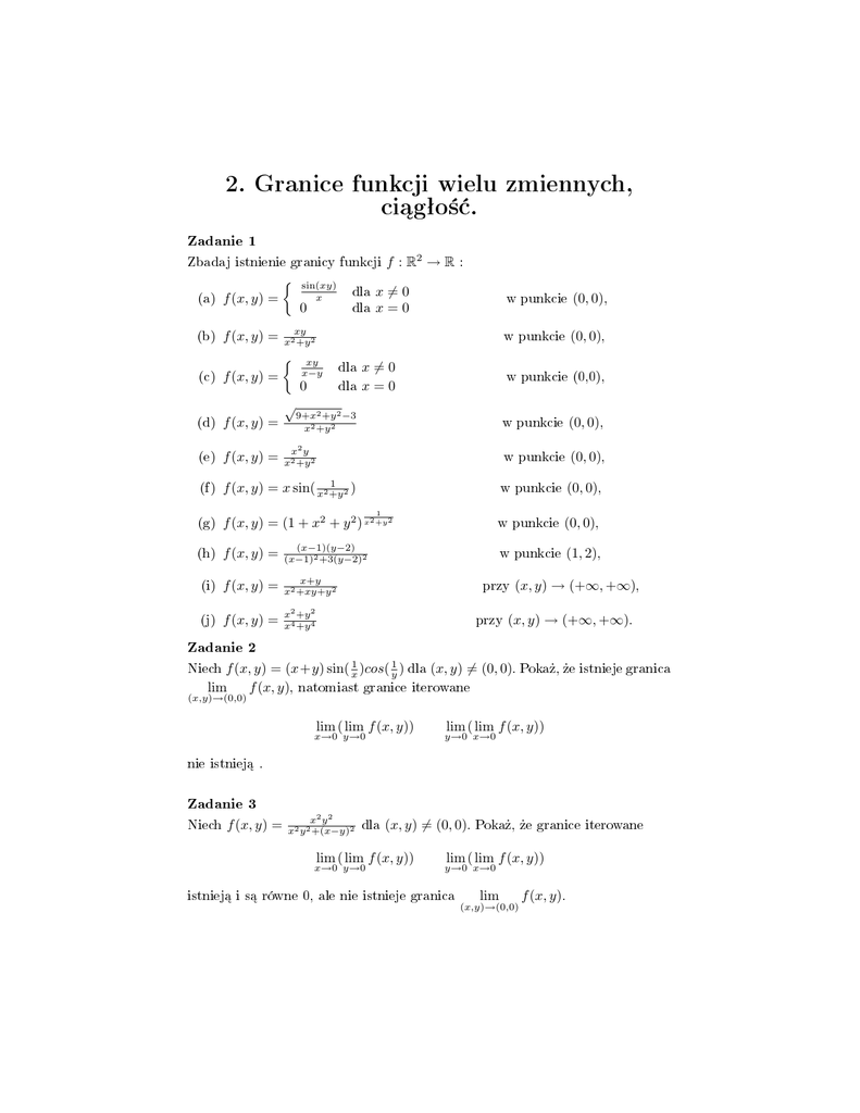 2. Granice funkcji wielu zmiennych, ci¡gªo±¢. Zadanie 1 Zbadaj istnienie granicy funkcji (a) f (x, y) = (b) f (x, y) = (c) f (x, y) = sin(xy) x 0 dla dla f : R2 → R : x 6= 0 x=0 xy x2 +y 2 √ xy x−y dla 0 dla x 6= 0 x=0 f (x, y) = (e) f (x, y) = (f ) 1 f (x, y) = x sin( x2 +y 2) (g) f (x, y) = (1 + x2 + y 2 ) x2 +y2 (h) f (x, y) = (x−1)(y−2) (x−1)2 +3(y−2)2 (i) f (x, y) = x+y x2 +xy+y 2 (j) f (x, y) = x2 +y 2 x4 +y 4 (0, 0), w punkcie (0, 0), w punkcie (0,0), 9+x2 +y 2 −3 x2 +y 2 (d) w punkcie w punkcie (0, 0), w punkcie (0, 0), x2 y x2 +y 2 1 w punkcie (0, 0), w punkcie (0, 0), w punkcie (1, 2), przy przy (x, y) → (+∞, +∞), (x, y) → (+∞, +∞). Zadanie 2 f (x, y) = (x+y) sin( x1 )cos( y1 ) dla (x, y) 6= (0, 0). Poka», »e istnieje granica lim f (x, y), natomiast granice iterowane Niech (x,y)→(0,0) lim ( lim f (x, y)) x→0 y→0 lim ( lim f (x, y)) y→0 x→0 nie istniej¡ . Zadanie 3 Niech f (x, y) = x2 y 2 x2 y 2 +(x−y)2 dla (x, y) 6= (0, 0). lim ( lim f (x, y)) x→0 y→0 Poka», »e granice iterowane lim ( lim f (x, y)) y→0 x→0 istniej¡ i s¡ równe 0, ale nie istnieje granica lim (x,y)→(0,0) f (x, y). Zadanie 4 Zbadaj ci¡gªo±¢ funkcji ( (a) f (x, y) = ( (b) f (x, y) = f : R2 → R: x2 y 2 x2 +y 2 dla 0 dla x4 −y 4 x4 +y 4 dla 0 dla (x, y) 6= (0, 0) (x, y) = (0, 0) (x, y) 6= (0, 0) (x, y) = (0, 0) Zadanie 5 Znajd¹ zbiory punktów ci¡gªo±ci funcji p x2 + y 2 f (x, y) = 2 dla dla x>0 x<0 Zadanie 6 Poka», »e funkcja f (x, y) = 2xy x2 +y 2 , dla 0, dla jest ci¡gªa jako funkcja zmiennych funkcja dwóch zmiennych. x, y x2 + y 2 = 6 0, x2 + y 2 = 0. oddzielnie, lecz nie jest ci¡gªa jako