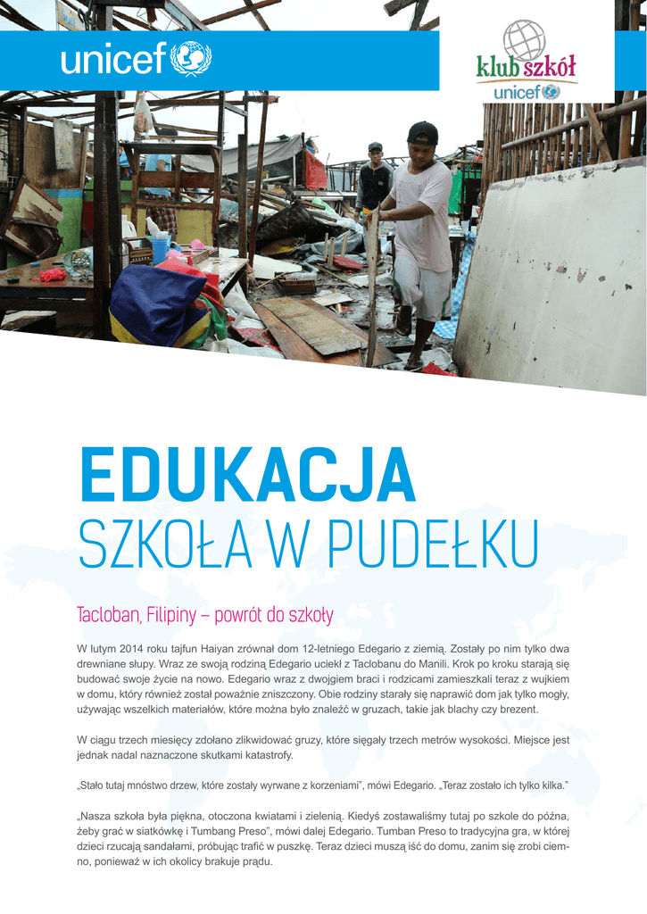 EDUKACJA SZKOŁA W PUDEŁKU Tacloban, Filipiny – powrót do szkoły W lutym 2014 roku tajfun Haiyan zrównał dom 12-letniego Edegario z ziemią. Zostały po nim tylko dwa drewniane słupy. Wraz ze swoją rodziną Edegario uciekł z Taclobanu do Manili. Krok po kroku starają się budować swoje życie na nowo. Edegario wraz z dwojgiem braci i rodzicami zamieszkali teraz z wujkiem w domu, który również został poważnie zniszczony. Obie rodziny starały się naprawić dom jak tylko mogły, używając wszelkich materiałów, które można było znaleźć w gruzach, takie jak blachy czy brezent. W ciągu trzech miesięcy zdołano zlikwidować gruzy, które sięgały trzech metrów wysokości. Miejsce jest jednak nadal naznaczone skutkami katastrofy. „Stało tutaj mnóstwo drzew, które zostały wyrwane z korzeniami”, mówi Edegario. „Teraz zostało ich tylko kilka.” „Nasza szkoła była piękna, otoczona kwiatami i zielenią. Kiedyś zostawaliśmy tutaj po szkole do późna, żeby grać w siatkówkę i Tumbang Preso”, mówi dalej Edegario. Tumban Preso to tradycyjna gra, w której dzieci rzucają sandałami, próbując trafić w puszkę. Teraz dzieci muszą iść do domu, zanim się zrobi ciemno, ponieważ w ich okolicy brakuje prądu. Edegario jest w szóstej klasie. Przed uderzeniem tajfunu chodził do szkoły podstawowej Manlurip. Jego ulubionymi przedmiotami są język angielski, matematyka i wiedza o społeczeństwie. Niedawno otworzono zamkniętą na czas odgruzowywania okolicy szkołę, jednak już nie w starym budynku. „Nasza klasa została zniszczona, tak jak większość pomieszczeń w szkole”, tłumaczy Edegario. Teraz dzieci chodzą na lekcje w namiotach postawionych przez UNICEF, która jednocześnie dostarcza materiały niezbędne do nauki. Lekcje odbywają się od poniedziałku do soboty, żeby dzieci miały szansę nadrobić materiał z ostatnich miesięcy. Setki, a nawet tysiące rodzin takich jak rodzina Edegario zostały ciężko poszkodowane przez tajfun Haiyan. Teraz starają się stanąć z powrotem na nogi. W obliczu wszystkich wyzwań, jakim muszą stawiać czoło, Edegario ma tylko jedno marzenie: „Życzę sobie, żebyśmy byli bezpieczni – teraz i w przyszłości”. Pomoc dla dzieci po przejściu cyklonu Nagris w Mjanmie Dzisiaj jest bardzo szczególny dzień w Szkole Podstawowej Auk Paing w mieście Bogalay, przez które w maju przeszedł cyklon Nagris. Każdy uczeń ma otrzymać plecak wysłany przez UNICEF, w którym znajdzie przybory do nauki, takie jak zeszyty, długopisy, ołówki, linijkę, temperówką i gumkę. Te proste narzędzia mają przywrócić codzienny rytm szkolny i być dla dzieci początkiem powrotu do równowagi po tragicznych wydarzeniach. Uczniowie ustawiają się w kolejce do pokoju nauczycielskiego razem z rodzicami. Po otrzymaniu i rozpakowaniu swojego plecaka szczęśliwe dzieci dumnie pokazują kolegom, koleżankom i rodzicom, co w nich znalazły. „Bardzo się cieszę, że dostałam ten plecak”, mówi 8-latka Cheery Soe Min, całując pudełko z kredkami. „Uwielbiam rysowanie, a teraz będę mogła rysować ryby, autobusy i jabłka!” Wsparcie UNICEF w tym regionie polegało również na naprawie i odbudowie 832 szkół oraz dystrybucji ponad 175 000 paczek z niezbędnymi przyborami do nauki. Dostarczono też blaszane dachy, meble szkolne, paczki z książkami i tzw. Szkołę w pudełku. „Nie stać mnie na kupno przyborów szkolnych dla moich dzieci, dlatego jestem bardzo wdzięczna za pomoc UNICEF”, mówi Pa-le Oo, 39-letnia matka. Konsekwencje cyklonu będą odczuwalne przez następnych kilka lat. Nawet przed katastrofą szkoła Auk Paing miała ogromne problemy z zapewnieniem swoim uczniom dobrych warunków do nauki. Przejście cyklonu tym bardziej utrudniło to zadanie. Od tego czasu w szkole nie ma prądu, a klasy są zupełnie ciemne. Działają tylko trzy toalety, które nie są wystarczające jak na tak dużą liczbę uczniów – jest ich 619. W szkole nie ma również sali gimnastycznej, więc nauczyciele zabierają dzieci na zewnątrz w ramach zajęć z wychowania fizycznego, oczywiście tylko kiedy warunki pogodowe na to pozwalają. Przez ostatnie 6 miesięcy zajęcia te nie mogły się jednak odbyć ze względu na porę monsunową. Szkoła w pudełku – jest to pudełko, w którym znajdują się wszystkie potrzebne do prowadzenia lekcji przybory szkolne: kreda, książki, ołówki, gumki, długopisy, linijki, ekierki, globusy, nożyczki, a nawet tablica i zasilane energią słoneczną radio. W ten sposób od 20 lat UNICEF pomaga szkołom, które straciły niezbędne do prowadzenia lekcji przybory w wyniku klęski żywiołowej lub konfliktu. • W 2014 roku UNICEF zebrał 63 milionów dolarów na zagwarantowanie edukacji dzieciom na świecie. • W 2015 roku UNICEF dostarczył 51 647 zestawów z przyborami szkolnymi dla klas, 55 293 zestawów materiałów przeznaczonych do nauki i 38 400 zestawów do zabawy dla dzieci. • Początkowo, jedno pudełko było przeznaczone dla 80 dzieci w jednej klasie. 7 lat temu zostało zmienione tak, aby zaspokajało potrzeby 40 dzieci. Każde dziecko otrzymuje własny zeszyt, tabliczkę, długopis, ołówek i inne podstawowe narzędzia do nauki.