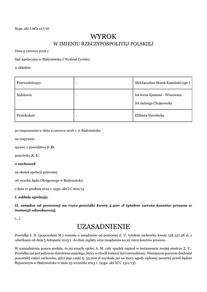 Sygn. akt I ACa 127/16 WYROK W IMIENIU RZECZYPOSPOLITEJ POLSKIEJ Dnia 9 czerwca 2016 r. Sąd Apelacyjny w Białymstoku I Wydział Cywilny w składzie: Przewodniczący : SSA Jarosław Marek Kamiński (spr.) Sędziowie : SA Irena Ejsmont - Wiszowata SA Jadwiga Chojnowska Protokolant : Elżbieta Niewińska po rozpoznaniu w dniu 9 czerwca 2016 r. w Białymstoku na rozprawie sprawy z powództwa I. D. przeciwko Z. U. o zachowek na skutek apelacji pozwanej od wyroku Sądu Okręgowego w Białymstoku z dnia 21 grudnia 2015 r. sygn. akt I C 600/15 I. oddala apelację; II. zasądza od pozwanej na rzecz powódki kwotę 5.400 zł tytułem zwrotu kosztów procesu w instancji odwoławczej. (...) UZASADNIENIE Powódka I. D. (poprzednio M.) wniosła o zasądzenie od pozwanej Z. U. tytułem zachowku kwoty 158.357,58 zł, z odsetkami od dnia 5 listopada 2013 r. do dnia zapłaty oraz zasądzenia na jej rzecz kosztów procesu. W uzasadnieniu pozwu podała, że jej zmarły ojciec A. M. cały spadek zapisał w testamencie swojej siostrze Z. U.. Powódka zaś jest jedynym dzieckiem zmarłego, który w chwili śmierci był rozwiedziony. Niniejszym pozwem dochodzi pozostałej części zachowku, gdyż jego część tj. 35.000 zł uzyskała już na mocy ugody sądowej zawartej przed Sądem Rejonowym w Białymstoku w dniu 23 września 2013 r. (sygn. akt XI C 1311/13). Pozwana wniosła o oddalenie powództwa, z uwagi na powagę rzeczy ugodzonej oraz o zasądzenie kosztów procesu. Podnosiła, że podstawa faktyczna żądania powódki jest identyczna z podstawą faktyczną roszczenia w sprawie o sygn. akt XI C 1311/13, w której zawarto ugodę. Ponadto twierdziła, że dochodzone roszczenie powinno zostać oddalone, z uwagi na naganne zachowanie powódki w stosunku do zmarłego ojca (art. 5 k.c.). Wyrokiem z dnia 3 lutego 2014 r. Sąd Okręgowy oddalił powództwo oraz zasądził od powódki na rzecz pozwanej koszty zastępstwa procesowego. Sąd ten uznał, że zawarcie ugody sądowej w sprawie o zachowek przed Sądem Rejonowym spowodowało wygaśnięcie roszczenia o pozostałą część zachowku – w sytuacji, gdy wskazana i ustalona masa spadkowa była identyczna. Sąd Apelacyjny w Białymstoku wyrokiem z dnia 30 października 2014 r. uchylił ten wyrok i sprawę przekazał do ponownego rozpoznania Sądowi Okręgowemu, pozostawiając temu Sądowi orzeczenie o kosztach II instancji. W uzasadnieniu orzeczenia Sąd Apelacyjny wskazał, iż osnowa ugody, jak i przywoływane przez strony okoliczności jej zawarcia, uzasadniały odmienną ocenę prawną jej skutków od przyjętej przez Sąd I instancji. Sąd II instancji podkreślił, iż pozwana była świadoma tego, że żądanie zapłaty kwoty 50.000 zł obejmuje jedynie część wierzytelności powódki z tytułu zachowku. Rozpoczęte postępowanie dowodowe zmierzało do wykazywania, czy powódce należy się zachowek, a jeżeli tak, to w jakiej wysokości. Strony postanowiły zlikwidować spór co do wierzytelności objętej postępowaniem sądowym, czyniąc sobie wzajemnie ustępstwa – w odniesieniu do żądanej pozwem kwoty. Zdaniem Sądu Apelacyjnego, dowodzi tego ostatnie zdanie osnowy ugody wciągniętej do protokołu. Zawarcie ugody i jej wykonanie skutkowało wygaśnięciem wierzytelności o zachowek jedynie w wysokości 50.000 zł. Wierzytelność o zachowek w ugodzonej wysokości nie jest przedmiotem niniejszego postępowania. W ocenie Sądu Apelacyjnego, nie zachodziły zatem podstawy do oddalenia powództwa, z powołaniem się na uwzględnienie zarzutu powagi rzeczy ugodzonej. Dokonanie odmiennej – niż przyjęta przez Sąd Okręgowy – oceny prawnej konsekwencji zawartej przez strony ugody, wywarło taki skutek, że zbadanie zasadności roszczenia wymagało ponownego rozpoznania sprawy, to jest przeprowadzenia postępowania dowodowego w całości, dokonania pełnych ustaleń stanu faktycznego w oparciu o wyniki tego postępowania i ostatecznej oceny prawnej. Sąd Najwyższy postanowieniem z dnia 25 lutego 2015 r. oddalił zażalenie pozwanej wniesione od powyższego orzeczenia, pozostawiając temu Sądowi rozstrzygnięcie o kosztach postępowania zażaleniowego w orzeczeniu kończącym sprawę w instancji; stwierdzając w uzasadnieniu, że istotnie, jak orzekł Sąd Apelacyjny, niezbędne jest przeprowadzenie postępowania dowodowego w całości i poddanie na nowo ocenie materiału dowodowego. Po ponownym rozpoznaniu sprawy, Sąd Okręgowy w Białymstoku wyrokiem z dnia 21 grudnia 2015 r. zasądził od pozwanej na rzecz powódki kwotę 151.825,47 zł z 13% odsetek w stosunku rocznym od dnia 5 listopada 2013 r. do dnia 16 grudnia 2014 r. i z 8% odsetek w stosunku rocznym od dnia 17 grudnia 2014 r. do dnia zapłaty; oddalił powództwo w pozostałej części; zasądził od pozwanej na rzecz powódki kwotę 8.117 zł tytułem zwrotu kosztów zastępstwa procesowego oraz 17.274,65 zł tytułem zwrotu poniesionych opłat sądowych i zwrotu zaliczki na wydatek; zwrócił powódce od Skarbu Państwa – Sądu Okręgowego w Białymstoku kwotę 61,65 zł niewykorzystanej części zaliczki. Z ustaleń tego Sądu wynika, że powódka I. D. z domu M. jest jedyną córką A. M., który zmarł (...)Powódka urodziła się w dniu (...) jako dziecko z małżeństwa zmarłego A. M. i M. H.. Małżeństwo to zostało rozwiązane przez rozwód wyrokiem Sądu Rejonowego w Białymstoku z dnia 30 sierpnia 1984 r. z wyłącznej winy A. M.. Wyrokiem tym podzielono mieszkanie zajmowane przez A. M. i jego żonę w ten sposób, że jemu przyznano do wyłącznego użytkowania mniejszy pokój, żonie i małoletniej wówczas córce stron – większy pokój, zaś kuchnię, łazienkę i przedpokój do wspólnego użytkowania. Po rozwodzie A. M., w okresie od sierpnia 1984 r. do 23 marca 1987 r., źle zachowywał się wobec żony, przez to, że używał wobec niej gazu łzawiącego, wyzywał ją słowami obelżywymi, nie wpuszczał do mieszkania, uniemożliwiał korzystanie z ener
