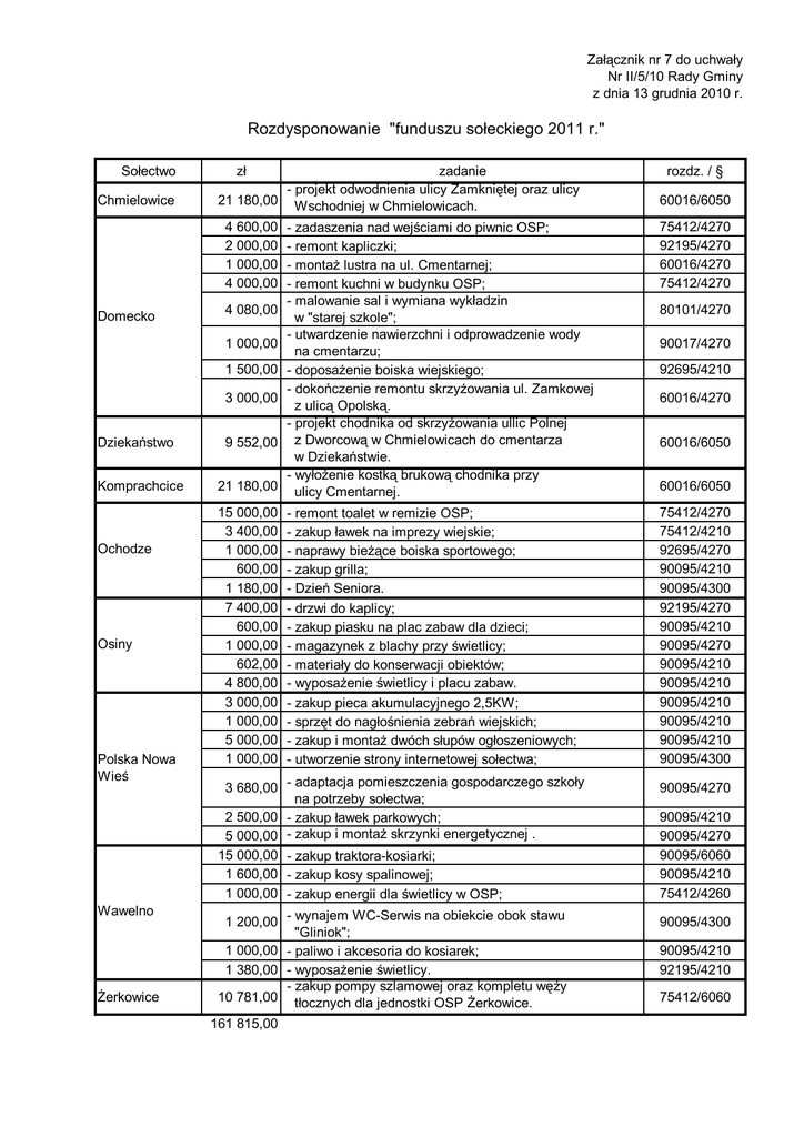 Załącznik nr 7 do uchwały Nr II/5/10 Rady Gminy z dnia 13 grudnia 2010 r. Rozdysponowanie "funduszu sołeckiego 2011 r." Sołectwo Chmielowice zł zadanie - projekt odwodnienia ulicy Zamkniętej oraz ulicy 21 180,00 Wschodniej w Chmielowicach. 4 600,00 2 000,00 1 000,00 4 000,00 Domecko 75412/4270 92195/4270 60016/4270 75412/4270 21 180,00 15 000,00 3 400,00 1 000,00 600,00 1 180,00 7 400,00 600,00 1 000,00 602,00 4 800,00 3 000,00 1 000,00 5 000,00 1 000,00 - remont toalet w remizie OSP; - zakup ławek na imprezy wiejskie; - naprawy bieżące boiska sportowego; - zakup grilla; - Dzień Seniora. - drzwi do kaplicy; - zakup piasku na plac zabaw dla dzieci; - magazynek z blachy przy świetlicy; - materiały do konserwacji obiektów; - wyposażenie świetlicy i placu zabaw. - zakup pieca akumulacyjnego 2,5KW; - sprzęt do nagłośnienia zebrań wiejskich; - zakup i montaż dwóch słupów ogłoszeniowych; - utworzenie strony internetowej sołectwa; 75412/4270 75412/4210 92695/4270 90095/4210 90095/4300 92195/4270 90095/4210 90095/4270 90095/4210 90095/4210 90095/4210 90095/4210 90095/4210 90095/4300 4 080,00 1 500,00 3 000,00 Komprachcice Ochodze Osiny Polska Nowa Wieś 9 552,00 3 680,00 - adaptacja pomieszczenia gospodarczego szkoły na potrzeby sołectwa; 2 500,00 - zakup ławek parkowych; 5 000,00 - zakup i montaż skrzynki energetycznej . 15 000,00 - zakup traktora-kosiarki; 1 600,00 - zakup kosy spalinowej; 1 000,00 - zakup energii dla świetlicy w OSP; Wawelno Żerkowice 60016/6050 - zadaszenia nad wejściami do piwnic OSP; - remont kapliczki; - montaż lustra na ul. Cmentarnej; - remont kuchni w budynku OSP; - malowanie sal i wymiana wykładzin w "starej szkole"; - utwardzenie nawierzchni i odprowadzenie wody na cmentarzu; - doposażenie boiska wiejskiego; - dokończenie remontu skrzyżowania ul. Zamkowej z ulicą Opolską. - projekt chodnika od skrzyżowania ullic Polnej z Dworcową w Chmielowicach do cmentarza w Dziekaństwie. - wyłożenie kostką brukową chodnika przy ulicy Cmentarnej. 1 000,00 Dziekaństwo rozdz. / § 1 200,00 - wynajem WC-Serwis na obiekcie obok stawu "Gliniok"; 1 000,00 - paliwo i akcesoria do kosiarek; 1 380,00 - wyposażenie świetlicy. - zakup pompy szlamowej oraz kompletu węży 10 781,00 tłocznych dla jednostki OSP Żerkowice. 161 815,00 80101/4270 90017/4270 92695/4210 60016/4270 60016/6050 60016/6050 90095/4270 90095/4210 90095/4270 90095/6060 90095/4210 75412/4260 90095/4300 90095/4210 92195/4210 75412/6060