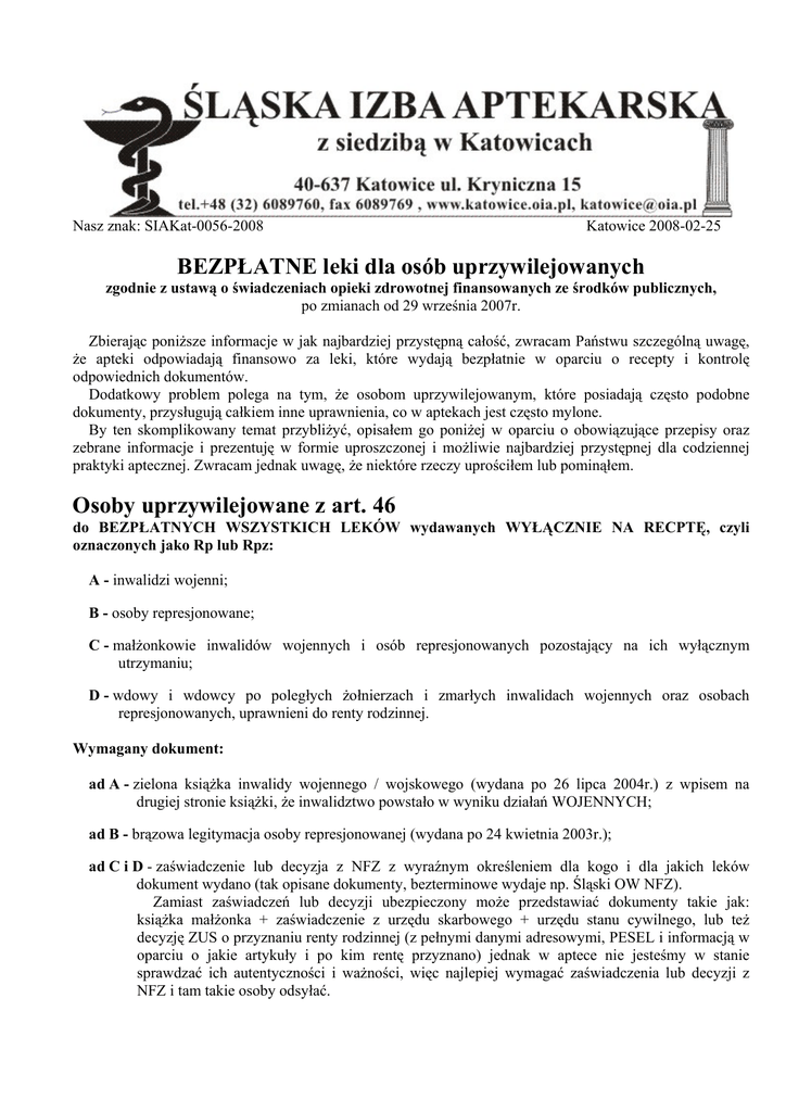Nasz znak: SIAKat-0056-2008 Katowice 2008-02-25 BEZPŁATNE leki dla osób uprzywilejowanych zgodnie z ustawą o świadczeniach opieki zdrowotnej finansowanych ze środków publicznych, po zmianach od 29 września 2007r. Zbierając poniższe informacje w jak najbardziej przystępną całość, zwracam Państwu szczególną uwagę, że apteki odpowiadają finansowo za leki, które wydają bezpłatnie w oparciu o recepty i kontrolę odpowiednich dokumentów. Dodatkowy problem polega na tym, że osobom uprzywilejowanym, które posiadają często podobne dokumenty, przysługują całkiem inne uprawnienia, co w aptekach jest często mylone. By ten skomplikowany temat przybliżyć, opisałem go poniżej w oparciu o obowiązujące przepisy oraz zebrane informacje i prezentuję w formie uproszczonej i możliwie najbardziej przystępnej dla codziennej praktyki aptecznej. Zwracam jednak uwagę, że niektóre rzeczy uprościłem lub pominąłem. Osoby uprzywilejowane z art. 46 do BEZPŁATNYCH WSZYSTKICH LEKÓW wydawanych WYŁĄCZNIE NA RECPTĘ, czyli oznaczonych jako Rp lub Rpz: A - inwalidzi wojenni; B - osoby represjonowane; C - małżonkowie inwalidów wojennych i osób represjonowanych pozostający na ich wyłącznym utrzymaniu; D - wdowy i wdowcy po poległych żołnierzach i zmarłych inwalidach wojennych oraz osobach represjonowanych, uprawnieni do renty rodzinnej. Wymagany dokument: ad A - zielona książka inwalidy wojennego / wojskowego (wydana po 26 lipca 2004r.) z wpisem na drugiej stronie książki, że inwalidztwo powstało w wyniku działań WOJENNYCH; ad B - brązowa legitymacja osoby represjonowanej (wydana po 24 kwietnia 2003r.); ad C i D - zaświadczenie lub decyzja z NFZ z wyraźnym określeniem dla kogo i dla jakich leków dokument wydano (tak opisane dokumenty, bezterminowe wydaje np. Śląski OW NFZ). Zamiast zaświadczeń lub decyzji ubezpieczony może przedstawiać dokumenty takie jak: książka małżonka + zaświadczenie z urzędu skarbowego + urzędu stanu cywilnego, lub też decyzję ZUS o przyznaniu renty rodzinnej (z pełnymi danymi adresowymi, PESEL i informacją w oparciu o jakie artykuły i po kim rentę przyznano) jednak w aptece nie jesteśmy w stanie sprawdzać ich autentyczności i ważności, więc najlepiej wymagać zaświadczenia lub decyzji z NFZ i tam takie osoby odsyłać. UWAGA BARDZO WAŻNE ! Inwalidzi wojenni i wojskowi mają jedną, taką samą książkę (w której ZUS często niestety nie wykreśla odpowiedniego słowa „wojenny” czy „wojskowy”) i o tym, czy jest to inwalida wojenny (wszystkie leki bezpłatne) czy wojskowy lub osoba np. uprzywilejowana z art. 42 czy 59 (bezpłatne tylko leki podstawowe i uzupełniające) decyduje wpis na innej stronie książki! Jeżeli apteka wydaje bezpłatnie leki nie zwracając uwagi, czy jest to inwalida wojenny, czy wojskowy, czy inna osoba uprzywilejowana, poprzez sprawdzenie kolejnych stron książki, to może wydawać bezpłatnie leki nie przysługujące danej osobie i narażać się na konieczność zwrotu refundacji. ************************************************* Osoby uprzywilejowane z art. 45 do BEZPŁATNYCH leków PODSTAWOWYCH i UZUPEŁNIAJĄCYCH DO WYSOKOŚCI LIMITU: E - inwalidzi wojskowi; F - osoby wymienionym w art. 42 i 59 ustawy z dnia 29 maja 1974 r. o zaopatrzeniu inwalidów wojennych i wojskowych oraz ich rodzin; G - osoby, które doznały uszczerbku na zdrowiu w okolicznościach określonych w art. 7 i 8 ustawy z dnia 29 maja 1974 r. o zaopatrzeniu inwalidów wojennych i wojskowych oraz ich rodzin i nie zostały zaliczone do żadnej z grup inwalidów; H - osoby, które są cywilnymi niewidomymi ofiarami działań wojennych. Wymagany dokument: ad E - zielona książka inwalidy wojennego / wojskowego (wydana po 26 lipca 2004r.) z wpisem na drugiej stronie książki, że inwalidztwo powstało w wyniku działań WOJSKOWYCH; ad F – książka jak wyżej ale z wpisem na drugiej stronie, że jest to osoba uprzywilejowana z art. 42 lub 59; ad G - książka jak wyżej ale z wpisem na szóstej stronie o wyciągu z orzeczenia o uszczerbku na zdrowiu; ad H – brązowa legitymacja cywilnej niewidomej ofiary działań wojennych. ************************************************* Osoby uprzywilejowane z art. 43 do BEZPŁATNYCH leków PODSTAWOWYCH i UZUPEŁNIAJĄCYCH DO WYSOKOŚCI LIMITU: I - osoby ubezpieczone, które posiadają tytuł „Zasłużonego Honorowego Dawcy Krwi” lub „Zasłużonego Dawcy Przeszczepu”. Wymagany dokument: ad I - legitymacja „Zasłużonego Honorowego Dawcy Krwi” lub „Zasłużonego Dawcy Przeszczepu” Osoby uprzywilejowane z art. 44 do BEZPŁATNYCH RECEPTUROWYCH: leków PODSTAWOWYCH i UZUPEŁNIAJĄCYCH oraz J - żołnierze odbywający zasadniczą służbę wojskową, przeszkolenie wojskowe, ćwiczenia wojskowe, o ile nie podlegają obowiązkowi ubezpieczenia z innego tytułu, oraz pełniący służbę wojskową w razie ogłoszenia mobilizacji i w czasie wojny, a także kandydaci na żołnierzy zawodowych; Wymagany dokument: ad J - zielona książeczka wojskowa – z której wynika, że właśnie jest ważna. ************************************************* Dodatkowe informacje K - Pacjenci podlegający pod powyższe artykuły i realizujący recepty na leki, muszą posiadać wymienione dokumenty, które potwierdzają ich uprawnienia. L - Pracownik apteki realizujący receptę może na podstawie odpowiednich dokumentów wpisać na receptę uprawnienia pacjenta, jeżeli lekarz nie zrobił tego wcześniej, i potwierdzić te uprawnienia swoim podpisem (zalecam także imienną pieczątkę). Ł – Realizujący receptę w aptece ma obowiązek odnotować na rewersie recepty numer i rodzaj takiego dokumentu (zalecam dodatkowo podpis i pieczątkę). M - Prawo do korzystania bez kolejki z usług farmaceutycznych w aptekach posiadają inwalidzi wojenni, wojskowi, kombatanci, zasłużeni honorowi dawcy krwi i zasłużeni dawcy organów do przeszczepów. N – Choć lekarz