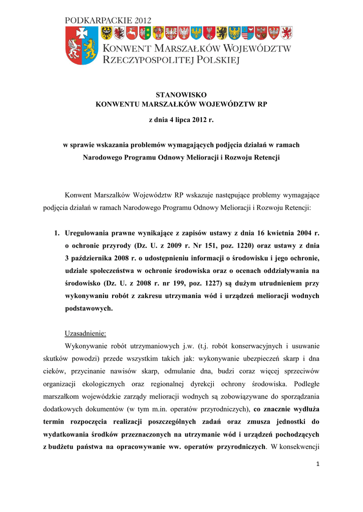 STANOWISKO KONWENTU MARSZAŁKÓW WOJEWÓDZTW RP z dnia 4 lipca 2012 r. w sprawie wskazania problemów wymagających podjęcia działań w ramach Narodowego Programu Odnowy Melioracji i Rozwoju Retencji Konwent Marszalków Województw RP wskazuje następujące problemy wymagające podjęcia działań w ramach Narodowego Programu Odnowy Melioracji i Rozwoju Retencji: 1. Uregulowania prawne wynikające z zapisów ustawy z dnia 16 kwietnia 2004 r. o ochronie przyrody (Dz. U. z 2009 r. Nr 151, poz. 1220) oraz ustawy z dnia 3 października 2008 r. o udostępnieniu informacji o środowisku i jego ochronie, udziale społeczeństwa w ochronie środowiska oraz o ocenach oddziaływania na środowisko (Dz. U. z 2008 r. nr 199, poz. 1227) są dużym utrudnieniem przy wykonywaniu robót z zakresu utrzymania wód i urządzeń melioracji wodnych podstawowych. Uzasadnienie: Wykonywanie robót utrzymaniowych j.w. (t.j. robót konserwacyjnych i usuwanie skutków powodzi) przede wszystkim takich jak: wykonywanie ubezpieczeń skarp i dna cieków, przycinanie nawisów skarp, odmulanie dna, budzi coraz więcej sprzeciwów organizacji ekologicznych oraz regionalnej dyrekcji ochrony środowiska. Podległe marszałkom wojewódzkie zarządy melioracji wodnych są zobowiązywane do sporządzania dodatkowych dokumentów (w tym m.in. operatów przyrodniczych), co znacznie wydłuża termin rozpoczęcia realizacji poszczególnych zadań oraz zmusza jednostki do wydatkowania środków przeznaczonych na utrzymanie wód i urządzeń pochodzących z budżetu państwa na opracowywanie ww. operatów przyrodniczych. W konsekwencji 1 powyższego nie jest możliwe zrealizowanie (począwszy od dokonania wymaganych uzgodnień, w tym m.in. z RDOŚ, poprzez wykonanie dokumentacji technicznej i wykonanie robót) znacznej części zadań w danym roku budżetowym. Proponuje się opracowanie na etapie zmian ustawy Prawo wodne definicji robót utrzymaniowych i ich katalogu, dla których nie trzeba by opracowywać ocen lub raportów oddziaływania na środowisko. 2. Pogłębiający się problem degradacji urządzeń melioracji wodnych szczegółowych wynikający m.in. z zapisów art. 77, art. 178 oraz art. 164 ustawy dnia 18 lipca 2001 r. Prawo wodne. Uzasadnienie: Zgodnie z art. 77 ust. 1 ww. ustawy ustawodawca nakłada obowiązek utrzymania urządzeń melioracji wodnych szczegółowych na zainteresowanych właścicieli gruntów lub w przypadku, gdy urządzenia te są objęte działalnością spółki wodnej - na tą spółkę. W tym samym art. 77 ust. 2 obowiązek egzekwowania zapisów ust. 1 został nałożony na starostę. W art. 178 ustawodawca przydziela nadzór nad działalnością spółek wodnych staroście, a w art. 164 ust. 9 nadzór nad działalnością rejonowych związków spółek wodnych przydziela marszałkowi. Biorąc powyższe pod uwagę zasadnym wydaje się przekazanie wszelkich kompetencji dotyczących urządzeń melioracji wodnych szczegółowych oraz spółek wodnych jednemu organowi samorządu gminnego t.j. wójtowi, burmistrzowi lub prezydentowi miasta. 3. Błędne przypisanie gruntów pod rowami w ewidencji gruntów i budynków prowadzonej przez starostwa na marszałków województw lub na jednostki organizacyjne podległe marszałkom tj. wojewódzkie zarządy melioracji. Uzasadnienie: Stosownie do przepisu art. 12 ust.1 Prawa wodnego, wody w rowach znajdujące się w granicach nieruchomości gruntowej, stanowią własność właściciela tej nieruchomości. Wody te mogą zatem stanowić własność osób prywatnych lub fizycznych, ale także Skarbu Państwa. Nie mogą jednak być w zarządzie marszałków województw lub podległych im wojewódzkim zarządom melioracji. 2 Przypisanie zarządu/władania gruntów pod rowami wojewódzkim zarządom melioracji jest nagminne i stanowi problem w skali kraju. Przy składaniu wniosków do starostw o sprostowanie błędnych zapisów j.w. starostwa w celu wprowadzenia zmian w ewidencji żądają stosownych dokumentów, będących podstawą dokonania sprostowania. Nie wskazują jednak jakie to mają być dokumenty. Zarządy melioracji nie posiadają wiedzy na jakiej podstawie zostały dokonane obecne, nieprawidłowe zapisy, w związku z czym wnioski pozostają bez rozpatrzenia. Na dzień dzisiejszy nie istnieje więc jednoznaczny mechanizm prawny pozwalający na dokonanie korekt w tym zakresie. 4. Ustawa z dnia 08-07-2010 r. o szczególnych zasadach przygotowania do realizacji inwestycji przeciwpowodziowych (tzw. specustawa) nie obejmuje całego procesu przygotowania do realizacji inwestycji z zakresu ochrony przeciwpowodziowej. Jedną decyzją (wydawaną przez Wojewodę) objęty jest jedynie etap ustalenia lokalizacji, wywłaszczeń nieruchomości i zatwierdzenia projektu. Uzasadnienie: Głównym założeniem przytoczonej wyżej ustawy miało być usprawnienie i przyspieszenie cyklu realizacji zadań z zakresu ochrony przeciwpowodziowej. Jak wynika z dotychczasowych, niemal dwuletnich doświadczeń, proces inwestycyjny nie został jednak przyspieszony dzięki tej zmianie legislacyjnej. Inwestor jest bowiem w dalszym ciągu zobowiązany, przed wydaniem pozwolenia na realizację w trybie ww. ustawy, uzyskać m.in. decyzję o środowiskowych uwarunkowaniach zgody na realizację oraz pozwolenie wodno prawne. W związku z tym faktem odwołania stron postępowania od ww. pozwoleń w dalszym ciągu mogą zablokować otrzymanie ostatecznej decyzji umożliwiającej wykonanie robót budowlano montażowych. Dodatkowo podczas realizacji inwestycji liniowych (m.in. budowy wałów, regulacji rzek) bardzo często zachodzi potrzeba przebudowy istniejących kolizji z infrastrukturą techniczną (drogi, kanalizacje, sieci wodociągowe linie energetyczne i teletechniczne). Art. 9 p. 8 e) wspomnianej wyżej ustawy nie włącza jednak w sposób jednoznaczny tych kolizji w zakres pozwolenia na realizację, w związku z czym Inwestor jest zmuszony do opracowania dodatkowych projektów branżowy