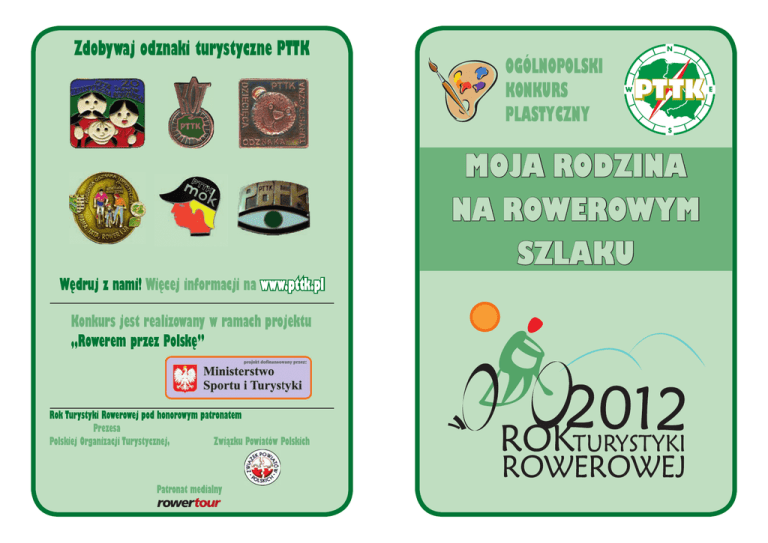 Zdobywaj odznaki turystyczne PTTK OGÓLNOPOLSKI KONKURS PLASTYCZNY MOJA RODZINA NA ROWEROWYM SZLAKU Wędruj z nami! Więcej informacji na www.pttk.pl Konkurs jest realizowany w ramach projektu „Rowerem przez Polskę” Rok Turystyki Rowerowej pod honorowym patronatem Prezesa Polskiej Organizacji Turystycznej, Związku Powiatów Polskich Patronat medialny REGULAMIN OGÓLNOPOLSKIEGO KONKURSU PLASTYCZNEGO „Moja rodzina na rowerowym szlaku” organizowanego przez Polskie Towarzystwo Turystyczno-Krajoznawcze w 2012 roku w ramach „Roku Turystyki Rowerowej” 4. 5. Wspólne rodzinne uprawianie turystyki, rekreacji i sportu oprócz troski o zdrowie i kondycję fizyczną, ściśle wiąże się z budowaniem i wzmacnianiem więzi w rodzinie, pogłębianiem wzajemnych relacji oraz kształtowaniem cech i postaw pożądanych w życiu rodzinnym i społecznym. Szczególną formą aktywności ruchowej, w której mogą uczestniczyć całe rodziny jest turystyka rowerowa proponowana przez nasze Towarzystwo. I. Informacje ogólne 1. Organizatorzy: Komisja Środowiskowa ZG PTTK we współpracy z Komisją Turystyki Kolarskiej ZG PTTK. Spółdzielnia Mieszkaniowa „Oskard” w Tychach. Patronat prasowy: „Gościniec” – kwartalnik ZG PTTK 2. W konkursie mogą brać udział dzieci i młodzież w trzech kategoriach wiekowych: – I kategoria – przedszkola, – II kategoria – szkoły podstawowe, – III kategoria – gimnazja. szlaku” który proponujemy dzieciom i młodzieży jest przed3. Tematem konkursu „Moja rodzina na rowerowym szlaku”, stawienie scen rodzajowych z motywem roweru związanych ze spędzaniem wolnego czasu w sposób aktywny, na rowerze, w gronie rodziny i przyjaciół ze szczególnym uwzględnieniem wartości i piękna otaczającej nas przyrody. 4. W konkursie nie ma podziału na kategorie tematyczne. 5. Celem konkursu jest: – podkreślenie znaczenia rodziny w kształtowaniu osobowości dziecka poprzez wspólne spędzanie wolnego czasu w sposób aktywny, na rowerze, – uwrażliwianie dzieci na piękno przyrody, – kształtowanie prozdrowotnego stylu życia, – pobudzanie dziecięcej wyobraźni plastycznej oraz prezentacja możliwości twórczych dzieci w dziedzinie plastyki. II. Warunki uczestnictwa 1. Każdy uczestnik konkursu (szkoła, placówka i inne instytucje) może przesłać na konkurs maksymalnie 5 prac. 2. Prace w formacie A-3 wykonane dowolną techniką tj. farbami akwarelowymi, plakatowymi, pastelami olejnymi, wyklejane z kolorowego papieru czy materiału. 3. Na odwrocie każdej pracy prosimy o podanie danych autora i placówki czy instytucji: imienia i nazwiska, ka- 6. 7. 8. tegorii, adresu prywatnego i kontaktowego numeru telefonu oraz adresu i numeru telefonu koła czy oddziału PTTK lub placówki oświatowo-kulturalnej, szkoły czy instytucji, a także imię i nazwisko jednego opiekuna oraz numer telefonu i adres e-mail. Opis prac powinien być wykonany w formie wydrukowanej metryczki lub wyraźnie zapisany drukowanymi literami. Prace opisane inaczej nie będą uczestniczyć w konkursie. Prace należy przesłać w opakowaniu zapewniającym bezpieczne dotarcie przesyłki na adres: Zarząd Główny PTTK, ul. Senatorska 11, 00-075 Warszawa z dopiskiem – Konkurs plastyczny „Moja rodzina na rowerowym szlaku” do dnia 10 października 2012 roku (decyduje data stempla pocztowego). Organizatorzy nie ponoszą odpowiedzialności za uszkodzenia powstałe w trakcie przesyłania pracy. Przesłane prace przechodzą na własność organizatora i nie będą zwracane. Redakcja „Gościńca” zastrzega sobie prawo do bezpłatnej publikacji wybranych prac konkursowych. III. Ocena prac. Nagrody 1. Oceny zdjęć dokona jury powołane przez organizatora. Decyzje jury są ostateczne. 2. Dla zwycięzców konkursu przewiduje się nagrody i wyróżnienia: – za zajęcie miejsc I autorzy otrzymują nagrodę w postaci pobytu w wybranym schronisku lub stanicy wodnej PTTK w uzgodnionym terminie dla rodziny 3 osobowej (1 nocleg + śniadanie) ufundowaną przez Zarząd Majątkiem PTTK oraz nagrodę rzeczową i pamiątkowy dyplom, – za zajęcie miejsc od II do IV przyznane zostaną atrakcyjne nagrody rzeczowe i pamiątkowe dyplomy, – przewiduje się również przyznanie wyróżnień dla opiekunów laureatów konkursu. 3. Jury może dokonać zmian w podziale nagród, bądź też nie przyznać głównej nagrody. 4. Jury dopuszcza możliwość przyznania nagród specjalnych. 5. Wyniki konkursu zostaną podane na stronie internetowej organizatora konkursu. 6. Wszyscy laureaci zostaną powiadomieni o werdykcie jury drogą mailową. 7. Nagrodzone i zakwalifikowane prace stworzą wystawę pokonkursową. 8. Nadesłanie prac oznacza akceptację warunków konkursu i regulaminu, którego ostateczna interpretacja należy do organizatorów konkursu. 9. Udział w konkursie jest jednoznaczny z udzieleniem prawa do nieodpłatnego wykorzystywania prac dla promocji konkursu w następujących polach eksploatacji: druku w dowolnej liczbie publikacji i w dowolnym nakładzie, używania ich w internecie oraz w innych formach utrwaleń nadających się do rozpowszechniania. 10. Udział w konkursie jest równoznaczny z wyrażeniem przez osoby uczestniczące zgody na przetwarzanie przez organizatora ich danych osobowych na potrzeby konkursu (ust. o ochronie danych osobowych z dn. 29.08.1997 r. Dz. U. Nr 133 poz. 833 z póź. zm.). IV. Terminarz konkursu 1. Termin rozstrzygnięcia konkursu do 31 października 2012 r. 2. Przewidywany termin spotkania laureatów, wręczenie nagród oraz otwarcie wystawy pokonkursowej: 17 listopada 2012 roku – Warszawa – Muzeum Sportu i Turystyki. Z turystycznymi pozdrowieniami Organizatorzy