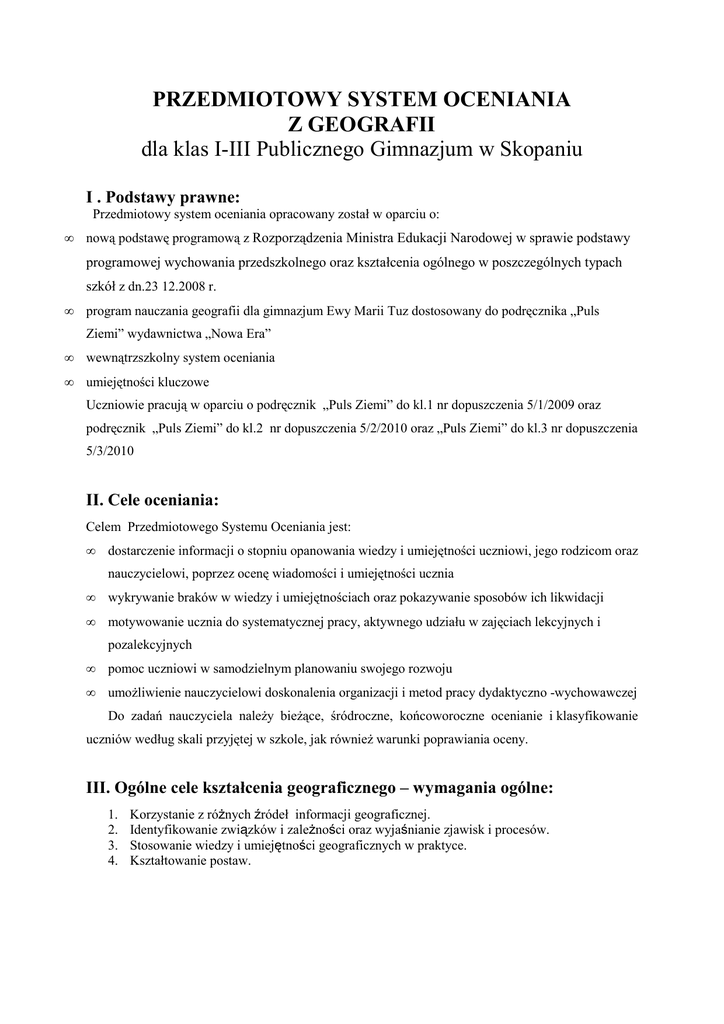 PRZEDMIOTOWY SYSTEM OCENIANIA Z GEOGRAFII dla klas I-III Publicznego Gimnazjum w Skopaniu I . Podstawy prawne: Przedmiotowy system oceniania opracowany został w oparciu o: • nową podstawę programową z Rozporządzenia Ministra Edukacji Narodowej w sprawie podstawy programowej wychowania przedszkolnego oraz kształcenia ogólnego w poszczególnych typach szkół z dn.23 12.2008 r. • program nauczania geografii dla gimnazjum Ewy Marii Tuz dostosowany do podręcznika „Puls Ziemi” wydawnictwa „Nowa Era” • wewnątrzszkolny system oceniania • umiejętności kluczowe Uczniowie pracują w oparciu o podręcznik „Puls Ziemi” do kl.1 nr dopuszczenia 5/1/2009 oraz podręcznik „Puls Ziemi” do kl.2 nr dopuszczenia 5/2/2010 oraz „Puls Ziemi” do kl.3 nr dopuszczenia 5/3/2010 II. Cele oceniania: Celem Przedmiotowego Systemu Oceniania jest: • dostarczenie informacji o stopniu opanowania wiedzy i umiejętności uczniowi, jego rodzicom oraz nauczycielowi, poprzez ocenę wiadomości i umiejętności ucznia • wykrywanie braków w wiedzy i umiejętnościach oraz pokazywanie sposobów ich likwidacji • motywowanie ucznia do systematycznej pracy, aktywnego udziału w zajęciach lekcyjnych i pozalekcyjnych • pomoc uczniowi w samodzielnym planowaniu swojego rozwoju • umożliwienie nauczycielowi doskonalenia organizacji i metod pracy dydaktyczno -wychowawczej Do zadań nauczyciela należy bieżące, śródroczne, końcoworoczne ocenianie i klasyfikowanie uczniów według skali przyjętej w szkole, jak również warunki poprawiania oceny. III. Ogólne cele kształcenia geograficznego – wymagania ogólne: 1. 2. 3. 4. Korzystanie z różnych źródeł informacji geograficznej. Identyfikowanie związków i zależności oraz wyjaśnianie zjawisk i procesów. Stosowanie wiedzy i umiejętności geograficznych w praktyce. Kształtowanie postaw. IV. Obszary aktywności podlegające ocenie: − − − − − − − − − − − − − − − − − Przedmiotowemu systemowi oceniania podlegają następujące formy pracy: a) lekcyjnej: swobodne wypowiedzi wypowiedzi kierowane odpowiedź ustna wypowiedź pisemna (opracowanie, opis, projekt itp.) odpowiedź pisemna (sprawdzian, test, kartkówka itp.) udział w lekcji umiejętność korzystania z różnych źródeł wiedzy stosowanie wiedzy w praktyce obserwacje, pomiary i doświadczenia prezentacja (indywidualna i grupowa) b) pozalekcyjnej: zadania domowe obserwacje, pomiary i doświadczenia konkursy szkolne, międzyszkolne, okręgowe i wojewódzkie olimpiady przedmiotowe wystawy prac praca w ramach koła zainteresowań inne formy pracy pozalekcyjnej (np. udział w programach edukacyjnych i projektach) V. Wymagania edukacyjne 1. Przedmiotem oceny są wiadomości i umiejętności przedmiotowe oraz ponadprzedmiotowe, postawy i wartości kształtowane w procesie dydaktycznym. WYMAGANIA NA OCENĘ CELUJĄCĄ WIEDZA - posiada wiedzę znacznie wykraczającą poza obowiązkowe wymagania programowe - samodzielnie i twórczo rozwija własne zainteresowania geograficzne, - dodatkowa wiedza jest wynikiem samodzielnych poszukiwań i przemyśleń. UMIEJĘTNOŚCI - nie tylko potrafi korzystać z różnych źródeł informacji wskazanych przez nauczyciela, ale również potrafi samodzielnie zdobywać wiadomości - potrafi nie tylko poprawnie rozumować kategoriami ściśle geograficznymi ( przyczyny-skutki), ale również umie powiązać problematykę geograficzną z zagadnieniami poznanymi w czasie lekcji innych przedmiotów - potrafi udowodnić swoje zdanie używając odpowiedniej argumentacji AKTYWNOŚĆ - autentycznie zainteresowany tym, co dzieje się podczas zajęć lekcyjnych - podejmuje się z własnej woli realizacji różnych zadań, wykazując inicjatywę i pomysłowość - wnosi twórczy wkład w wykonanie zadań przydzielonych grupie - prezentuje wyniki pracy grupowej - bierze udział w pracy kół zainteresowań o tematyce geograficznej , programach i projektach - odnosi sukcesy w konkursach przedmiotowych (szkolnych, gminnych, wojewódzkich) WYMAGANIA NA OCENĘ BARDZO DOBRĄ WIEDZA - opanował pełny zakres wiedzy określony programem nauczania - zna i rozumie wszystkie pojęcia wprowadzone na lekcjach, potrafi posługiwać w różnych sytuacjach poznawczych UMIEJĘTNOŚCI - sprawnie korzysta ze wszystkich wskazanych przez nauczyciela źródeł informacji - potrafi korzystając ze wskazówek nauczyciela dotrzeć do dodatkowych źródeł informacji - samodzielnie rozwiązuje problemy i zadania postawione przez nauczyciela, posługując się zdobytymi umiejętnościami - potrafi poprawnie rozumować w kategoriach przyczynowo-skutkowych wykorzystując wiedzę przewidzianą programem nie tylko z zakresu geografii, ale również pokrewnych przedmiotów AKTYWNOŚĆ - formuje i przedstawia na forum klasowym własne opinie, bierze czynny udział w dyskusjach - wykazuje się aktywną postawą w klasie, poproszony nigdy nie odmawia wykonania dodatkowych zadań, aktywnie uczestniczy w rozwiązywaniu zadań realizowanych przez grupę, często wykazuje własną inicjatywę. WYMAGANIA NA OCENĘ DOBRĄ WIEDZA - zna i rozumie większość zagadnień poruszanych na lekcji - zna i rozumie większość pojęć - rozumie treść faktów geograficznych oraz ich przyczyny i skutki - dobrze opanował wiedzę wymaganą programem / od czasu do czasu popełnia błędy UMIEJĘTNOŚCI - posiada kompetencje określone dla poziomu wymagań podstawowych a ponadto: - potrafi samodzielnie opracować na piśmie zagadnienia geograficzne wskazane przez nauczyciela, korzystając z różnych źródeł - potrafi pod kierunkiem nauczyciela analizować teksty źródłowe i porównać dostrzeżone w nich zjawiska - dobrze posługuje się mapą geograficzną (potrafi odczytać zawarte w nich informacje i posługiwać się legendą map) AKTYWNOŚĆ - wykonuje polecenia nauczyciela - aktywny na lekcji, choć nie jest pomysłodawcą, realizuje chętnie cudze pomysły - pomag