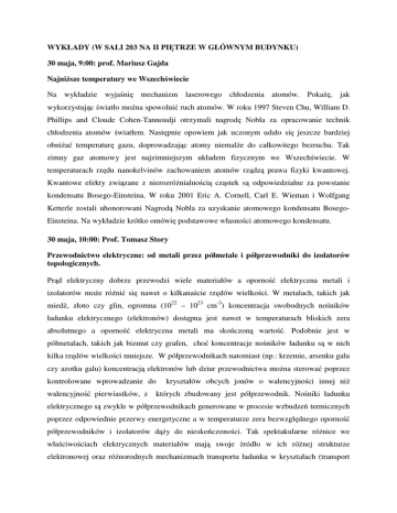 WYKŁADY (W SALI 203 NA II PIĘTRZE W GŁÓWNYM BUDYNKU) 30 maja, 9:00: prof. Mariusz Gajda NajniŜsze temperatury we Wszechświecie Na wykładzie wyjaśnię mechanizm laserowego chłodzenia atomów. PokaŜę, jak wykorzystując światło moŜna spowolnić ruch atomów. W roku 1997 Steven Chu, William D. Phillips and Cloude Cohen-Tannoudji otrzymali nagrodę Nobla za opracowanie technik chłodzenia atomów światłem. Następnie opowiem jak uczonym udało się jeszcze bardziej obniŜać temperaturę gazu, doprowadzając atomy niemalŜe do całkowitego bezruchu. Tak zimny gaz atomowy jest najzimniejszym układem fizycznym we Wszechświecie. W temperaturach rzędu nanokelvinów zachowaniem atomów rządzą prawa fizyki kwantowej. Kwantowe efekty związane z nierozróŜnialnością cząstek są odpowiedzialne za powstanie kondensatu Bosego-Einsteina. W roku 2001 Eric A. Cornell, Carl E. Wieman i Wolfgang Ketterle zostali uhonorowani Nagrodą Nobla za uzyskanie atomowego kondensatu BosegoEinsteina. Na wykładzie krótko omówię podstawowe własności atomowego kondensatu. 30 maja, 10:00: Prof. Tomasz Story Przewodnictwo elektryczne: od metali przez półmetale i półprzewodniki do izolatorów topologicznych. Prąd elektryczny dobrze przewodzi wiele materiałów a oporność elektryczna metali i izolatorów moŜe róŜnić się nawet o kilkanaście rzędów wielkości. W metalach, takich jak miedź, złoto czy glin, ogromna (1022 – 1023 cm-3) koncentracja swobodnych nośników ładunku elektrycznego (elektronów) dostępna jest nawet w temperaturach bliskich zera absolutnego a oporność elektryczna metali ma skończoną wartość. Podobnie jest w półmetalach, takich jak bizmut czy grafen, choć koncentracje nośników ładunku są w nich kilka rzędów wielkości mniejsze. W półprzewodnikach natomiast (np.: krzemie, arsenku galu czy azotku galu) koncentracją elektronów lub dziur przewodnictwa moŜna sterować poprzez kontrolowane wprowadzanie do walencyjność pierwiastków, z kryształów obcych jonów o walencyjności innej niŜ których zbudowany jest półprzewodnik. Nośniki ładunku elektrycznego są zwykle w półprzewodnikach generowane w procesie wzbudzeń termicznych poprzez odpowiednie przerwy energetyczne a w temperaturze zera bezwzględnego oporność półprzewodników i izolatorów dąŜy do nieskończoności. Tak spektakularne róŜnice we właściwościach elektrycznych materiałów mają swoje źródło w ich róŜnej strukturze elektronowej oraz róŜnorodnych mechanizmach transportu ładunku w kryształach (transport dyfuzyjny lub balistyczny, mechanizm przeskoków). Zjawiska te będą omówione na przykładzie kluczowych współczesnych materiałów z wykorzystaniem podstawowego modelu Drudego oraz idei wynikających z równania Boltzmanna. Pokazane zostanie takŜe jak ustalony od dawna kluczowy podział materiałów na metale (półmetale) i izolatory (półprzewodniki) został ostatnio wzbogacony o nową klasę materiałów elektronicznych izolatory topologiczne, w których w wyniku efektów relatywistycznych w strukturze elektronowej izolującym właściwościom objętości kryształu nierozłącznie towarzyszą metaliczne właściwości ich powierzchni. 30 maja, 11:30: prof. Henryk Szymczak Symetria i asymetria w fizyce ciała stałego Emma Noether w 1918 r. pokazała, Ŝe podstawowe prawa przyrody związane są z symetrią (np. prawo zachowania energii wynika z symetrii względem przesunięć w czasie a prawo zachowania pędu - z symetrii względem przesunięć w przestrzeni). Zazwyczaj piękno w fizyce widzimy właśnie w symetrii praw fizycznych. Problem ten rozpatrzony zostanie na przykładzie równań Maxwella. Nie są one symetryczne (niezmiennicze) przy wzajemnej zamianie parametrów magnetycznych układu na parametry elektryczne. W 1931 r Paul Dirac postulował symetryczną formę równań Maxwella przyjmując istnienie w przyrodzie ładunków magnetycznych (monopoli). Rozpatrzymy konsekwencje tego załoŜenia i próby obserwacji monopoli w tzw. „lodzie spinowym” oraz w układach chiralnych zawierających skyrmiony (przypominające wiry struktury magnetyczne). Opanowanie metod wytwarzania monopoli magnetycznych umoŜliwi rozwój nowej dziedziny techniki –magnetyczności (analog elektryczności). Omówione zostaną pierwsze wyniki badań w tej dziedzinie i dalsze perspektywy jej rozwoju. 31 maja, 10:00: prof. Andrzej Wiśniewski Nadprzewodnictwo: czy rozumiemy to zjawisko, czy potrafimy je zastosować? W trakcie wykładu krótko dokonałem przeglądu materiałów nadprzewodzących i omówię ich podstawowe właściwości. Następnie wyjaśnię, jak zachowuje się nadprzewodnik w polu magnetycznym, wprowadzę pojęcie nadprzewodników I i II rodzaju, stanu mieszanego (w nadprzewodniku mogą współistnieć obszary nadprzewodzące i normalne). Przedstawię zarys fenomenologicznej teorii Ginzburga-Landaua, dzięki której wiemy jak powiązać wielkości takie jak pierwsze i drugie pole krytyczne z parametrami mikroskopowymi – długością koherencji i głębokością wnikania pola magnetycznego. Wyjaśnię pojęcie prądu krytycznego (największego prądu, który moŜe płynąć przez nadprzewodnik bez strat) oraz pokaŜę, w jaki sposób w danym nadprzewodniku moŜna zwiększać wartość tego prądu. Mikroskopowy mechanizm nadprzewodnictwa zrozumiano dopiero po 50 latach od odkrycia tego zjawiska. Dokonali tego trzej amerykańscy fizycy: Bardeen, Cooper i Schrieffer – twórcy teorii, którą obecnie nazywa się teorią BCS. W trakcie wykładu wprowadzę pojęcie „par Coopera” – nośników prądu nadprzewodzącego oraz wyjaśnię dlaczego pary Coopera nie są rozpraszane, czyli dlaczego prąd nadprzewodzący moŜe płynąć bez strat. Zachowanie nadprzewodnika w polu magnetycznym zilustruję pokazem lewitacji magnesu nad nadprzewodnikiem YBa2Cu3O7-x schłodzonym do temperatury ciekłego azotu (77 K). ZWIEDZANIE PRACOWNI Dr Marta Aleszki