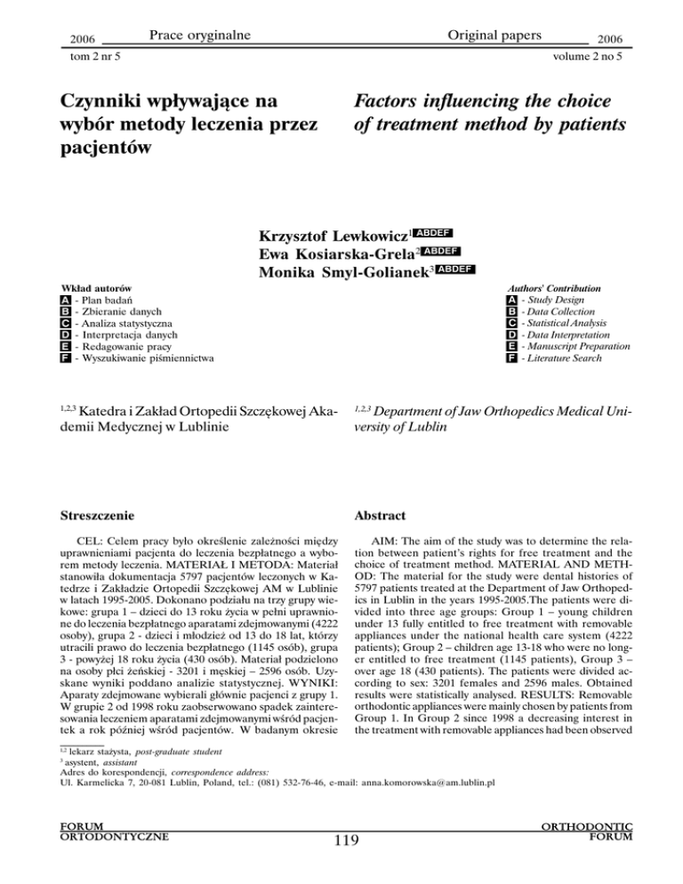 2006 Prace oryginalne Original papers tom 2 nr 5 2006 volume 2 no 5 Factors influencing the choice of treatment method by patients Czynniki wpływające na wybór metody leczenia przez pacjentów Krzysztof Lewkowicz1 ABDEF Ewa Kosiarska-Grela2 ABDEF Monika Smyl-Golianek3 ABDEF Authors' Contribution A - Study Design B - Data Collection C - Statistical Analysis D - Data Interpretation E - Manuscript Preparation F - Literature Search Wkład autorów A - Plan badań B - Zbieranie danych C - Analiza statystyczna D - Interpretacja danych E - Redagowanie pracy F - Wyszukiwanie piśmiennictwa 1,2,3 Katedra i Zakład Ortopedii Szczękowej Akademii Medycznej w Lublinie 1,2,3 Streszczenie Abstract CEL: Celem pracy było określenie zależności między uprawnieniami pacjenta do leczenia bezpłatnego a wyborem metody leczenia. MATERIAŁ I METODA: Materiał stanowiła dokumentacja 5797 pacjentów leczonych w Katedrze i Zakładzie Ortopedii Szczękowej AM w Lublinie w latach 1995-2005. Dokonano podziału na trzy grupy wiekowe: grupa 1 – dzieci do 13 roku życia w pełni uprawnione do leczenia bezpłatnego aparatami zdejmowanymi (4222 osoby), grupa 2 - dzieci i młodzież od 13 do 18 lat, którzy utracili prawo do leczenia bezpłatnego (1145 osób), grupa 3 - powyżej 18 roku życia (430 osób). Materiał podzielono na osoby płci żeńskiej - 3201 i męskiej – 2596 osób. Uzyskane wyniki poddano analizie statystycznej. WYNIKI: Aparaty zdejmowane wybierali głównie pacjenci z grupy 1. W grupie 2 od 1998 roku zaobserwowano spadek zainteresowania leczeniem aparatami zdejmowanymi wśród pacjentek a rok później wśród pacjentów. W badanym okresie AIM: The aim of the study was to determine the relation between patient’s rights for free treatment and the choice of treatment method. MATERIAL AND METHOD: The material for the study were dental histories of 5797 patients treated at the Department of Jaw Orthopedics in Lublin in the years 1995-2005.The patients were divided into three age groups: Group 1 – young children under 13 fully entitled to free treatment with removable appliances under the national health care system (4222 patients); Group 2 – children age 13-18 who were no longer entitled to free treatment (1145 patients), Group 3 – over age 18 (430 patients). The patients were divided according to sex: 3201 females and 2596 males. Obtained results were statistically analysed. RESULTS: Removable orthodontic appliances were mainly chosen by patients from Group 1. In Group 2 since 1998 a decreasing interest in the treatment with removable appliances had been observed Department of Jaw Orthopedics Medical University of Lublin __________ 1,2 lekarz stażysta, post-graduate student 3 asystent, assistant Adres do korespondencji, correspondence address: Ul. Karmelicka 7, 20-081 Lublin, Poland, tel.: (081) 532-76-46, e-mail: [email protected] 119 2006 Prace oryginalne Original papers tom 2 nr 5 2006 volume 2 no 5 dopiero od 2003 roku większość pacjentów zdecydowała się na leczenie aparatami stałymi. W grupie 3 pacjenci od roku 2001 decydowali się wyłącznie na leczenie aparatami stałymi. WNIOSKI: W okresie 1995-2005 wzrosło zainteresowanie leczeniem ortodontycznym pacjentów płci męskiej. Wybierali oni chętniej aparaty stałe. Leczenie aparatami zdejmowanymi stosowano głównie w grupie 1. Pacjenci z grupy 2 i 3 najczęściej decydowali się na leczenie aparatami stałymi. Na przestrzeni 11 lat nastąpił dwukrotny wzrost oddawanych aparatów stałych. (Forum Ortod. 2006; 2: 119-24) among females and a year later among males. In the study period the majority of patients had started to choose the treatment with fixed appliances since 2003. Patients in Group 3 since 2001 had chosen the treatment with fixed appliances only. CONCLUSIONS: In the years 1995-2005 an interest with orthodontic treatment increased among male patients, who preferred fixed appliances. Treatment with removable appliances was chosen mainly in Group 1. Patients from Group 2 and group 3 most often chose treatment with fixed appliances. Within 11 years the use of fixed appliances increased twice. (Orthod. Forum 2006; 2: 119- 24) SŁOWA KLUCZOWE: aparaty stałe aparaty zdejmowane bezpłatne leczenie ortodontyczne wybór metody leczenia KEY WORDS: choice of treatment method fixed appliances free of charge orthodontic treatment removable appliances Wstęp Introduction Przemiany społeczno-gospodarcze w Polsce w latach dziewięćdziesiątych XX wieku wymusiły konieczność zmian w służbie zdrowia (1). Od stycznia 1999 r. zaczęły funkcjonować Kasy Chorych, przekształcone w 2003 r. w Narodowy Fundusz Zdrowia. Leczenie ortodontyczne opłacane przez Kasy Chorych obejmowało wyłącznie aparaty zdejmowane, przysługujące pacjentom do 13 roku życia z bezpłatnymi wizytami kontrolnymi do lat 15 (1). NFZ finansuje leczenie ortodontyczne do 12 roku życia, a kontrole aparatów do lat 13. Leczenie aparatami stałymi zawsze wiązało się z kosztami ponoszonymi przez pacjenta. Wybierali tę metodę pacjenci, którzy utracili prawo do leczenia bezpłatnego oraz osoby przekonane o większej skuteczności tej techniki ortodontycznej. W świetle obserwacji praktyki codziennej można sądzić, że pacjenci ortodontyczni stali się bardziej wymagający i aktywni. Interesuje ich plan leczenia, jego cele i osobisty wkład w ich realizację (2). Brakuje w krajowej literaturze doniesień czy i jak zmieniało się podejście pacjentów do wyboru metody leczenia. Przeprowadzone badanie przedstawia te zależności w przeciągu ostatnich 11 lat. Social and economic changes in Poland in the 1990s resulted in the need for a change in the system of health care (1). The health scheme called the Sick Fund, founded in 1999, was converted into the National Health Fund (NFZ) in 2003. Orthodontic treatment paid by the Sick Fund included only removable appliances, free of charge for patients under 13, and free orthodontic control visits until 