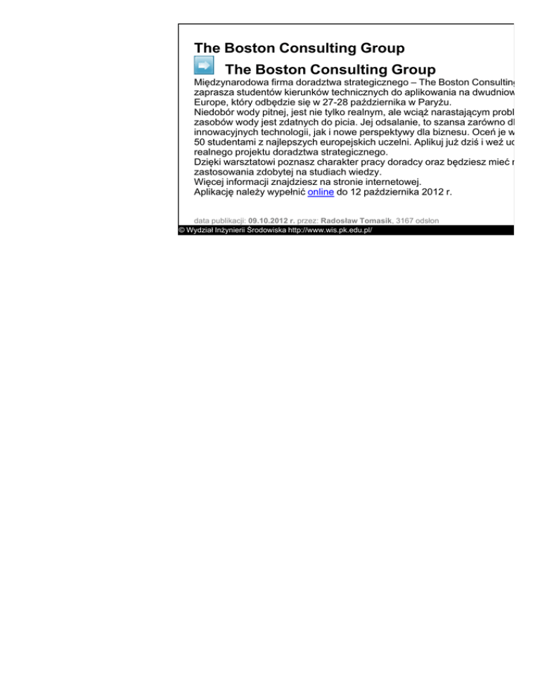 The Boston Consulting Group The Boston Consulting Group Międzynarodowa firma doradztwa strategicznego – The Boston Consulting Grou zaprasza studentów kierunków technicznych do aplikowania na dwudniowy war Europe, który odbędzie się w 27-28 października w Paryżu. Niedobór wody pitnej, jest nie tylko realnym, ale wciąż narastającym problemem zasobów wody jest zdatnych do picia. Jej odsalanie, to szansa zarówno dla rozw innowacyjnych technologii, jak i nowe perspektywy dla biznesu. Oceń je wraz z e 50 studentami z najlepszych europejskich uczelni. Aplikuj już dziś i weź udział w realnego projektu doradztwa strategicznego. Dzięki warsztatowi poznasz charakter pracy doradcy oraz będziesz mieć możliw zastosowania zdobytej na studiach wiedzy. Więcej informacji znajdziesz na stronie internetowej. Aplikację należy wypełnić online do 12 października 2012 r. data publikacji: 09.10.2012 r. przez: Radosław Tomasik, 3167 odsłon © Wydział Inżynierii Środowiska http://www.wis.pk.edu.pl/