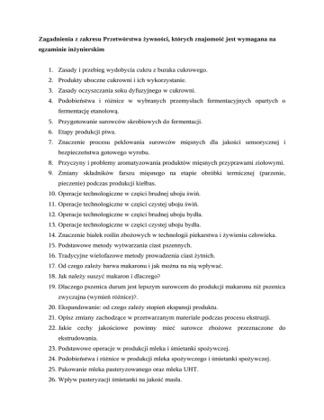 Zagadnienia z zakresu Przetwórstwa żywności, których znajomość jest wymagana na egzaminie inżynierskim 1. Zasady i przebieg wydobycia cukru z buraka cukrowego. 2. Produkty uboczne cukrowni i ich wykorzystanie. 3. Zasady oczyszczania soku dyfuzyjnego w cukrowni. 4. Podobieństwa i różnice w wybranych przemysłach fermentacyjnych opartych o fermentację etanolową. 5. Przygotowanie surowców skrobiowych do fermentacji. 6. Etapy produkcji piwa. 7. Znaczenie procesu peklowania surowców mięsnych dla jakości sensorycznej i bezpieczeństwa gotowego wyrobu. 8. Przyczyny i problemy aromatyzowania produktów mięsnych przyprawami ziołowymi. 9. Zmiany składników farszu mięsnego na etapie obróbki termicznej (parzenie, pieczenie) podczas produkcji kiełbas. 10. Operacje technologiczne w części brudnej uboju świń. 11. Operacje technologiczne w części czystej uboju świń. 12. Operacje technologiczne w części brudnej uboju bydła. 13. Operacje technologiczne w części czystej uboju bydła. 14. Znaczenie białek roślin zbożowych w technologii piekarstwa i żywieniu człowieka. 15. Podstawowe metody wytwarzania ciast pszennych. 16. Tradycyjne wielofazowe metody prowadzenia ciast żytnich. 17. Od czego zależy barwa makaronu i jak można na nią wpływać. 18. Jak należy suszyć makaron i dlaczego? 19. Dlaczego pszenica durum jest lepszym surowcem do produkcji makaronu niż pszenica zwyczajna (wymień różnice)?. 20. Ekspandowanie: od czego zależy stopień ekspansji produktu. 21. Opisz zmiany zachodzące w przetwarzanym materiale podczas procesu ekstruzji. 22. Jakie cechy jakościowe powinny mieć surowce zbożowe przeznaczone do ekstrudowania. 23. Podstawowe operacje w produkcji mleka i śmietanki spożywczej. 24. Podobieństwa i różnice w produkcji mleka spożywczego i śmietanki spożywczej. 25. Pakowanie mleka pasteryzowanego oraz mleka UHT. 26. Wpływ pasteryzacji śmietanki na jakość masła. 27. Dojrzewanie fizyczne i biologiczne w technologii produkcji masła. 28. Podobieństwa i różnice w produkcji masła i produktów masłopodobnych. 29. Przedstaw i krótko omów czynniki kształtujące jakość mięsa surowego. 30. Przedstaw i krótko scharakteryzuj najważniejsze etapy zmian poubojowych w mięsie. 31. Wymień wady mięsa i krótko je scharakteryzuj. 32. Przedstaw najważniejsze metody pozwalające na zagospodarowanie mięsa o obniżonej jakości. 33. Podaj sposoby stosowane w przetwórstwie jaj ułatwiające proces pasteryzacji. 34. Omów technologię produkcji płynnych przetworów z jaj. 35. Cel i metody odcukrzania w procesie przetwórstwa jaj kurzych. Omów metodę fermentacji enzymatycznej stosowaną do odcukrzenia białka jaja. 36. Charakterystyka fizyko-chemiczna oraz funkcjonalna mięsa drobiowego odzyskanego mechanicznie. 37. Rola białek mięśniowych w przetwórstwie mięsa drobiowego. 38. Uzasadnij wysoką wartość żywieniową i przetwórczą mięsa drobiowego. 39. Jakie znasz półprodukty i produkty owocowo-warzywne (podaj ich definicję) 40. Omów technologie mrożenia owoców i warzyw (podaj różnice w przygotowaniu surowca). 41. Omów proces solenia warzyw, grzybów i owoców (uwzględnij różnice). 42. Omów technologie produkcji produktów apertyzowanych sterylizowanych). 43. Omów produkcję soków owocowych (klarowanych i mętnych). 44. Przedstaw proces produkcji koncentratów pomidorowych. 45. Koncentraty obiadowe - technologia i wartość odżywcza. 46. Koncentraty nowej generacji. 47. Koncentraty przyprawowe - wzmacniacze smaku. (pasteryzowanych,