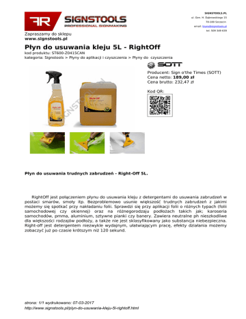 SIGNSTOOLS.PL ul. Gen. H. Dąbrowskiego 15 70-100 Szczecin email: [email protected] tel. 509 349 639 Zapraszamy do sklepu www.signstools.pl Płyn do usuwania kleju 5L - RightOff kod produktu: ST600-Z0415CAN kategoria: Signstools > Płyny do aplikacji i czyszczenia > Płyny do czyszczenia Producent: Sign o'the Times (SOTT) Cena netto: 189,00 zł Cena brutto: 232,47 zł Kod QR: Płyn do usuwania trudnych zabrudzeń - Right-Off 5L. RightOff jest połączeniem płynu do usuwania kleju z detergentami do usuwania zabrudzeń w postaci smarów, smoły itp. Bezproblemowo usunie większość trudnych zabrudzeń z jakimi możemy się spotkać przy nakładaniu folii. Sprawdzi się przy aplikacji folii o różnych typach (folii samochodowej czy okiennej) oraz na różnegorodzaju podłożach takich jak; karoseria samochodów, pmma, aluminium, sztywne pianki czy banery. Zawiera neutralne ph nieszkodliwe dla większości rodzajów podłoży, a także nie jest sklasyfikowany jako substancja niebezpieczna. Right-off jest detergentem niezwykle wydajnym, ułatwiającym pracę, efekty działania możemy zobaczyć już po czasie krótszym niż 120 sekund. strona: 1/1 wydrukowano: 07-03-2017 http://www.signstools.pl/plyn-do-usuwania-kleju-5l-rightoff.html