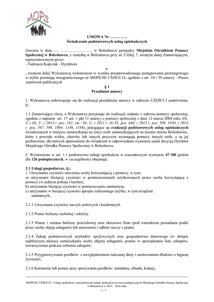 UMOWA Nr …………. Świadczenie podstawowych usług opiekuńczych Zawarta w dniu ..... …………………… w Bolesławcu pomiędzy Miejskim Ośrodkiem Pomocy Społecznej w Bolesławcu, z siedzibą w Bolesławcu przy ul. Cichej 7, zwanym dalej Zamawiającym, reprezentowanym przez: - Tadeusza Kupczak - Dyrektora a: , zwanym dalej Wykonawcą wyłonionym w wyniku przeprowadzonego postępowania przetargowego w trybie przetargu nieograniczonego nr MOPS/SE/1/SIWZ/14, zgodnie z art. 10 i 39 ustawy - Prawo zamówień publicznych §1 Przedmiot umowy 1. Wykonawca zobowiązuje się do realizacji przedmiotu umowy w zakresie CZĘŚCI I zamówienia, tj.: 1.1 Zamawiający zleca, a Wykonawca przyjmuje do realizacji zadanie z zakresu pomocy społecznej, zgodnie z zapisem art. 17 ust. 1 pkt 11 ustawy o pomocy społecznej z dnia 12 marca 2004 roku (Dz. U z Dz. U. z 2013 r. poz. 182; zm.: Dz. U. z 2011 r. Nr 81, poz. 440; z 2013 r. poz. 509, 1650; z 2014 r. poz. 567, 598, 1004, 1146, 1188), polegające na realizacji podstawowych usług opiekuńczych świadczonych w miejscu zamieszkania na rzecz osób zamieszkujących na terenie miasta Bolesławiec, które z powodu wieku, choroby lub innych przyczyn wymagają pomocy innych osób, a są jej pozbawione, dla których uprawnienie do świadczeń w odpowiednim wymiarze ustali decyzją Dyrektor Miejskiego Ośrodka Pomocy Społecznej w Bolesławcu. 2. Wymienione w ust. 1.1 podstawowe usługi opiekuńcze w szacunkowym wymiarze 47 100 godzin dla 126 podopiecznych, w szczególności obejmują: 2.1 Usługi gospodarcze, tj.: 1. Utrzymanie czystości otoczenia osoby korzystającej z pomocy, w tym: a) utrzymanie bieżącej czystości w pomieszczeniach użytkowanych przez osobę korzystającą z pomocy (w jednym pokoju i kuchni), b) utrzymanie bieżącej czystości w pomieszczeniu sanitarnym, c) utrzymanie w bieżącej czystości sprzętu codziennego użytku, w tym urządzeń sanitarnych, 2.1.1 Utrzymanie czystości naczyń stołowych i kuchennych. 2.1.2 Pranie bielizny osobistej i odzieży. 2.1.3 Pranie i zmiana bielizny pościelowej oraz okresowo firan (pod warunkiem posiadania pralki przez osobę objętą usługami) lub zanoszenie i odbiór rzeczy z pralni, 2.1.4 Zakup podstawowych artykułów spożywczych oraz gospodarstwa domowego (w sklepie najbliższym miejsca zamieszkania osoby objętej usługami), pomoc w sporządzaniu listy zakupów, towarzyszenie podczas robienia zakupów, 2.1.5 Przygotowywanie posiłków z uwzględnieniem zalecanej diety i zachowaniem dbałości o higienę żywności, 2.1.6 Karmienie lub pomoc przy spożywaniu posiłków: śniadania, obiadu, kolacji, MOPS/SE/1/SIWZ/14 - Usługi opiekuńcze i specjalistyczne usługi opiekuńcze na rzecz podopiecznych Miejskiego Ośrodka Pomocy Społecznej w Bolesławcu w 2015 – 2016 roku 1/7 2.1.7 Dostarczanie jednego gorącego posiłku dziennie, 2.1.8 Palenie w piecu i przynoszenie opału, 2.1.9 Załatwianie spraw urzędowych lub towarzyszenie podczas wizyt w urzędach lub innych instytucjach i organizacjach, opłacanie rachunków, 2.1.10 Zamawianie wizyt lekarskich i towarzyszenie w nich, jeżeli zachodzi taka potrzeba, kontakt z placówkami służby zdrowia w sprawach dotyczących zdrowia osoby objętej opieką, realizacja recept (w aptece najbliższej miejsca zamieszkania osoby objętej usługami), 2.1.11 Organizowanie spacerów, podtrzymywanie kontaktów ze środowiskiem. 2.1.12 Inne, niezbędne dla realizacji czynności, których mowa w ust. 2.1 - 2.1.12 2.2 Usługi pielęgnacyjne, tj.: 2.2.1 Utrzymywanie higieny: mycie ciała, mycie głowy, kąpiel, zmiana pieluchomajtek, 2.2.2 Czesanie, golenie, obcinanie paznokci, 2.2.3 Zmiana bielizny osobistej, ubieranie, 2.2.4 Pomoc w załatwianiu potrzeb fizjologicznych, 2.2.5 Prześcielanie łóżka, układanie chorego w łóżku, 2.2.6 Pielęgnacja zalecona przez lekarza, polegająca w zależności od sytuacji na: a) stosowaniu kompresów i okładów, b) zapobieganiu powstawania odleżyn lub odparzeń, 2.2.7 Podawanie leków zgodnie z zaleceniem lekarza. 3. Rzeczywista liczba godzin świadczenia usług opiekuńczych uzależniona będzie od potrzeb Zamawiającego. 4. Integralnymi częściami niniejszej umowy są następujące dokumenty: 4.1 Oferta Wykonawcy wraz z załącznikami, 4.2 SIWZ wraz z załącznikami 5. Wykonawca zobowiązuje się do wykonywania usług w dni robocze w godzinach 700 – 2000. W niektórych sytuacjach, w zależności od stanu zdrowia, wieku i warunków bytowych podopiecznego, w uzgodnieniu z Zamawiającym, usługi opiekuńcze winny być świadczone również w dni ustawowo wolne od pracy oraz w wyjątkowych przypadkach w godzinach nocnych. 6. Świadczenie usług opiekuńczych będących przedmiotem umowy, Wykonawca powierzać będzie osobom posiadającym wymagane w SIWZ kwalifikacje/kompetencje. 7. Zamawiający zastrzega sobie prawo kontroli kwalifikacji osób wykonujących usługi. §2 Termin realizacji przedmiotu umowy Umowa obowiązuje od 1 stycznia 2015 r. do 30 czerwca 2016 r. MOPS/SE/1/SIWZ/14 - Usługi opiekuńcze i specjalistyczne usługi opiekuńcze na rzecz podopiecznych Miejskiego Ośrodka Pomocy Społecznej w Bolesławcu w 2015 – 2016 roku 2/7 §3 Rozpoczęcie wykonywania przedmiotu umowy 1. Kopia decyzji Dyrektora MOPS stanowi zlecenie na wykonanie usług opiekuńczych będących przedmiotem umowy. 2. Za datę rozpoczęcia i zakończenia świadczenia usług opiekuńczych na rzecz podopiecznych uważa się datę wskazaną w decyzji administracyjnej. 3. W wyjątkowych przypadkach dopuszcza się zlecenie usługi lub powiadomienie o przerwaniu świadczenia usług dokonane telefonicznie lub faksem, a następnie potwierdzenie tych czynności decyzją administracyjną. §4 Obowiązki Wykonawcy 1. Wykonawca zobowiązuje się do doręczenia podopiecznemu za pokwitowaniem oryginału decyzji Dyrektora Miejskiego Ośrodka Pomocy Społecznej w Bolesławcu, w terminie do 7 dni od dnia odbioru decyzji od Zamawiającego oraz pobiera