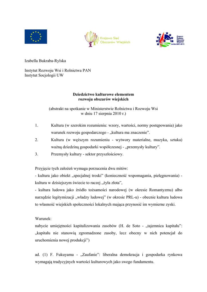 Izabella Bukraba-Rylska Instytut Rozwoju Wsi i Rolnictwa PAN Instytut Socjologii UW Dziedzictwo kulturowe elementem rozwoju obszarów wiejskich (abstrakt na spotkanie w Ministerstwie Rolnictwa i Rozwoju Wsi w dniu 17 sierpnia 2010 r.) 1. Kultura (w szerokim rozumieniu: wzory, wartości, normy postępowania) jako warunek rozwoju gospodarczego - „kultura ma znaczenie”. 2. Kultura (w węższym rozumieniu - wytwory materialne, muzyka, sztuka) ważną dziedziną gospodarki współczesnej - „przemysły kultury”. 3. Przemysły kultury - sektor przyszłościowy. Przyjęcie tych założeń wymaga porzucenia dwu mitów: - kultura jako obiekt „specjalnej troski” (konieczność wspomagania, pielęgnowania) kultura w dzisiejszym świecie to raczej „żyła złota”, - kultura ludowa jako źródło tożsamości narodowej (w okresie Romantyzmu) albo narzędzie legitymizacji „władzy ludowej” (w okresie PRL-u) - obecnie kultura ludowa to własność wiejskich społeczności lokalnych mająca przynosić im wymierne zyski. Warunek: nabycie umiejętności kapitalizowania zasobów (H. de Soto - „tajemnica kapitału”: „kapitału nie stanowią zgromadzone zasoby, lecz obecny w nich potencjał do uruchomienia nowej produkcji”) ad. (1) F. Fukuyama - „Zaufanie”: liberalna demokracja i gospodarka rynkowa wymagają tradycyjnych wartości kulturowych jako swego fundamentu. Polski model transformacji jako zaprzeczenie tego postulatu i negatywne skutki obranej przed dwudziestu laty drogi. ad. (2) Znaczenie sektora kultury w gospodarce UE (np. udział sektora w PKB = 2,6%; zatrudnienie = 3,1% siły roboczej; zalety - zapewnia zrównoważony wzrost gospodarczy, generuje nowe miejsca pracy, przyczynia się do spójności społecznej, sprzyja rozwojowi regionalnemu i lokalnemu, jest bezpieczny dla środowiska naturalnego) - potwierdzenie zasady „konwersji kapitału” P. Bourdieu: kapitał kulturowy może stać się kapitałem ekonomicznym lub społecznym. ad. (3) aktualne uwarunkowania: - kontekst Polski - szansa na nowe źródła dochodu mieszkańców wsi i ograniczenie bezrobocia - kontekst Unii Europejskiej - nowa filozofia rolnictwa i rozwoju obszarów wiejskich („co produkuje rolnictwo?” - prof. J. Wilkin) - kontekst światowy - J. Rifkin - „Wiek dostępu”: „Produkcja dóbr kultury będzie główną areną światowej gospodarki w XXI w.” Przemysły kultury - definicja J. Szomburga, Deklaracja z Essen (1999), postulat Kongresu Kultury Polskiej (Kraków - 2009 r.) Klastry - innowacyjna formuła rozwoju przedsiębiorczości Polskie doświadczenia - rozwój przedsiębiorczości XIX/XX w., Stowarzyszenie Twórców Ludowych”, ruch regionalistyczny. „Cepelia”,