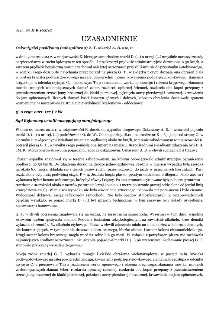 Sygn. akt II K 192/15 UZASADNIENIE Oskarżyciel posiłkowy (subsydiarny) Z. T. oskarżył A. B. o to, że: w dniu 9 marca 2014 r. w miejscowości K. kierując samochodem marki D. (...) o nr rej. (...) umyślnie naruszył zasady bezpieczeństwa w ruchu lądowym w ten sposób, iż przekroczył prędkość administracyjnie dozwoloną o 30 km/h, a zarazem prędkość bezpieczną oraz nie zachował należytej ostrożności przy zbliżaniu się do przystanku autobusowego, w wyniku czego doszło do najechania przez pojazd na pieszą G. T., w związku z czym doznała ona obrażeń ciała w postaci krwiaka podtwardówkowego na całej powierzchni mózgu, krwawienia podpajęczynkówkowego, złamania kręgosłupa w odcinku szyjnym C7 i piersiowym Th 9 z rozdarciem worka oponowego i rdzenia kręgowego, złamania mostka, mnogich wielomiejscowych złamań żeber, rozdarcia opłucnej ściennej, rozdarcia obu kopuł przepony z przemieszczeniem trzewi jamy brzusznej do klatki piersiowej, pęknięcia aorty piersiowej i brzusznej, krwawienia do jam opłucnowych, licznych złamań kości kończyn górnych i dolnych, które to obrażenia skutkowały zgonem wymienionej w następstwie zaistniałej niewydolności krążeniowo - oddechowej tj. o czyn z art. 177 § 2 kk Sąd Rejonowy ustalił następujący stan faktyczny: W dniu 09 marca 2014 r. w miejscowości K. doszło do wypadku drogowego. Oskarżony A. B. – właściciel pojazdu marki D. (...) o nr. rej. (...) podróżował z O. do W.. Około godziny 18.00, na drodze nr K – 63, jadąc od strony O. w kierunku P. z włączonymi światłami mijania z prędkością około 80 km/h, w terenie zabudowanym w miejscowości K. potrącił pieszą G. T., w wyniku czego poniosła ona śmierć na miejscu. Bezpośrednimi świadkami zdarzenia byli D. J. i M. R., którzy kierowali swoimi pojazdami, jadąc za oskarżonym. Oskarżony A. B. w chwili zdarzenia był trzeźwy. Obszar wypadku znajdował się w terenie zabudowanym, na którym obowiązywało administracyjne ograniczenie prędkości do 50 km/h. Do zdarzenia doszło na drodze jedno-jezdniowej. Jezdnia w miejscu wypadku była szeroka na około 8,6 metra, składała się z dwóch pasów ruchu, przeznaczonych do jazdy w przeciwnych kierunkach. Pasy rozdzielone były linią podwójną ciągłą P – 4. Jezdnia biegła płasko, prostym odcinkiem o długości około 200 m i wykonana była z betonu asfaltowego, który był równy i czysty. Po obu stronach usytuowane były pobocza gruntowo – trawiaste o szerokości około 2 metrów po stronie lewej i około 2,1 metra po stronie prawej oddzielone od jezdni linią krawędziową ciągłą. W miejscu wypadku nie było oświetlenia sztucznego, panowała już pora nocna i było ciemno. Widoczność dyktował zasięg reflektorów samochodu. Nie było opadów atmosferycznych. Z przeprowadzonych oględzin wynikało, że pojazd marki D. (...) był sprawny technicznie, w tym sprawne były układy oświetlenia, kierowniczy i hamowania. G. T. w chwili potrącenia znajdowała się na jezdni, na torze ruchu samochodu. Wcześniej w tym dniu, wspólnie ze swoim mężem spożywała alkohol. Poddana badaniom toksykologicznym na zawartość alkoholu, krew denatki wykazała obecność 2 ‰ alkoholu etylowego. Piesza w chwili zdarzenia miała na sobie odzież w kolorach ciemnych, nie kontrastujących, w tym spodnie dresowe koloru czarnego, bluzkę zieloną i sweter koloru ciemnoniebieskiego. Drugi sweter koloru brązowego mogła mieć na sobie lub go nieść. W związku z powyższym piesza nie zachowała najmniejszych środków ostrożności i nie ustąpiła pojazdowi marki D. (...) pierwszeństwa. Zachowanie pieszej G. T. stanowiło przyczynę wypadku drogowego. Sekcja zwłok zmarłej G. T. wykazała mnogie i ciężkie obrażenia wielonarządowe, w postaci m.in. krwiaka podtwardówkowego na całej powierzchni mózgu, krwawienia podpajęczynówkowego, złamania kręgosłupa w odcinku szyjnym C7 i piersiowym Th9 z rozdarciem worka oponowego i rdzenia kręgowego, złamania mostka, mnogich wielomiejscowych złamań żeber, rozdarcia opłucnej ściennej, rozdarcia obu kopuł przepony z przemieszczeniem trzewi jamy brzusznej do klatki piersiowej, pęknięcia aorty piersiowej i brzusznej, krwawienia do jam opłucnowych, licznych złamań kości kończyn górnych i dolnych, które to obrażenia skutkowały zgonem wymienionej w następstwie zaistniałej niewydolności krążeniowo – oddechowej. W sprawie w dniu 30 czerwca 2014 r. została wydana wspólna opinia biegłych z zakresu medycyny sądowej, rekonstrukcji wypadków drogowych oraz mechanoskopii, którzy to biegli mieli za zadanie odtworzenie przebiegu zaistniałego zdarzenia. Z analizy czasowo – przestrzennej wynikało, że kierowca jadąc nawet z prędkością dozwoloną nie miał możliwości uniknięcia wypadku, z tym, że do potrącenia doszłoby tuż przed zatrzymaniem pojazdu. Mimo uważnej obserwacji sytuacji na drodze i tak nie byłby w stanie wykonać jakiegokolwiek skutecznego manewru obronnego, gdyż realna odległość rozpoznania przeszkody była zbyt krótka. W drugiej wydanej w sprawie opinii uzupełniającej z dnia 23 listopada 2014 r., biegli sprecyzowali swe wnioski – odnosząc się do pytań zawartych w postanowieniu prokuratora i jednocześnie zarzutów pokrzywdzonego Z. T. podniesionych w uwzględnionym uprzednio przez Sąd zażaleniu – iż, kierujący pojazdem marki D. przejeżdżał obok oznakowanego przystanku autobusowego, ale znajdującego się przy chodniku dla pieszych, nie był więc zobowiązany do zachowania szczególnej ostrożności. Nie było też autobusów na przystankach położonych po obu stronach drogi. Jazda w tych warunkach z prędkością około 80 km/h (przekroczenie prędkości administracyjnie dozwolonej) stwarzała zagrożenie w ruchu drogowym, ale nie było też żadnych przesłanek ku temu, aby ograniczać prędkość poniżej prędkości administracyjnie dozwolonej (tj. poniżej 50 km/h