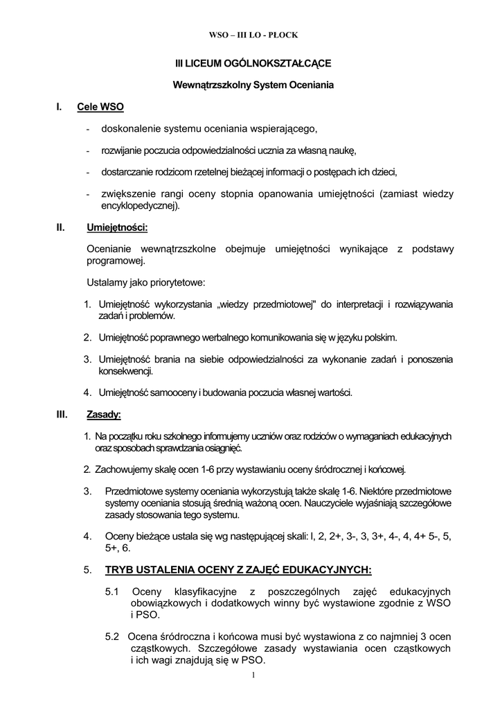 WSO – III LO - PŁOCK III LICEUM OGÓLNOKSZTAŁCĄCE Wewnątrzszkolny System Oceniania I. II. Cele WSO - doskonalenie systemu oceniania wspierającego, - rozwijanie poczucia odpowiedzialności ucznia za własną naukę, - dostarczanie rodzicom rzetelnej bieżącej informacji o postępach ich dzieci, - zwiększenie rangi oceny stopnia opanowania umiejętności (zamiast wiedzy encyklopedycznej). Umiejętności: Ocenianie wewnątrzszkolne obejmuje umiejętności wynikające z podstawy programowej. Ustalamy jako priorytetowe: 1. Umiejętność wykorzystania „wiedzy przedmiotowej" do interpretacji i rozwiązywania zadań i problemów. 2. Umiejętność poprawnego werbalnego komunikowania się w języku polskim. 3. Umiejętność brania na siebie odpowiedzialności za wykonanie zadań i ponoszenia konsekwencji. 4. Umiejętność samooceny i budowania poczucia własnej wartości. III. Zasady: 1. Na początku roku szkolnego informujemy uczniów oraz rodziców o wymaganiach edukacyjnych oraz sposobach sprawdzania osiągnięć. 2. Zachowujemy skalę ocen 1-6 przy wystawianiu oceny śródrocznej i końcowej. 3. Przedmiotowe systemy oceniania wykorzystują także skalę 1-6. Niektóre przedmiotowe systemy oceniania stosują średnią ważoną ocen. Nauczyciele wyjaśniają szczegółowe zasady stosowania tego systemu. 4. Oceny bieżące ustala się wg następującej skali: l, 2, 2+, 3-, 3, 3+, 4-, 4, 4+ 5-, 5, 5+, 6. 5. TRYB USTALENIA OCENY Z ZAJĘĆ EDUKACYJNYCH: 5.1 Oceny klasyfikacyjne z poszczególnych zajęć edukacyjnych obowiązkowych i dodatkowych winny być wystawione zgodnie z WSO i PSO. 5.2 Ocena śródroczna i końcowa musi być wystawiona z co najmniej 3 ocen cząstkowych. Szczegółowe zasady wystawiania ocen cząstkowych i ich wagi znajdują się w PSO. 1 WSO – III LO - PŁOCK 5.3 O przewidywanych rocznych ocenach z zajęć edukacyjnych nauczyciele poszczególnych przedmiotów informują uczniów na miesiąc przed klasyfikacyjnym zebraniem rady pedagogicznej. Rodzice uczniów o przewidywanych ocenach rocznych informowani są na 3 tygodnie przed klasyfikacyjnym zebraniem rady pedagogicznej podczas organizowanych przez szkołę zebrań klasowych 5.4 Jeśli uczeń chce podwyższyć ocenę umawia się z nauczycielem w obecności klasy na odpowiadający im obojgu termin poza zajęciami lekcyjnymi i formę podwyższenia oceny. Obecni przy poprawie są członkowie Samorządu Klasowego. Poprawa, o której mowa winna odbyć się na tydzień przed radą klasyfikacyjną. 5.5 Nie wywiązanie się ucznia z umowy bądź niestawienie się w określonych terminach jest równoznaczne z rezygnacją z ubiegania się o podwyższenie oceny rocznej. 5.6 W przypadku sytuacji, gdy roczna ocena klasyfikacyjna z zajęć edukacyjnych została ustalona niezgodnie z przepisami prawa dotyczącymi trybu ustalania tej oceny uczeń bądź jego rodzic mogą wnieść do dyrektora na piśmie zastrzeżenia w ciągu 7 dni po zakończeniu zajęć dydaktyczno – wychowawczych oraz 5 dni od dnia przeprowadzenia egzaminu poprawkowego. 5.6.1 Dyrektor szkoły po wniesieniu przez ucznia bądź jego rodziców wyżej wymienionych zastrzeżeń rozpoczyna niezwłocznie postępowanie wyjaśniające, w którym uczestniczy nauczyciel i wychowawca klasy. 5.6.2 Dyrektor odnosi się do zastrzeżeń na piśmie w ciągu 5 dni roboczych, w czasie których prowadził postępowanie wyjaśniające 5.6.3 Jeśli postępowanie wyjaśniające potwierdza, iż roczna ocena z zajęć edukacyjnych została ustalona niezgodnie z przepisami prawa dotyczącymi trybu ustalenia tej oceny, to Dyrektor powołuje komisję, o której mowa w Rozporządzeniu MEN. 5.6.4 Jeśli postępowanie wyjaśniające potwierdzi, iż zachowany został tryb wystawienia oceny z zajęć edukacyjnych Dyrektor o tym fakcie informuje na piśmie ucznia bądź jego rodzica. Decyzja Dyrektora jest ostateczna. 6. Zgłoszenia nieprzygotowań i nieobecność na sprawdzianie zostaje odnotowana w dzienniku przy pomocy skrótów np. oraz nb. Aktywność uczniów odnotowuje się wpisując plusy i minusy. Dla poszczególnych ocen przyjmuje się następujące kryteria: stopień celujący otrzymuje uczeń, który: 2 WSO – III LO - PŁOCK Z religii: Spełnia wymagania określone w zakresie oceny bardzo dobrej i spełnia co najmniej jeden z poniższych warunków: a) osiąga sukcesy w konkursach i olimpiadach kwalifikując się do finałów na szczeblu co najmniej powiatowym, b) aktywnie i systematycznie reprezentuje szkołę na zewnątrz w pozaszkolnych przedsięwzięciach i projektach, c) dynamicznie i kreatywnie uczestniczy w działalności koła religijnofilozoficznego i innych grup formacji duchowej działających na terenie szkoły oraz we współpracy wychowawczej i pedagogicznej ze szkołą. Z wychowania fizycznego: Spełnia wszystkie z poniższych warunków: a) systematycznie i aktywnie uczestniczy w zajęciach SKS i reprezentuje szkołę w zawodach sportowych na szczeblu co najmniej powiatowym, b) systematycznie i aktywnie uczestniczy w obowiązkowych zajęciach wychowania fizycznego. Z pozostałych przedmiotów: Spełnia wszystkie z poniższych warunków: a) osiąga sukcesy w konkursach i olimpiadach przedmiotowych, kwalifikując się do finału na szczeblu co najmniej powiatowym, b) z bieżących sprawdzianów otrzymuje oceny co najmniej dobre. stopień bardzo dobry otrzymuje uczeń, który: a) opanował pełny zakres umiejętności określony programem nauczania przedmiotu w danej klasie oraz b) sprawnie posługuje się zdobytymi wiadomościami, rozwiązuje samodzielnie problemy teoretyczne i praktyczne ujęte programem nauczania, potrafi zastosować posiadaną wiedzę do rozwiązywania zadań i problemów w nowych sytuacjach. stopień dobry otrzymuje uczeń, który: a) nie opanował w pełni wiadomości określonych programem nauczania w danej klasie, ale opanował je na poziomie przekraczającym wymagania zgodne z podstawą programową oraz b) poprawnie stosuje wiadomości, 