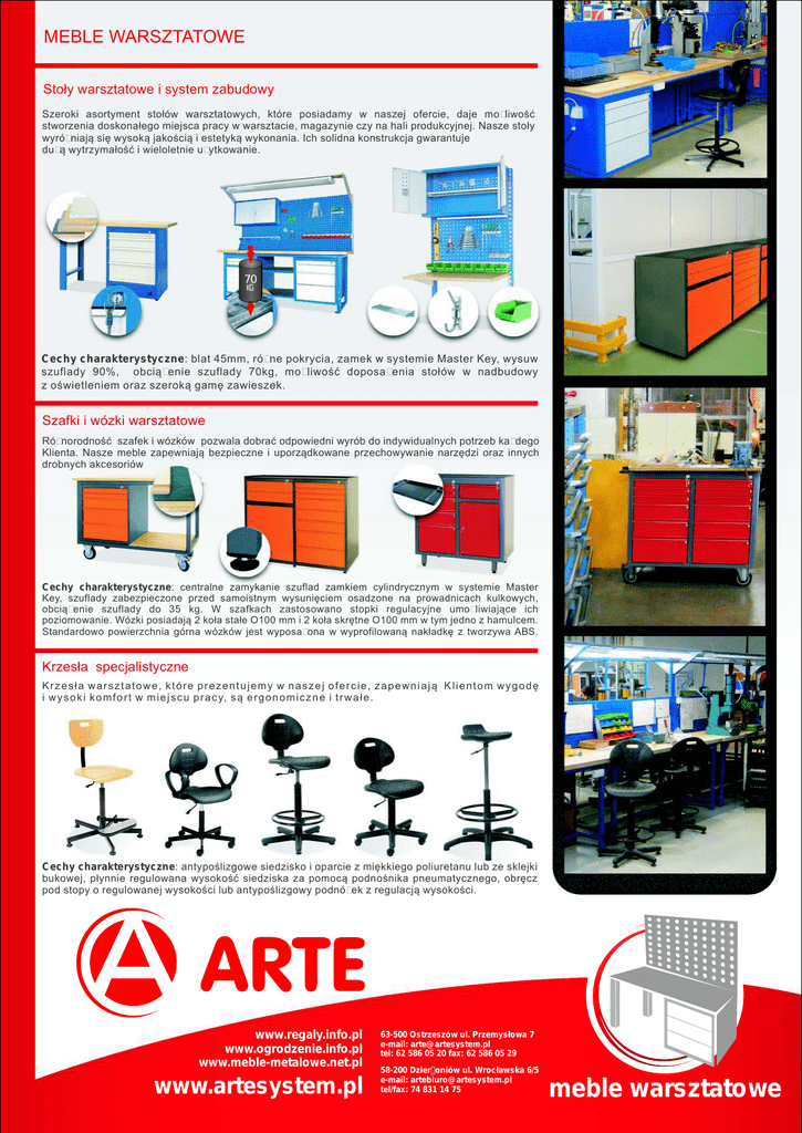 MEBLE WARSZTATOWE Stoły warsztatowe i system zabudowy Szeroki asortyment stołów warsztatowych, które posiadamy w naszej ofercie, daje możliwość stworzenia doskonałego miejsca pracy w warsztacie, magazynie czy na hali produkcyjnej. Nasze stoły wyróżniają się wysoką jakością i estetyką wykonania. Ich solidna konstrukcja gwarantuje dużą wytrzymałość i wieloletnie użytkowanie. 70 KG Cechy charakterystyczne: blat 45mm, różne pokrycia, zamek w systemie Master Key, wysuw szuflady 90%, obciążenie szuflady 70kg, możliwość doposażenia stołów w nadbudowy z oświetleniem oraz szeroką gamę zawieszek. Szafki i wózki warsztatowe Różnorodność szafek i wózków pozwala dobrać odpowiedni wyrób do indywidualnych potrzeb każdego Klienta. Nasze meble zapewniają bezpieczne i uporządkowane przechowywanie narzędzi oraz innych drobnych akcesoriów Cechy charakterystyczne: centralne zamykanie szuflad zamkiem cylindrycznym w systemie Master Key, szuflady zabezpieczone przed samoistnym wysunięciem osadzone na prowadnicach kulkowych, obciążenie szuflady do 35 kg. W szafkach zastosowano stopki regulacyjne umożliwiające ich poziomowanie. Wózki posiadają 2 koła stałe O100 mm i 2 koła skrętne O100 mm w tym jedno z hamulcem. Standardowo powierzchnia górna wózków jest wyposażona w wyprofilowaną nakładkę z tworzywa ABS. Krzesła specjalistyczne Krzesła warsztatowe, które prezentujemy w naszej ofercie, zapewniają Klientom wygodę i w y s o k i k o m f o r t w m i e j s c u p r a c y, s ą e r g o n o m i c z n e i t r w a ł e . Cechy charakterystyczne: antypoślizgowe siedzisko i oparcie z miękkiego poliuretanu lub ze sklejki bukowej, płynnie regulowana wysokość siedziska za pomocą podnośnika pneumatycznego, obręcz pod stopy o regulowanej wysokości lub antypoślizgowy podnóżek z regulacją wysokości. www.regaly.info.pl www.ogrodzenie.info.pl www.meble-metalowe.net.pl www.artesystem.pl 63-500 Ostrzeszów ul. Przemysłowa 7 e-mail: [email protected] tel: 62 586 05 20 fax: 62 586 05 29 58-200 Dzierżoniów ul. Wrocławska 6/5 e-mail: [email protected] tel/fax: 74 831 14 75 meble warsztatowe MEBLE METALOWE Szafy BHP Szafy ubraniowe pozwalają na estetyczne i funkcjonalne wyposażenie pomieszczeń socjalnych dla pracowników. Dostępne są w dwóch wersjach: szerokość komór 300mm i 400mm. Drzwi posiadają szczeliny zapewniające prawidłową wentylację i wytłoczenie przeznaczone na etykietę, zamykane są zamkiem cylindrycznym w systemie Master Key. Opcjonalne szafy można wyposażyć w daszek skośny i ławkę. Szafy schowkowe i śniadaniowe Szafy schowkowe mają szerokie zastosowanie w przedszkolach, szkołach, siłowniach, supermarketach oraz zakładach pracy. Szeroka gama produktów gwarantuje ich funkcjonalność oraz pozwala dobrać szafę do indywidualnych potrzeb każdego Klienta. Szafy schowkowe można dodatkowo wyposażyć w nóżki lub cokół oraz daszek skośny. Szafki śniadaniowe umożliwiają przechowywanie przez pracowników produktów żywnościowych w opakowaniach zgodnie z wymogami BHP. Występują także w wersji do zawieszania na ścianie. Szafy uniwersalne i szafy na komputer Szafy uniwersalne można wykorzystać zarówno w biurze, jak i w warsztacie do przechowywania dokumentów oraz innych przedmiotów. Posiadają 3-punktowy zamek cylindryczny w systemie Master Key, stopki regulacyjne umożliwiające poziomowanie szafy. Szafy na komputer zapewniają bezpieczne przechowywanie i użytkowanie sprzętu komputerowego w zakładzie pracy. Można w nich umieścić monitor LCD lub tradycyjny do 19”. www.regaly.info.pl www.ogrodzenie.info.pl www.meble-metalowe.net.pl www.artesystem.pl 63-500 Ostrzeszów ul. Przemysłowa 7 e-mail: [email protected] tel: 62 586 05 20 fax: 62 586 05 29 58-200 Dzierżoniów ul. Wrocławska 6/5 e-mail: [email protected] tel/fax: 74 831 14 75 meble metalowe