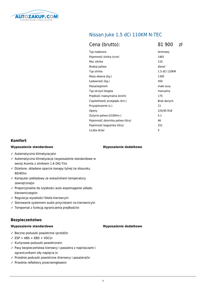 Nissan Juke 1.5 dCi 110KM N-TEC Cena (brutto): 81 900 Typ nadwozia terenowy Pojemność silnika (ccm) 1461 Moc silnika 110 Rodzaj paliwa diesel Typ silnika 1.5 dCi 110KM Masa własna (kg.) 1300 Ładowność (kg.) 450 Klasa/segment małe suvy Typ skrzyni biegów manualna Prędkość maksymalna (km/h) 175 Częstotliwość przeglądu (km.) Brak danych Przyspieszenie (s.) 11 Opony 225/45 R18 Zużycie paliwa (l/100km.) 5.1 Pojemność zbiornika paliwa (litry) 46 Pojemność bagażnika (litry) 251 Liczba drzwi 5 Komfort Wyposażenie standardowe Wyposażenie dodatkowe ✓ Automatyczna klimatyzacja\n ✓ Automatyczna klimatyzacja (wyposażenie standardowe w wersji Acenta z silnikiem 1.6 DIG-T)\n ✓ Dzielone, składane oparcie kanapy tylnej (w stosunku 60/40)\n ✓ Komputer pokładowy ze wskaźnikiem temperatury zewnętrznej\n ✓ Proporcjonalne do szybkości auta wspomaganie układu kierowniczego\n ✓ Regulacja wysokości fotela kierowcy\n ✓ Sterowanie systemem audio przyciskami na kierownicy\n ✓ Tempomat z funkcją ograniczenia prędkości\n Bezpieczeństwo Wyposażenie standardowe Wyposażenie dodatkowe ✓ Boczne poduszki powietrzne (przód)\n ✓ ESP + ABS + EBD + VDC\n ✓ Kurtynowe poduszki powietrzne\n ✓ Pasy bezpieczeństwa kierowcy i pasażera z napinaczami i ogranicznikami siły napięcia.\n ✓ Przednie poduszki powietrzne (kierowcy i pasażera)\n ✓ Przednie reflektory przeciwmgłowe\n 1 zł ✓ Regulowana wysokość mocowania przednich pasów bezpieczeństwa\n ✓ Sygnalizator braku zapięcia pasów bezpieczeństwa (światło i brzęczyk) kierowcy i pasażerów\n ✓ Trzypunktowe pasy bezpieczeństwa dla wszystkich miejsc\n ✓ Wyłącznik przedniej poduszki pasażera\n ✓ Zabezpieczenie drzwi tylnych przed otwarciem przez dzieci\n ✓ Zagłówki wszystkich foteli tylnych\n Dodatki Wyposażenie standardowe Wyposażenie dodatkowe ✓ 18" felgi ze stopów metali lekkich "n-tec" ✕ Lakier metalizowany 1800 PLN ✓ Aluminiowe nakładki pedałów (dla modeli z silnikiem DIG-T) ✕ NISSAN 5 Rozszerzona Gwarancja do 4 lat lub 100 000 km 900 PLN ✓ Centralny zamek sterowany pilotem ✕ NISSAN 5 Rozszerzona Gwarancja do 5 lat lub 150 000 km 2280 PLN ✓ Czarna podsufitka ( dla modeli z silnikiem DIG-T)\n ✓ Czarne lśniące osłony lusterek oraz słupek B\n ✓ Czarne wypełnienia świateł postojowych\n ✓ Dojazdowe koło zapasowe\n ✓ Elektrycznie regulowane szyby boczne z przodu i z tyłu + funkcja jedno naciśnięcie góra/dół po stronie kierowcy\n ✓ Gniazdo 12V -1x\n ✓ Gniazdo USB\n ✓ Immobilizer\n ✓ Kierownica i dźwignia zmiany biegów pokryte skórą\n ✓ Kieszeń w oparciu fotela pasażera\n ✓ Kieszenie w przednich i tylnych drzwiach\n ✓ Konsola centralna i panele drzwi w kolorze lśniącej czerni\n ✓ Konsola centralna z uchwytami na kubki\n ✓ Lusterka zewnętrzne regulowane elektrycznie\n ✓ Nissan Connect 2.0* ( 5.8" kolorowy wyświetlacz dotykowy LCD + gniazdo USB i MP3, iPod + tylna kamera ułatwiająca cofanie + 6 głośników)\n ✓ Nissan Dynamic Control System\n ✓ Nissan Dynamic Control System (wyposażenie standardowe w wersji Acenta z silnikiem 1.6 DIG-T)\n ✓ Podwójne rury wydechowe (dla modeli z silnikiem DIG-T)\n ✓ Przednie reflektory halogenowe z ręczną regulacją wysokości\n ✓ Przyciemniane szyby\n ✓ Punkty mocujące bagażnika dachowego\n ✓ Punkty zaczepu fotelika dla dziecka ISOFIX przy tylnych zewnętrznych fotelach\n ✓ Regulacja położenia kolumny kierownicy\n ✓ Schowek z przodu (po stronie pasażera)\n ✓ Sportowe siedzienia (czarne, czerwone lub jasnoszare)\n ✓ 2 System Bluetooth\n 3 ✓ Wycieraczki szyby przedniej i tylnej z regulowaną częstotliwością pracy i ze spryskiwaczem\n ✓ Zewnętrzne klamki drzwi w kolorze nadwozia (niedostępne dla wersji Visia Plus z silnikiem 1.5 dCi)\n Doprecyzowanie oferty Kontakt: Nazwa użytkownika: admin Nazwa firmy: qqq Adres: qqq 12, 41-706 qqq1, NIP: 954 REGON: 1 Telefon: 123, 1 Fax: 1 Email: 1 www: 4