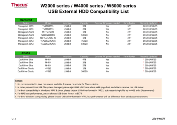 W2000 series / W4000 series / W5000 series USB External HDD Compatibility List Transcend Series StorageJet 35T3 StorageJet 35T3 StorageJet 25M3 StorageJet 25M3 StorageJet 25A3 StorageJet 25A3 StorageJet 25A3 Model TS3TSJ35T3 TS2TSJ35T3 TS1TSJ25M3 TS500GSJ25M3 TS1TSJ25A3K/-W TS750GSJ25A3K TS500GSJ25A3K Interface USB3.0 USB3.0 USB3.0 USB3.0 USB3.0 USB3.0 USB3.0 Capacity 3TB 2TB 1TB 500GB 1TB 750GB 500GB External AC power needed Yes Yes No No No No No Form Factor 3.5" 3.5" 2.5" 2.5" 2.5" 2.5" 2.5" Recently Updated * OK 2013/12/05 OK 2013/12/05 OK 2013/12/05 OK 2013/12/05 OK 2013/12/05 OK 2013/12/05 OK 2013/12/05 Model NH03 NH03 NH03 HV610 HV610 Interface USB3.0 USB3.0 USB3.0 USB3.0 USB3.0 Capacity 4TB 3TB 2TB 1TB 500GB External AC power needed Yes Yes Yes No No Form Factor Recently Updated * * 2014/09/29 * 2014/09/29 * 2014/09/29 * 2014/09/29 * 2014/09/29 ADATA Series DashDrive Elite DashDrive Elite DashDrive Elite DashDrive Classic DashDrive Classic Notes: 1. It's recommended to have the newest available firmware or update for Thecus device. 2. In order pervent from USB file system damaged, please eject USB HDD from admin WEB page first, and able to remove the USB driver. 3. For best compatibility in Windows, MAC & Linux, please choose USB driver format in FAT32, but support single file up to 4GB only. (Recommend) 4. For NAS best performance, please choose USB driver format in EXT4. 5. For best Windows compatibilty, please choose USB driver format in NTFS, but perfromance will be difference from Windows environment. V1.1 2014/10/25