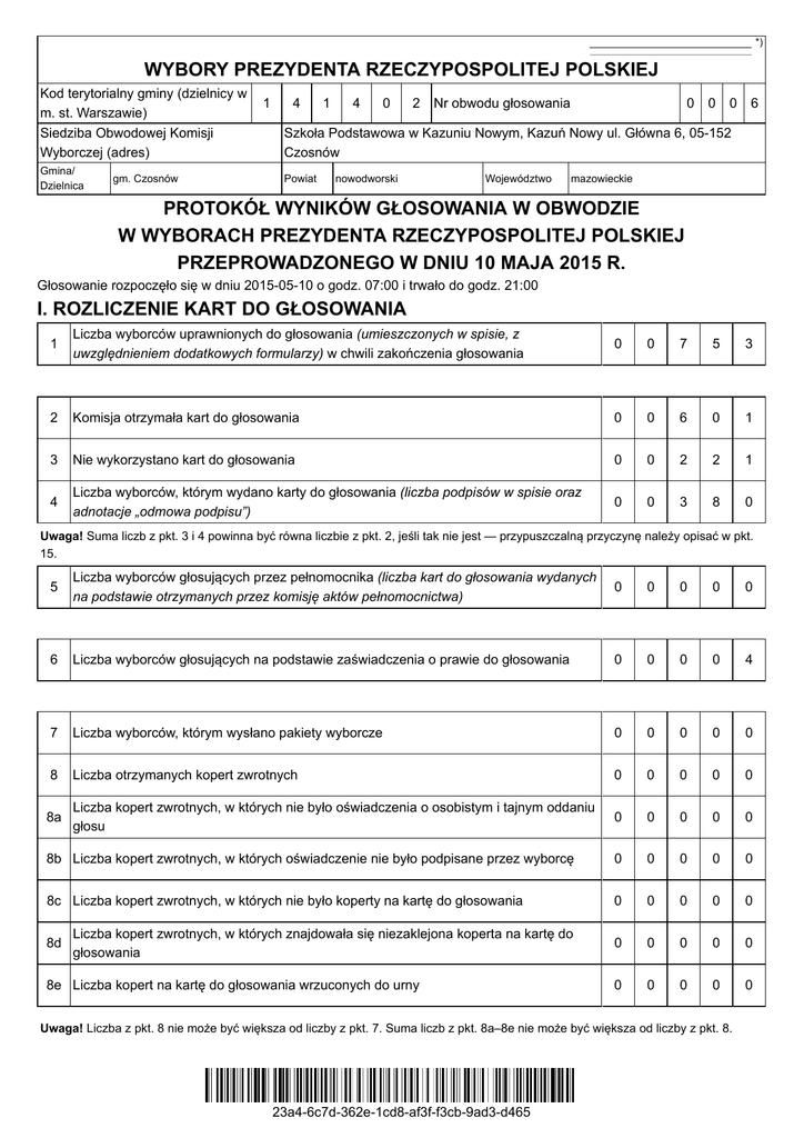 -1 *) WYBORY PREZYDENTA RZECZYPOSPOLITEJ POLSKIEJ Kod terytorialny gminy (dzielnicy w m. st. Warszawie) Siedziba Obwodowej Komisji Wyborczej (adres) Gmina/ Dzielnica gm. Czosnów 1 4 1 4 0 2 Nr obwodu głosowania 0 0 0 6 Szkoła Podstawowa w Kazuniu Nowym, Kazuń Nowy ul. Główna 6, 05-152 Czosnów Powiat nowodworski Województwo mazowieckie PROTOKÓŁ WYNIKÓW GŁOSOWANIA W OBWODZIE W WYBORACH PREZYDENTA RZECZYPOSPOLITEJ POLSKIEJ PRZEPROWADZONEGO W DNIU 10 MAJA 2015 R. Głosowanie rozpoczęło się w dniu 2015-05-10 o godz. 07:00 i trwało do godz. 21:00 I. ROZLICZENIE KART DO GŁOSOWANIA 1 Liczba wyborców uprawnionych do głosowania (umieszczonych w spisie, z uwzględnieniem dodatkowych formularzy) w chwili zakończenia głosowania 0 0 7 5 3 2 Komisja otrzymała kart do głosowania 0 0 6 0 1 3 Nie wykorzystano kart do głosowania 0 0 2 2 1 4 Liczba wyborców, którym wydano karty do głosowania (liczba podpisów w spisie oraz adnotacje „odmowa podpisu”) 0 0 3 8 0 Uwaga! Suma liczb z pkt. 3 i 4 powinna być równa liczbie z pkt. 2, jeśli tak nie jest — przypuszczalną przyczynę należy opisać w pkt. 15. 5 Liczba wyborców głosujących przez pełnomocnika (liczba kart do głosowania wydanych na podstawie otrzymanych przez komisję aktów pełnomocnictwa) 0 0 0 0 0 6 Liczba wyborców głosujących na podstawie zaświadczenia o prawie do głosowania 0 0 0 0 4 7 Liczba wyborców, którym wysłano pakiety wyborcze 0 0 0 0 0 8 Liczba otrzymanych kopert zwrotnych 0 0 0 0 0 8a Liczba kopert zwrotnych, w których nie było oświadczenia o osobistym i tajnym oddaniu głosu 0 0 0 0 0 8b Liczba kopert zwrotnych, w których oświadczenie nie było podpisane przez wyborcę 0 0 0 0 0 8c Liczba kopert zwrotnych, w których nie było koperty na kartę do głosowania 0 0 0 0 0 0 0 0 0 0 0 0 0 0 0 8d Liczba kopert zwrotnych, w których znajdowała się niezaklejona koperta na kartę do głosowania 8e Liczba kopert na kartę do głosowania wrzuconych do urny Uwaga! Liczba z pkt. 8 nie może być większa od liczby z pkt. 7. Suma liczb z pkt. 8a–8e nie może być większa od liczby z pkt. 8. 23a4-6c7d-362e-1cd8-af3f-f3cb-9ad3-d465 -2- II. USTALENIE WYNIKÓW GŁOSOWANIA Komisja stwierdziła, że pieczęcie na urnie pozostały nienaruszone. Po wyjęciu kart z urny Komisja ustaliła na ich podstawie następujące wyniki głosowania: 9 Liczba kart wyjętych z urny 9a w tym liczba kart wyjętych z kopert na kartę do głosowania 0 0 3 8 0 0 0 0 0 0 Uwaga! Liczba z pkt. 9 pomniejszona o liczbę z pkt. 9a powinna być równa liczbie z pkt. 4. Dodatkowo liczba z pkt. 9a nie powinna być większa od liczby z pkt. 8e; jeśli tak nie jest — przypuszczalną przyczynę należy opisać w punkcie 16. Liczba kart nieważnych (innych niż urzędowo ustalone lub nieopatrzonych pieczęcią obwodowej komisji wyborczej) 0 0 0 0 0 0 0 3 8 0 12 Liczba głosów nieważnych (z kart ważnych) 0 0 0 0 4 13 Liczba głosów ważnych oddanych łącznie na wszystkich kandydatów (z kart ważnych) 0 0 3 7 6 10 11 Liczba kart ważnych Uwaga! Suma liczb z pkt. 10 i 11 musi być równa liczbie z pkt. 9. Jeśli w pkt. 10 liczba jest większa niż 0, przyczynę należy opisać w pkt. 17. Uwaga! Suma liczb z pkt. 12 i 13 musi być równa liczbie z pkt. 11. 14. Na poszczególnych kandydatów na Prezydenta Rzeczypospolitej Polskiej oddano następujące liczby głosów ważnych: Lp. Nazwisko i imię - imiona Liczba głosów ważnych 1. BRAUN Grzegorz Michał 0 0 0 0 3 2. DUDA Andrzej Sebastian 0 0 1 0 9 3. JARUBAS Adam Sebastian 0 0 0 0 9 4. KOMOROWSKI Bronisław Maria 0 0 1 5 4 5. KORWIN-MIKKE Janusz Ryszard 0 0 0 1 2 6. KOWALSKI Marian Janusz 0 0 0 0 4 7. KUKIZ Paweł Piotr 0 0 0 6 8 8. OGÓREK Magdalena Agnieszka 0 0 0 1 4 9. PALIKOT Janusz Marian 0 0 0 0 0 10. TANAJNO Paweł Jan 0 0 0 0 0 23a4-6c7d-362e-1cd8-af3f-f3cb-9ad3-d465 -311. WILK Jacek Razem 0 0 0 0 3 0 0 3 7 6 Uwaga! Suma głosów ważnych oddanych na wszystkich kandydatów (rubryka „Razem”) musi być równa liczbie z pkt 13, czyli liczbie głosów ważnych oddanych łącznie na wszystkich kandydatów. III. UWAGI I ADNOTACJE 15. **) Uwagi o przypuszczalnej przyczynie ewentualnej różnicy pomiędzy sumą liczb z pkt. 3 i 4 a liczbą z pkt. 2; jeżeli różnica nie występuje, wpisać „brak uwag”: brak uwag **) 16. Uwagi o przypuszczalnej przyczynie ewentualnej różnicy pomiędzy liczbą z pkt. 9 pomniejszoną o liczbę z pkt. 9a a liczbą z pkt. 4, a także o przypuszczalnej przyczynie ewentualnej różnicy pomiędzy liczbą z pkt. 9a a liczbą z pkt. 8e; jeżeli różnice nie występują, wpisać „brak uwag”: brak uwag 17. **) Uwagi o przypuszczalnej przyczynie wystąpienia kart nieważnych (pkt 10); jeżeli liczba w pkt. 10 wynosi 0, wpisać „brak uwag”: brak uwag **) 18. W trakcie głosowania wydano następujące zarządzenia; jeżeli nie wydano, wpisać „brak zarządzeń”: brak zarządzeń 19. **) Adnotacja o wniesieniu uwag przez mężów zaufania z wymienieniem konkretnych zarzutów***); jeżeli nie ma, wpisać „brak zarzutów” lub „brak mężów zaufania w obwodzie”: brak mężów zaufania w obwodzie 20. **) Adnotacja o wniesieniu uwag przez członków Komisji z wymienieniem konkretnych zarzutów***); jeżeli nie ma, wpisać „brak zarzutów”: brak zarzutów **) 21. Inne uwagi; jeżeli nie ma, wpisać „brak uwag”: brak uwag Przy sporządzeniu protokołu obecni byli członkowie Komisji: 1) Waliszkiewicz Katarzyna Przewodniczący 2) Krzywa Krystyna Janina Zastępca Przewodniczącego 3) Bielecki Tomasz Piotr Członek 4) Mazur Marek Członek 5) Milewski Piotr Michał Członek 6) Walczak Alina Grażyna Członek 23a4-6c7d-362e-1cd8-af3f-f3cb-9ad3-d465 -47) Żak Iwona Ewa Członek *) W ponownym głosowaniu wpisać wyraz „PONOWNE”. treść dotycząca danego punktu protokołu nie mieści się na formularzu, należy dołączyć ją do protokołu, zaznaczając to w odpowiednim punkcie protokołu. ***) W razie zgłoszenia uwag przez 