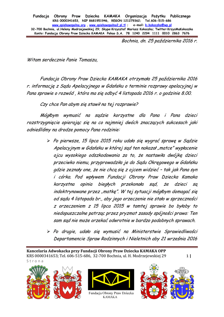 Fundacja Obrony Praw Dziecka KAMAKA Organizacja Pożytku Publicznego KRS 0000341653, NIP 8681951946, REGON 121279362; Tel.606-515-686 www.opiekawspolna.org , www.opiekawspolna2.pl.tl ; e-mail: [email protected] 32-700 Bochnia, ul.Heleny Modrzejewskiej 29; Skype:Krzysztof Mariusz Kokoszka; Twitter:KrzysMaKokoszka Konto: Fundacja Obrony Praw Dziecka KAMAKA Pekao S.A. 78 1240 2294 1111 0010 2863 7676 Bochnia, dn. 25 października 2016 r. Witam serdecznie Panie Tomaszu, Fundacja Obrony Praw Dziecka KAMAKA otrzymała 25 października 2016 r. informację z Sądu Apelacyjnego w Gdańsku o terminie rozprawy apelacyjnej w Pana sprawie o rozwód , która ma się odbyć 4 listopada 2016 r. o godzinie 8.00. Czy chce Pan abym się stawił na tej rozprawie? Mógłbym wymusić na sądzie korzystne dla Pana i Pana dzieci rozstrzygnięcie opierając się na co najmniej dwóch znaczących sukcesach jaki odnieśliśmy na drodze pomocy Pana rodzinie: Po pierwsze, 15 lipca 2015 roku udało się wygrać sprawę w Sądzie Apelacyjnym w Gdańsku w której sąd ten nakazał „matce” wypłacenie ojcu wysokiego odszkodowania za to, że nastawiła dwójkę dzieci przeciwko niemu, przyprowadziła je do Sądu Okręgowego w Gdańsku gdzie zeznały one, że nie chcą się z ojcem widzieć – tak jak Pana syn i córka. Pod wpływem Fundacji Obrony Praw Dziecka Kamaka korzystna opinia biegłych przekonała sąd, że dzieci są indoktrynowane przez „matkę”. W tej sytuacji mógłbym domagać się od sądu 4 listopada br., aby jego orzeczenie nie stało w sprzeczności z orzeczeniem z 15 lipca 2015 w tamtej sprawie bo byłoby to niedopuszczalne patrząc przez pryzmat zasady spójności prawa: Ten sam sąd nie może orzekać odwrotnie w bardzo podobnych sprawach. Po drugie, udało się wymusić na Ministerstwie Sprawiedliwości Departamencie Spraw Rodzinnych i Nieletnich aby 21 września 2016 Kancelaria Adwokacka przy Fundacji Obrony Praw Dziecka KAMAKA OPP KRS 0000341653; Tel. 606-515-686, 32-700 Bochnia, ul. H. Modrzejewskiej 29 Strona 1| Fundacja Obrony Praw Dziecka KAMAKA Organizacja Pożytku Publicznego KRS 0000341653, NIP 8681951946, REGON 121279362; Tel.606-515-686 www.opiekawspolna.org , www.opiekawspolna2.pl.tl ; e-mail: [email protected] 32-700 Bochnia, ul.Heleny Modrzejewskiej 29; Skype:Krzysztof Mariusz Kokoszka; Twitter:KrzysMaKokoszka Konto: Fundacja Obrony Praw Dziecka KAMAKA Pekao S.A. 78 1240 2294 1111 0010 2863 7676 r. przesłanie do Prezes Sądu Apelacyjnego w Gdańsku sędzi Annie Skupnej dezyderatu w którym zobowiązuje ją i wszystkich podległych jej sędziów, kuratorów, biegłych, mediatorów itd. do przeciwdziałania alienacji rodzicielskiej. Pana przypadek przedstawiliśmy też na kilku konferencjach. W tym na konferencji w Sejmie. Zapoznałem też z nim osobiście w październiku br. aktualnego Rzecznika Praw Obywatelskich Adama Bodnara i byłego RPO prof. Andrzeja Zolla, a także kilka instytucji międzynarodowych, w tym Komisarza Praw Człowieka Rady Europy Nilsa Muižnieksa w lutym 2016 roku, w trakcie bezpośrednich rozmów z organizacjami pozarządowymi podczas jego częstych wizyt w Polsce. Pod naciskiem tych faktów i dokumentów które przedłożę sądowi musiałby orzec on zgodnie z Pana oczekiwaniami. Z wyrazami szacunku, Za Fundację Obrony Praw Dziecka Krzysztof Mariusz Kokoszka Biegły z zakresu problematyki alienacji rodzicielskiej p.o. Prezes Zarządu Fundacji Obrony Praw Dziecka Kamaka Pełnomocnik Obywatelskiego Komitetu Inicjatyw Ustawodawczych Opieki Wspólnej Kancelaria Adwokacka przy Fundacji Obrony Praw Dziecka KAMAKA OPP KRS 0000341653; Tel. 606-515-686, 32-700 Bochnia, ul. H. Modrzejewskiej 29 Strona 2| Fundacja Obrony Praw Dziecka KAMAKA Organizacja Pożytku Publicznego KRS 0000341653, NIP 8681951946, REGON 121279362; Tel.606-515-686 www.opiekawspolna.org , www.opiekawspolna2.pl.tl ; e-mail: [email protected] 32-700 Bochnia, ul.Heleny Modrzejewskiej 29; Skype:Krzysztof Mariusz Kokoszka; Twitter:KrzysMaKokoszka Konto: Fundacja Obrony Praw Dziecka KAMAKA Pekao S.A. 78 1240 2294 1111 0010 2863 7676 Fundacja Obrony Praw Dziecka KAMAKA Organizacja Pożytku Publicznego KRS 0000341653, NIP 8681951946, REGON 121279362 Tel. 606-515-686 www.opiekawspolna.org, www.opiekawspolna2.pl.tl Siedziba: 32-700 Bochnia, ul. H. Modrzejewskiej 29 Kancelaria Adwokacka przy Fundacji Obrony Praw Dziecka KAMAKA OPP KRS 0000341653; Tel. 606-515-686, 32-700 Bochnia, ul. H. Modrzejewskiej 29 Strona 3| Fundacja Obrony Praw Dziecka KAMAKA Organizacja Pożytku Publicznego KRS 0000341653, NIP 8681951946, REGON 121279362; Tel.606-515-686 www.opiekawspolna.org , www.opiekawspolna2.pl.tl ; e-mail: [email protected] 32-700 Bochnia, ul.Heleny Modrzejewskiej 29; Skype:Krzysztof Mariusz Kokoszka; Twitter:KrzysMaKokoszka Konto: Fundacja Obrony Praw Dziecka KAMAKA Pekao S.A. 78 1240 2294 1111 0010 2863 7676 Oddziały krajowe, między innymi, w: Suchej Beskidzkiej, Krakowie, Wrocławiu, Trzebnicy, Bydgoszczy, Toruniu, Zielonej Górze, Gorzowie Wielkopolskim, Opolu, Białymstoku, Katowicach, Kielcach, Krośnie, Olsztynie, Poznaniu, Częstochowie, Żywcu. Oddziały zagraniczne: Los Angeles - Silicon Valley (USA), Londyn, Lancaster (Wielka Brytania), Wenecja, Punta Sabioni, Trepporti (Włochy), Agadir (Maroko) Przy Fundacji OPD KAMAKA OPP działają: 1. Centrum Mediacji i Negocjacji Sądowych; 2. Opiniodawczy Zespół Specjalistów Sądowych, wydający opinie dla sądów, zgodnie z koncepcją równości, niedyskryminacji, opieki wspólnej i dobra dziecka opinie oparte na wynikach badań naukowych, między innymi, Uniwersytetu Jagiellońskiego w Krakowie i zgodne z dwudziestoletnim doświadczeniem biegłych Fundacji Obrony Praw Dziecka w przeciwdziałaniu alienacji rodzicielskiej. Jest to JEDYNY w skali nie tylko ogólnopolskiej, ale również europejskiej, instytut naukowy dysponujący garniturem AUTORSKICH testów i innych narzędzi diagnozujących zjawisko alienacji rodzicielskiej, jego natężenie oraz i