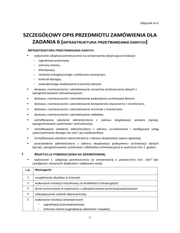 Załącznik nr 6 SZCZEGÓŁOWY OPIS PRZEDMIOTU ZAMÓWIENIA DLA ZADANIA 6 (INFRASTRUKTURA PRZETWARZANIA DANYCH) INFRASTRUKTURA PRZETWARZANIA DANYCH wykonanie adaptacji pomieszczenia na serwerownię obejmująca instalacje: - sygnalizacji pożarowej, - ochrony mienia, - klimatyzacji, - zasilania energetycznego z zasilaczem awaryjnym, - kontroli dostępu, - wewnętrznego okablowania transmisji danych, dostawa, rozmieszczenie i zainstalowanie serwerów przetwarzania danych z oprogramowaniem wirtualizacyjnym, dostawa, rozmieszczenie i zainstalowanie podsystemu archiwizacji danych, dostawa, rozmieszczenie i zainstalowanie komputerów stacjonarne z monitorami, dostawa, rozmieszczenie i zainstalowanie terminali z monitorami, dostawa, rozmieszczenie i zainstalowanie tabletów, certyfikowane szkolenie administratora oprogramowanie systemowe i wirtualizacja), certyfikowane szkolenie administratora z zakresu uruchomienia i konfiguracji usług uwierzytelniania dostępu do sieci i jej użytkowników. 1 z zakresu eksploatacji serwera (sprzęt, Certyfikowane szkolenia administratora z zakresu eksploatacji zapory ogniowej. przeszkolenie administratora z zakresu eksploatacji podsystemu archiwizacji danych (sprzęt, oprogramowanie systemowe i biblioteka archiwizacyjna) w wymiarze min 2. godzin. ADAPTACJA POMIESZCZENIA NA SERWEROWNIĘ. L.p. wykonanie 1. adaptacji pomieszczenia na serwerownię o powierzchni min. 10m2 bez zawilgoceń, otwartych dopływów i odpływów wody. Wymaganie 1. uzupełnienie ubytków w ścianach 2. wykonanie instalacji natynkowej na drabinkach instalacyjnych 3. drzwi wzmocnione w wykonaniu z zabezpieczeniem przeciwwyważeniowym 4. zabezpieczenie stolarki okiennej kratą 5. wykonanie instalacji wewnętrznych: - sygnalizacji przeciwpożarowej, - ochrony mienia (sygnalizacja włamania i napadu), 1 1.1 - klimatyzacji, - zasilanie energetyczne z zasilaczem awaryjnym, - kontroli dostępu, - wewnętrzne okablowanie transmisji danych. INSTALACJA SYGNALIZACJI POŻAROWEJ wykonanie 1. instalacji sygnalizacji pożarowej w pomieszczeniu serwerowni. L.p. Wymaganie 1. modułowa architektura systemu i jego elastyczność pod względem rozbudowy, dotycząca zarówno modułów oprogramowania jak i urządzeń oraz użytkowników 2. identyfikacja zdarzeń pożarowych w początkowej fazie ich powstawania na podstawie źródeł ciepła i zadymienia 3. sygnalizacja zdarzeń pożarowych lokalnie i zdalnie (np. w recepcji, w pomieszczeniu ochrony, itp.) 4. wyzwalania lokalnych akcji gaszenia zdarzeń pożarowych jeśli w obiekcie istnieją automatyczne instalacje przeciwpożarowe 5. współpraca z systemem kontroli dostępu (uruchomienie programu ewakuacji – otwarcia drzwi) 6. monitorowanie stanu zasilaczy awaryjnych w serwerowni i ew. innych (awaria, brak zasilania głównego, brak zasilania rezerwowego) 7. współpraca z instalacją transmisji alarmu do PSP 8. możliwość współpracy z systemami integrującymi i zarządzającymi instalacjami budynkowymi 1.2 INSTALACJA OCHRONY MIENIA L.p. wykonanie 1. instalacji ochrony mienia w pomieszczeniu serwerowni. Wymaganie 1. modułowa architektura systemu i jego elastyczność pod względem rozbudowy, zarówno sprzętowej jak i użytkowników, możliwość korzystania z urządzeń bezprzewodowych 2. obsługa wielu rodzajów czujek (czujek podczerwieni, mikrofalowych ruchu, ultradźwiękowych ruchu, dualnych, zbicia szkła, kontaktronów, sejsmicznych, wibracyjnych, innych) 3. obsługa przycisków alarmowych, obsługa wielu rodzajów urządzeń sygnalizacji alarmu (wizualnego, dźwiękowego) 4. obsługa różnych klawiatur (z/bez wyświetlacza, z czytnikiem kart elektronicznych itp.) 5. komunikacja centrali z pozostałymi komponentami, niezależna od medium komunikacyjnego, obsługa wielu rodzajów mediów komunikacyjnych (IP, ISDN, PSTN, GSM, radiowa, inne) 6. wielostrefowa obsługa wielu linii dozorowych 7. zdalna sygnalizacja zdarzeń (np. recepcja, pomieszczenie ochrony, itp.) 2 8. 1.3 rejestracja, przegląd i wyszukiwanie zdarzeń INSTALACJA KLIMATYZACJI wykonanie 1. instalacji klimatyzacji w pomieszczeniu serwerowni. L.p. Wymaganie 1. montaż dwóch urządzeń, których jednostkowa wydajność będzie umożliwiała pracę pojedynczego urządzenia w sytuacji awaryjnej, w której drugie urządzenie ulegnie uszkodzeniu 2. typ SPLIT 3. osuszanie powietrza 4. chłodzenie 5. zdalne sterowanie pilotem 6. moc min. 7,5kW 1.4 INSTALACJA ZASILANIA ENERGETYCZNEGO Z ZASILACZEM AWARYJNYM L.p. wykonanie 1. instalacji zasilania energetycznego o w pomieszczeniu serwerowni z zasilaczem awaryjnym o mocy 10KW, czasem podtrzymania do 20 minut przy 100% obciążenia i przystosowany do współpracy z generatorem. Wymaganie 1. zasilanie pierwotne jednofazowe 2. napięcie nominalne 230V 3. częstotliwość nominalna 50Hz 4. kształt napięcia czysta sinusoida 5. zniekształcenia harmoniczne maksymalnie 3 i 5% odpowiednio dla obciążeń liniowych i nieliniowych 6. opcja doraźnego przeciążenia od 10 do 25% odpowiednio w okresie do 2 minut i do 5 sekund 7. technologia podwójnej konwersji 8. układ DSP sterujący pracą zasilacza 9. możliwość redundancji (do 2. jednostek) 10. Wysoki współczynnik mocy (99%) 11. akumulatory bezobsługowe z czasem ładowania 5-9h 12. system zarządzania akumulatorami wydłużający ich żywotność 13. ochrona przeciążeniowa, temperaturowa oraz zwarciowa 14. lokalny wyświetlacz LCD 15. tryb oszczędzania energii (ECOMODE) 16. łączność szeregowa i sieciowa ze zdalnym zarządzaniem SNMP 3 17. zdalny dostęp za pomocą przeglądarki w trybie chronionym (SSL) 18. spełniane standardy: 1.5 - bezpieczeństwa - EN50091-1, - emisji elektromagnetycznej (EMC) - EN50091-2, - sprawności - EN62040-3, EN50091-3, - - ochrony - IP20, INSTALACJA KONTROLI DOSTĘPU wykonanie 1. instalacji obejmującej serwerownie i pomieszczenia Sekcji informatyki. L.p. Wymaganie 1. modułowa architektura systemu i jego elastyczność pod względem rozbudowy, dotycząca za