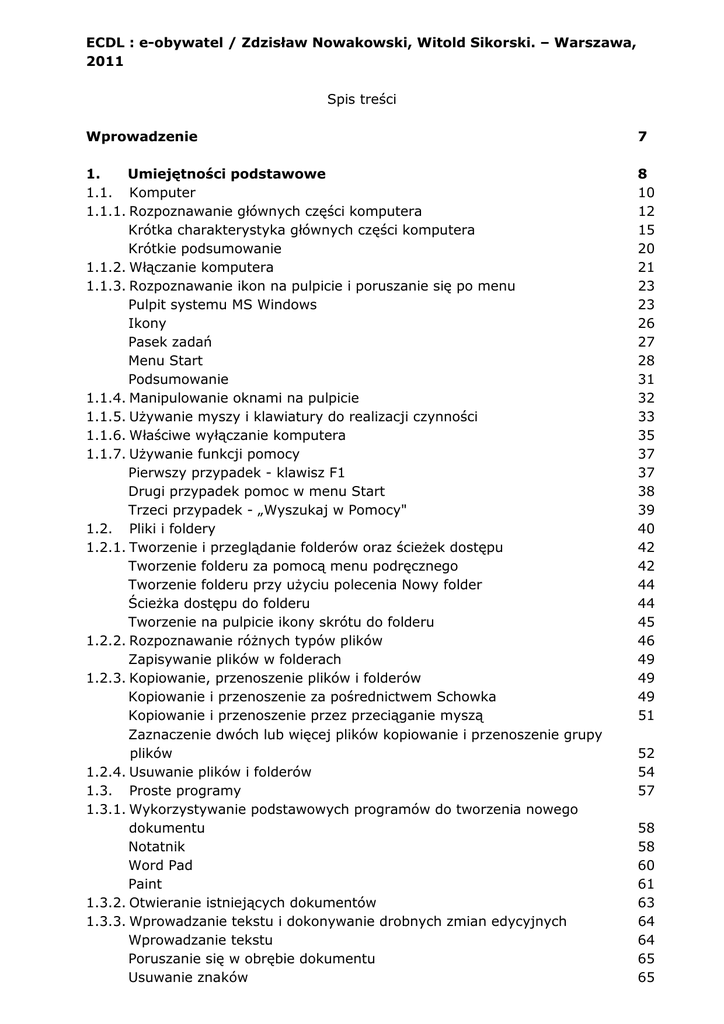 ECDL : e-obywatel / Zdzisław Nowakowski, Witold Sikorski. – Warszawa, 2011 Spis treści Wprowadzenie 7 1. Umiejętności podstawowe 1.1. Komputer 1.1.1. Rozpoznawanie głównych części komputera Krótka charakterystyka głównych części komputera Krótkie podsumowanie 1.1.2. Włączanie komputera 1.1.3. Rozpoznawanie ikon na pulpicie i poruszanie się po menu Pulpit systemu MS Windows Ikony Pasek zadań Menu Start Podsumowanie 1.1.4. Manipulowanie oknami na pulpicie 1.1.5. UŜywanie myszy i klawiatury do realizacji czynności 1.1.6. Właściwe wyłączanie komputera 1.1.7. UŜywanie funkcji pomocy Pierwszy przypadek - klawisz F1 Drugi przypadek pomoc w menu Start Trzeci przypadek - „Wyszukaj w Pomocy" 1.2. Pliki i foldery 1.2.1. Tworzenie i przeglądanie folderów oraz ścieŜek dostępu Tworzenie folderu za pomocą menu podręcznego Tworzenie folderu przy uŜyciu polecenia Nowy folder ŚcieŜka dostępu do folderu Tworzenie na pulpicie ikony skrótu do folderu 1.2.2. Rozpoznawanie róŜnych typów plików Zapisywanie plików w folderach 1.2.3. Kopiowanie, przenoszenie plików i folderów Kopiowanie i przenoszenie za pośrednictwem Schowka Kopiowanie i przenoszenie przez przeciąganie myszą Zaznaczenie dwóch lub więcej plików kopiowanie i przenoszenie grupy plików 1.2.4. Usuwanie plików i folderów 1.3. Proste programy 1.3.1. Wykorzystywanie podstawowych programów do tworzenia nowego dokumentu Notatnik Word Pad Paint 1.3.2. Otwieranie istniejących dokumentów 1.3.3. Wprowadzanie tekstu i dokonywanie drobnych zmian edycyjnych Wprowadzanie tekstu Poruszanie się w obrębie dokumentu Usuwanie znaków 8 10 12 15 20 21 23 23 26 27 28 31 32 33 35 37 37 38 39 40 42 42 44 44 45 46 49 49 49 51 52 54 57 58 58 60 61 63 64 64 65 65 Ustawienie strony Akapit Znak Wstawianie obrazu 1.3.4. Zapisywanie plików w róŜnych formatach 1.3.5. Drukowanie Podstawowe parametry drukowania 1.3.6. Zamykanie programów 1.4. Podstawy korzystania z Internetu 1.4.1. Istota Internetu 1.4.2. Internet oraz World Wide Web (WWW) 1.4.3. Podstawowe terminy 1.4.4. Adres URI 1.4.5. URL w przeglądarce internetowej 1.4.6. Przemieszczanie się po stronach WWW Przeglądarki internetowe Interaktywność stron WWW 1.5. Podstawy poczty elektronicznej 1.5.1. Zrozumienie istoty poczty elektronicznej 1.5.2. Budowa adresu poczty elektronicznej 1.5.3. Zakładamy konto pocztowe 1.5.4. Oprogramowanie do poczty elektronicznej Wybrane linki nawigacyjne 1.5.5. Otwieranie listu poczty elektronicznej, odpowiadanie i przesyłanie dalej 1.5.6. Tworzenie nowej wiadomości z załącznikiem i wysłanie jej 1.5.7. Tworzenie i uaktualnianie ksiąŜki adresowej 1.5.8. Podstawy korzystania z programu Outlook Express Dodanie nowego konta e mail ora/, jego konfigurowanie Odbieranie wiadomości Wysyłanie wiadomości Dodanie adresów do ksiąŜki adresowej 65 66 68 68 68 69 70 71 72 72 75 75 76 77 79 79 80 82 82 83 84 87 89 2. Wyszukiwanie informacji 2.1. Wyszukiwarki 2.1.1. Zasady wyszukiwania 2.1.2. Otwieranie witryn w nowych oknach i kartach 2.1.3. Kopiowanie i wklejanie tekstu i grafiki 2.1.4. Zapisywanie obrazów 2.1.5. Drukowanie wybranych informacji 2.1.6. Ulubione witryny (zakładki) 2.2. Bezpieczeństwo w Internecie 2.2.1. ZagroŜenia przy korzystaniu z poczty elektronicznej 2.2.2. ZagroŜenia związane z witrynami 2.2.3. Programy antywirusowe i zapory sieciowe 2.2.4. Poufność informacji i ich ochrona 2.2.5. Podpis elektroniczny 2.2.6. Nierzetelne oferty i propozycje 2.2.7. Ochrona rodzicielska 2.3. Dostęp do informacji 2.3.1. Serwisy informacyjne 101 101 102 105 106 107 109 110 112 112 114 115 119 120 122 123 123 124 90 91 92 94 95 98 99 99 2.3.2. Serwisy administracji publicznej 2.3.3. Zakupy i kontrola cen 2.3.4. Bankowość internetowa 2.3.5. Rozkłady jazdy i rezerwacje 2.3.6. Edukacja, praca, zdrowie 2.3.7. Informacje biznesowe 2.3.8. Serwisy społecznościowe 2.4. Przykłady zastosowań 2.4.1. Tanie zakupy 2.4.2. Ogłoszenie 2.4.3. Aukcje internetowe 125 128 131 132 137 139 140 140 141 145 147 3. Uczestnictwo w społeczeństwie sieciowym 3.1. Formularze internetowe 3.1.1. Formularz internetowy 3.1.2. Działanie formularza 3.1.3. Elementy kontroli danych 3.1.4. Sprawdzanie dostawców internetowych 3.1.5. Ryzyko wypływu danych z formularza 3.2. Aktywne uczestnictwo 3.2.1. WyraŜanie opinii 3.2.2. Uzyskiwanie informacji drogą elektroniczną 3.2.3. Prawa konsumenta 3.2.4. Udział w grupach zainteresowań 3.2.5. Kontakty na serwisach społecznościowych 3.2.6. Działania w sieciach firmowych 3.2.7. Praca w chmur/e 3.3. Przykłady formularzy 3.3.1. Wniosek internetowy 3.3.2. Umówienie wizyty w urzędzie 150 150 150 156 158 159 161 162 162 164 166 167 168 169 170 171 171 172 4. 177 175 Podsumowanie Indeks Przykładowy test oprac. BPK