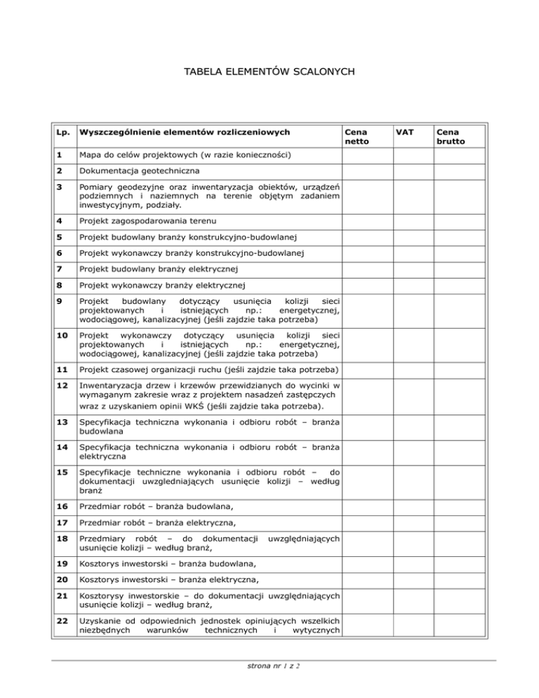 TABELA ELEMENTÓW SCALONYCH Lp. Wyszczególnienie elementów rozliczeniowych 1 Mapa do celów projektowych (w razie konieczności) 2 Dokumentacja geotechniczna 3 Pomiary geodezyjne oraz inwentaryzacja obiektów, urządzeń podziemnych i naziemnych na terenie objętym zadaniem inwestycyjnym, podziały. 4 Projekt zagospodarowania terenu 5 Projekt budowlany branży konstrukcyjno-budowlanej 6 Projekt wykonawczy branży konstrukcyjno-budowlanej 7 Projekt budowlany branży elektrycznej 8 Projekt wykonawczy branży elektrycznej 9 Projekt budowlany dotyczący usunięcia kolizji sieci projektowanych i istniejących np.: energetycznej, wodociągowej, kanalizacyjnej (jeśli zajdzie taka potrzeba) 10 Projekt wykonawczy dotyczący usunięcia kolizji sieci projektowanych i istniejących np.: energetycznej, wodociągowej, kanalizacyjnej (jeśli zajdzie taka potrzeba) 11 Projekt czasowej organizacji ruchu (jeśli zajdzie taka potrzeba) 12 Inwentaryzacja drzew i krzewów przewidzianych do wycinki w wymaganym zakresie wraz z projektem nasadzeń zastępczych wraz z uzyskaniem opinii WKŚ (jeśli zajdzie taka potrzeba). 13 Specyfikacja techniczna wykonania i odbioru robót – branża budowlana 14 Specyfikacja techniczna wykonania i odbioru robót – branża elektryczna 15 Specyfikacje techniczne wykonania i odbioru robót – do dokumentacji uwzgledniających usunięcie kolizji – według branż 16 Przedmiar robót – branża budowlana, 17 Przedmiar robót – branża elektryczna, 18 Przedmiary robót – do dokumentacji usunięcie kolizji – według branż, 19 Kosztorys inwestorski – branża budowlana, 20 Kosztorys inwestorski – branża elektryczna, 21 Kosztorysy inwestorskie – do dokumentacji uwzględniających usunięcie kolizji – według branż, 22 Uzyskanie od odpowiednich jednostek opiniujących wszelkich niezbędnych warunków technicznych i wytycznych uwzględniających strona nr 1 z 2 Cena netto VAT Cena brutto do projektowania 23 Uzyskanie wymaganych prawem: opinii, uzgodnień i pozwoleń. 24 Decyzja o środowiskowych uwarunkowaniach na realizację inwestycji (jeśli zajdzie taka potrzeba) 25 Raport oddziaływania potrzeba) 26 Uzyskanie odpowiedniej decyzji właściwego organu administracji architektoniczno-budowlanej na realizację inwestycji i/lub ewentualne zgłoszenia zamiaru wykonania robót budowlanych, których uzyskanie okaże się niezbędne do prawidłowego wykonania przedmiotu umowy dla zakresu rzeczowego zadania inwestycyjnego. 27 Uzyskanie decyzji o warunkach zabudowy i zagospodarowania terenu, o których mowa w art.4 ust. 2 ustawy o planowaniu i zagospodarowaniu przestrzennym – jeżeli będzie taka konieczność 28 Plan BIOZ 29 INNE na środowisko (jeśli zajdzie RAZEM strona nr 2 z 2 zgody taka