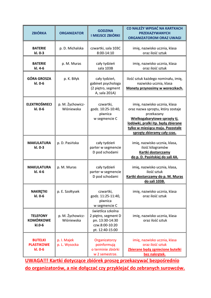 GODZINA I MIEJSCE ZBIÓRKI CO NALEŻY WPISAĆ NA KARTKACH PRZEKAZYWANYCH ORGANIZATOROM ORAZ UWAGI ZBIÓRKA ORGANIZATOR BATERIE kl. 0-3 p. D. Michalska czwartki, sala 103C 8:00-14:10 imię, nazwisko ucznia, klasa oraz ilość sztuk BATERIE kl. 4-6 p. M. Muras cały tydzień sala 103B imię, nazwisko ucznia, klasa oraz ilość sztuk GÓRA GROSZA kl. 0-6 p. K. Biłyk cały tydzień, gabinet psychologa (2 piętro, segment A, sala 201A) ilość sztuk każdego nominału, imię, nazwisko ucznia, klasa Monety przynosimy w woreczkach. ELEKTROŚMIECI kl. 0-6 p. M. ŻychowiczWiśniewska czwartki, godz. 10:25-10:40, piwnica w segmencie C imię, nazwisko ucznia, klasa oraz nazwa sprzętu, który zostaje przekazany Wielkogabarytowe sprzęty tj. lodówki, pralki itp. będą zbierane tylko w miesiącu maju. Pozostałe sprzęty zbieramy cały czas. MAKULATURA kl. 0-3 p. D. Pasińska cały tydzień parter w segmencie D pod schodami imię, nazwisko ucznia, klasa, ilość kilogramów Kartki dostarczamy do p. D. Pasińskiej do sali 4A. MAKULATURA kl. 4-6 p. M. Muras cały tydzień parter w segmencie D pod schodami imię, nazwisko ucznia, klasa, ilość sztuk Kartki dostarczamy do p. M. Muras do sali 103B. p. E. Szołtysek czwartki, godz. 11:25-11:40, piwnica w segmencie C świetlica szkolna 2 piętro, segment D pn. 13:30-14:30 czw.8:00-10:20 pt. 12:40-15:00 imię, nazwisko ucznia, klasa oraz ilość sztuk Organizatorzy poinformują o terminie zbiórki w 2 semestrze. imię, nazwisko ucznia, klasa oraz ilość sztuk Zbierane będą zgniecione butelki bez nakrętek. NAKRĘTKI kl. 0-6 TELEFONY KOMÓRKOWE kl.0-6 p. M. ŻychowiczWiśniewska BUTELKI PLASTIKOWE kl. 0-6 p. I. Majek p. L. Wysocka imię, nazwisko ucznia, klasa oraz ilość sztuk UWAGA!!! Kartki dotyczące zbiórek proszę przekazywać bezpośrednio do organizatorów, a nie dołączać czy przyklejać do zebranych surowców.