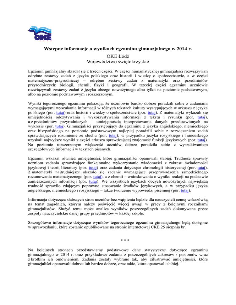 Wstępne informacje o wynikach egzaminu gimnazjalnego w 2014 r. OKE Łódź Województwo świętokrzyskie Egzamin gimnazjalny składał się z trzech części. W części humanistycznej gimnazjaliści rozwiązywali odrębne zestawy zadań z języka polskiego oraz historii i wiedzy o społeczeństwie, a w części matematyczno-przyrodniczej – odrębne zestawy zadań z matematyki oraz przedmiotów przyrodniczych: biologii, chemii, fizyki i geografii. W trzeciej części egzaminu uczniowie rozwiązywali zestawy zadań z języka obcego nowożytnego albo tylko na poziomie podstawowym, albo na poziomie podstawowym i rozszerzonym. Wyniki tegorocznego egzaminu pokazują, że uczniowie bardzo dobrze poradzili sobie z zadaniami wymagającymi wyszukania informacji w różnych tekstach kultury występujących w arkuszu z języka polskiego (por. tutaj) oraz historii i wiedzy o społeczeństwie (por. tutaj). Z matematyki wykazali się umiejętnością odczytywania i wykorzystywania informacji z tekstu i rysunku (por. tutaj), a z przedmiotów przyrodniczych – umiejętnością interpretowania danych przedstawionych na wykresie (por. tutaj). Gimnazjaliści przystępujący do egzaminu z języka angielskiego, niemieckiego oraz hiszpańskiego na poziomie podstawowym najlepiej poradzili sobie z rozwiązaniem zadań sprawdzających rozumienie ze słuchu (por. tutaj); w przypadku języka rosyjskiego i francuskiego uzyskali najwyższe wyniki z części arkusza sprawdzającej znajomość funkcji językowych (por. tutaj). Na poziomie rozszerzonym większość uczniów dobrze poradziła sobie z wyszukiwaniem szczegółowych informacji w tekstach pisanych. Egzamin wskazał również umiejętności, które gimnazjaliści opanowali słabiej. Trudność sprawiły uczniom zadania sprawdzające funkcjonalne wykorzystanie wiadomości z zakresu świadomości językowej i teorii literatury (por. tutaj) oraz zadania dotyczące chronologii historycznej (por. tutaj). Z matematyki najtrudniejsze okazało się zadanie wymagające przeprowadzenia samodzielnego rozumowania matematycznego (por. tutaj), a z chemii – wnioskowania o wyniku reakcji na podstawie zamieszczonych informacji (por. tutaj). We wszystkich językach obcych nowożytnych największą trudność sprawiło zdającym poprawne stosowanie środków językowych, a w przypadku języka angielskiego, niemieckiego i rosyjskiego – także tworzenie wypowiedzi pisemnej (por. tutaj). Informacja dotycząca słabszych stron uczniów bez wątpienia będzie dla nauczycieli cenną wskazówką na temat zagadnień, którym należy poświęcić więcej uwagi w pracy z kolejnymi rocznikami gimnazjalistów. Służyć temu może analiza wyników poszczególnych zadań dokonywana przez zespoły nauczycielskie danej grupy przedmiotów w każdej szkole. Szczegółowe informacje dotyczące wyników tegorocznego egzaminu gimnazjalnego będą dostępne w sprawozdaniu, które zostanie opublikowane na stronie internetowej CKE 25 sierpnia br. *** Na kolejnych stronach przedstawiamy podstawowe dane statystyczne dotyczące egzaminu gimnazjalnego w 2014 r. oraz przykładowe zadania z poszczególnych zakresów / poziomów wraz z krótkim ich omówieniem. Zadania zostały wybrane tak, aby zilustrować umiejętności, które gimnazjaliści opanowali dobrze lub bardzo dobrze, oraz takie, które opanowali słabiej. Do egzaminu gimnazjalnego w kwietniu br. przystąpiło prawie 12 870 spośród 13 0381 uczniów III klasy gimnazjum (99%). W TABELI 1. przedstawiono liczbę uczniów, którzy rozwiązywali zadania w arkuszu w wersji standardowej oraz w arkuszach dostosowanych do potrzeb uczniów z autyzmem, w tym z zespołem Aspergera, niewidzących i słabowidzących, niesłyszących i słabosłyszących oraz z upośledzeniem umysłowym w stopniu lekkim. TABELA 1. LICZBA UCZNIÓW PRZYSTĘPUJĄCYCH DO EGZAMINU GIMNAZJALNEGO W KWIETNIU 2014 R. Część egzaminu i zakres / poziom Część humanistyczna z zakresu historii i wiedzy o społeczeństwie Część humanistyczna z zakresu języka polskiego Część matematyczno-przyrodnicza z zakresu przedmiotów przyrodniczych Część matematyczno-przyrodnicza z zakresu matematyki Część z języka obcego nowożytnego na poziomie podstawowym Część z języka obcego nowożytnego na poziomie rozszerzonym Zestaw zadań w wersji standardowej Zestaw zadań w wersji dostosowanej Razem 12 625 uczniów 241 uczniów 12 866 uczniów 12 622 uczniów 241 uczniów 12 863 uczniów 12 626 uczniów 241 uczniów 12 867 uczniów 12 626 uczniów 241 uczniów 12 867 uczniów 12 625 uczniów 241 uczniów 12 866 uczniów 10 990 uczniów 70 uczniów 11 060 uczniów Pozostali uczniowie przystąpili do egzaminu gimnazjalnego w czerwcu br.2 albo byli zwolnieni z obowiązku przystąpienia do egzaminu gimnazjalnego na warunkach określonych w rozporządzeniu Ministra Edukacji Narodowej3. Zadania we wszystkich zestawach sprawdzały, w jakim stopniu gimnazjaliści spełniają wymagania ogólne i szczegółowe z zakresu dziewięciu przedmiotów egzaminacyjnych określone w podstawie programowej kształcenia ogólnego dla III etapu edukacyjnego. Poszczególne zadania w zestawach egzaminacyjnych mogły również – w myśl zasady kumulatywności przyjętej w podstawie – odnosić się do wymagań przypisanych do wcześniejszych etapów edukacyjnych (I i II). W TABELI 2. przedstawiono podstawowe informacje dotyczące formatu zestawów zadań z sześciu zakresów. 1 Dane pochodzą z SIO (stan na 31 marca 2014 r.). Wyniki egzaminacyjne uczniów, którzy przystąpili do egzaminu gimnazjalnego w czerwcu, nie zostały uwzględnione w niniejszym zestawieniu. 3 Rozporządzenie Ministra Edukacji Narodowej z dnia 30 kwietnia 2007 r. w sprawie warunków i sposobu oceniania, klasyfikowania i promowania uczniów i słuchaczy oraz przeprowadzania sprawdzianów i egzaminów w szkołach publicznych (Dz. U. Nr 83, poz. 562, ze zm.). 2 TABELA 2. FORMAT ZESTAWÓW ZADAŃ EGZAMINU GIMNAZJALNEGO W 2014 R. Cz