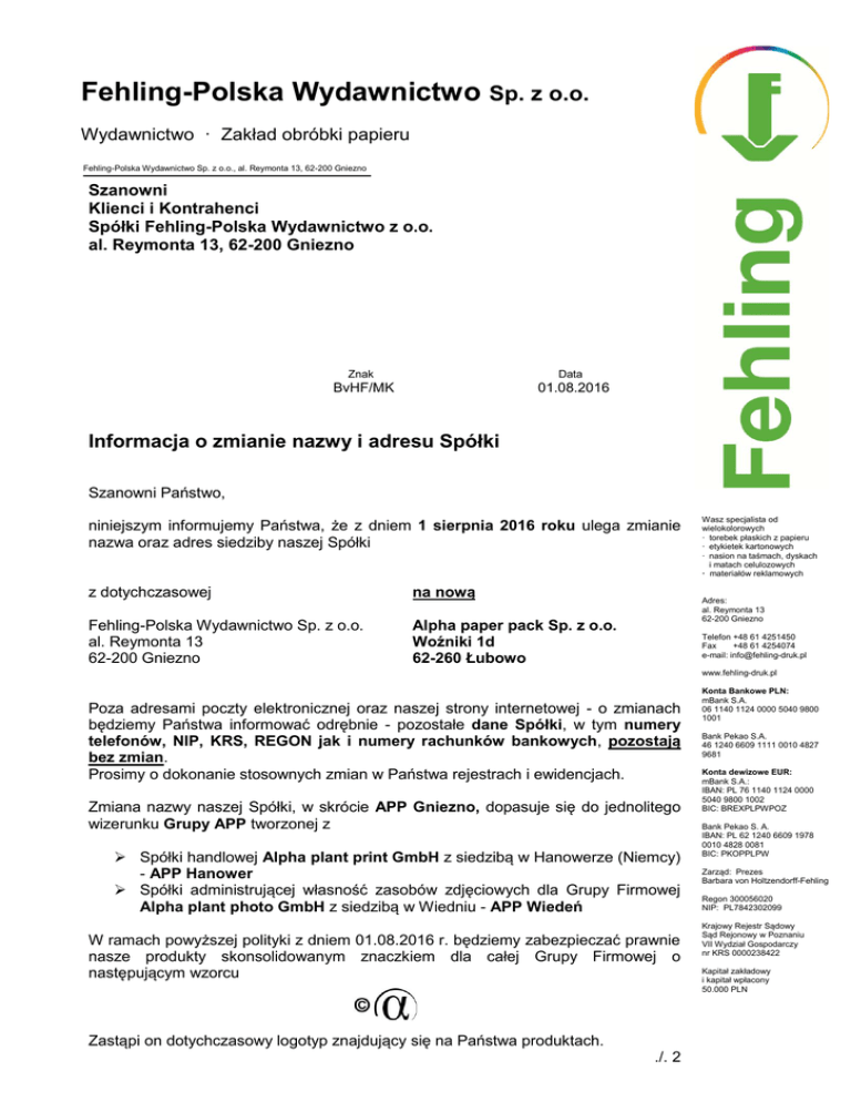 Fehling-Polska Wydawnictwo Sp. z o.o. Wydawnictwo · Zakład obróbki papieru Fehling-Polska Wydawnictwo Sp. z o.o., al. Reymonta 13, 62-200 Gniezno Szanowni Klienci i Kontrahenci Spółki Fehling-Polska Wydawnictwo z o.o. al. Reymonta 13, 62-200 Gniezno Znak Data BvHF/MK 01.08.2016 Informacja o zmianie nazwy i adresu Spółki Szanowni Państwo, niniejszym informujemy Państwa, że z dniem 1 sierpnia 2016 roku ulega zmianie nazwa oraz adres siedziby naszej Spółki z dotychczasowej na nową Fehling-Polska Wydawnictwo Sp. z o.o. al. Reymonta 13 62-200 Gniezno Alpha paper pack Sp. z o.o. Woźniki 1d 62-260 Łubowo Wasz specjalista od wielokolorowych · torebek płaskich z papieru · etykietek kartonowych · nasion na taśmach, dyskach i matach celulozowych · materiałów reklamowych Adres: al. Reymonta 13 62-200 Gniezno Telefon +48 61 4251450 Fax +48 61 4254074 e-mail: [email protected] www.fehling-druk.pl Poza adresami poczty elektronicznej oraz naszej strony internetowej - o zmianach będziemy Państwa informować odrębnie - pozostałe dane Spółki, w tym numery telefonów, NIP, KRS, REGON jak i numery rachunków bankowych, pozostają bez zmian. Prosimy o dokonanie stosownych zmian w Państwa rejestrach i ewidencjach. Zmiana nazwy naszej Spółki, w skrócie APP Gniezno, dopasuje się do jednolitego wizerunku Grupy APP tworzonej z Spółki handlowej Alpha plant print GmbH z siedzibą w Hanowerze (Niemcy) - APP Hanower Spółki administrującej własność zasobów zdjęciowych dla Grupy Firmowej Alpha plant photo GmbH z siedzibą w Wiedniu - APP Wiedeń W ramach powyższej polityki z dniem 01.08.2016 r. będziemy zabezpieczać prawnie nasze produkty skonsolidowanym znaczkiem dla całej Grupy Firmowej o następującym wzorcu Zastąpi on dotychczasowy logotyp znajdujący się na Państwa produktach. ./. 2 Konta Bankowe PLN: mBank S.A. 06 1140 1124 0000 5040 9800 1001 Bank Pekao S.A. 46 1240 6609 1111 0010 4827 9681 Konta dewizowe EUR: mBank S.A.: IBAN: PL 76 1140 1124 0000 5040 9800 1002 BIC: BREXPLPWPOZ Bank Pekao S. A. IBAN: PL 62 1240 6609 1978 0010 4828 0081 BIC: PKOPPLPW Zarząd: Prezes Barbara von Holtzendorff-Fehling Regon 300056020 NIP: PL7842302099 Krajowy Rejestr Sądowy Sąd Rejonowy w Poznaniu VII Wydział Gospodarczy nr KRS 0000238422 Kapitał zakładowy i kapitał wpłacony 50.000 PLN -2- Zmiana nazwy Spółki jak i jej siedziby nie ma wpływu na ważność naszych dotychczasowych warunków handlowych, cenników oraz zawartych wcześniej umów. Równocześnie pragniemy Państwa zapewnić, iż przeniesienie produkcji z dotychczasowych obiektów Spółki do nowego kompleksowego budynku nie będzie miało oddziaływania na terminy realizacji bieżących zleceń. Nasz nowy obiekt produkcyjno-administracyjny o powierzchni użytkowej sięgającej 4.000 m² odpowiada najnowszym standardom produkcyjnym. Powstał z myślą o usprawnieniu naszych operacji gospodarczych jak i lepszego wykorzystania zasobów produkcyjnych. Nowa siedziba umożliwi dalsze rozszerzanie naszej palety produktów i usług. Dokonywane inwestycje zapewnią Państwu najwyższy poziom jakości jak i obsługi w dziedzinie naszych produktów tradycyjnych oraz produktów o charakterze „convenience dla ogrodu”. Mając nadzieję na dalszą dobrą współpracę, pozostajemy z poważaniem Barbara von Holtzendorff-Fehling Monika Kozłowska Prezes Zarządu Wiceprezes Zarządu