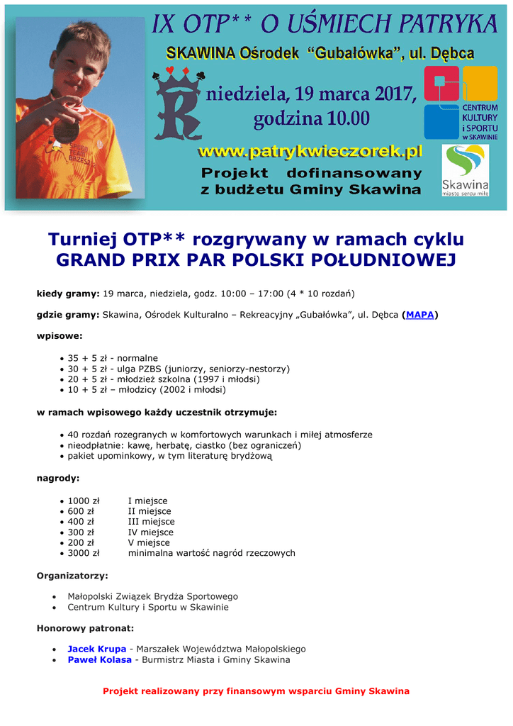 Turniej OTP** rozgrywany w ramach cyklu GRAND PRIX PAR POLSKI POŁUDNIOWEJ kiedy gramy: 19 marca, niedziela, godz. 10:00 – 17:00 (4 * 10 rozdań) gdzie gramy: Skawina, Ośrodek Kulturalno – Rekreacyjny „Gubałówka”, ul. Dębca (MAPA) wpisowe: 35 30 20 10 + + + + 5 5 5 5 zł zł zł zł - normalne - ulga PZBS (juniorzy, seniorzy-nestorzy) - młodzież szkolna (1997 i młodsi) – młodzicy (2002 i młodsi) w ramach wpisowego każdy uczestnik otrzymuje: 40 rozdań rozegranych w komfortowych warunkach i miłej atmosferze nieodpłatnie: kawę, herbatę, ciastko (bez ograniczeń) pakiet upominkowy, w tym literaturę brydżową nagrody: 1000 zł 600 zł 400 zł 300 zł 200 zł 3000 zł I miejsce II miejsce III miejsce IV miejsce V miejsce minimalna wartość nagród rzeczowych Organizatorzy: Małopolski Związek Brydża Sportowego Centrum Kultury i Sportu w Skawinie Honorowy patronat: Jacek Krupa - Marszałek Województwa Małopolskiego Paweł Kolasa - Burmistrz Miasta i Gminy Skawina Projekt realizowany przy finansowym wsparciu Gminy Skawina