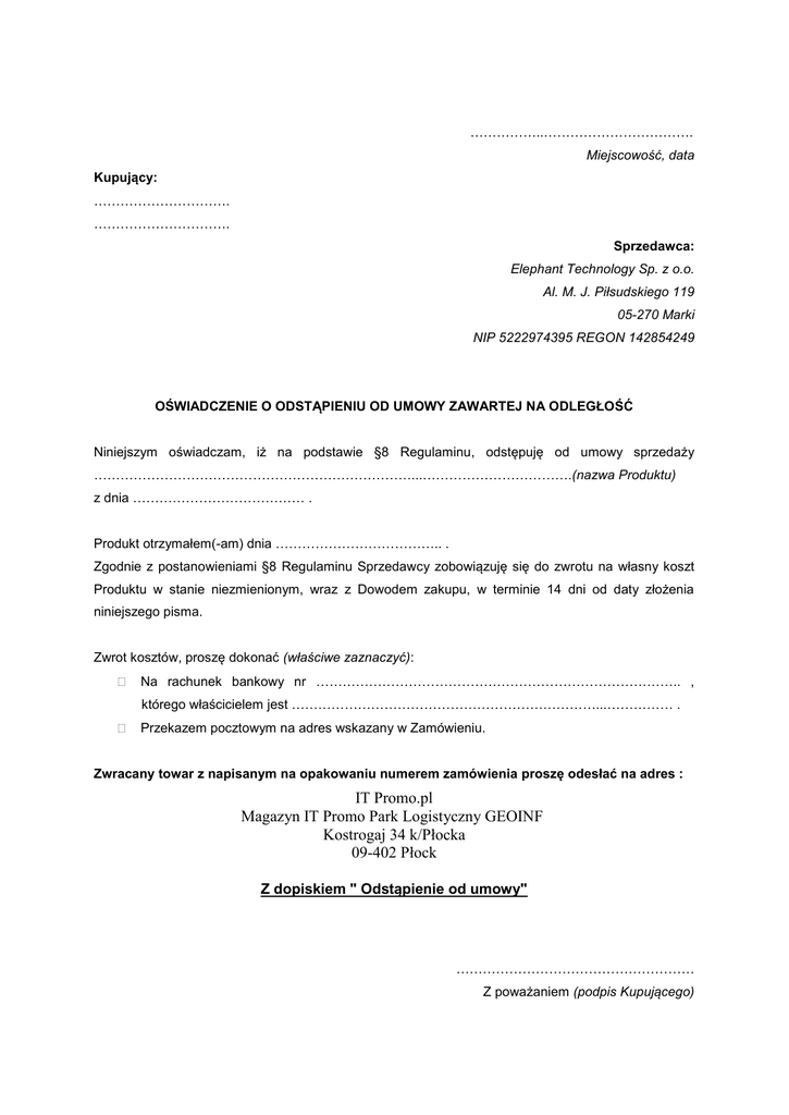 ……………..……………………………. Miejscowość, data Kupujący: …………………………. …………………………. Sprzedawca: Elephant Technology Sp. z o.o. Al. M. J. Piłsudskiego 119 05-270 Marki NIP 5222974395 REGON 142854249 OŚWIADCZENIE O ODSTĄPIENIU OD UMOWY ZAWARTEJ NA ODLEGŁOŚĆ Niniejszym oświadczam, iż na podstawie §8 Regulaminu, odstępuję od umowy sprzedaży ………………………………………………………………...…………………………….(nazwa Produktu) z dnia ………………………………… . Produkt otrzymałem(-am) dnia ……………………………….. . Zgodnie z postanowieniami §8 Regulaminu Sprzedawcy zobowiązuję się do zwrotu na własny koszt Produktu w stanie niezmienionym, wraz z Dowodem zakupu, w terminie 14 dni od daty złożenia niniejszego pisma. Zwrot kosztów, proszę dokonać (właściwe zaznaczyć): Na rachunek bankowy nr ……………………………………………………………………….. , którego właścicielem jest ……………………………………………………………...…………… . Przekazem pocztowym na adres wskazany w Zamówieniu. Zwracany towar z napisanym na opakowaniu numerem zamówienia proszę odesłać na adres : IT Promo.pl Magazyn IT Promo Park Logistyczny GEOINF Kostrogaj 34 k/Płocka 09-402 Płock Z dopiskiem " Odstąpienie od umowy" ……………………………………………… Z poważaniem (podpis Kupującego)