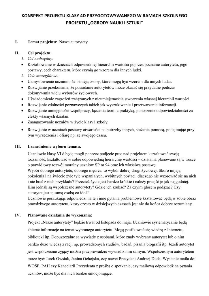KONSPEKT PROJEKTU KLASY 4D PRZYGOTOWYWANEGO W RAMACH SZKOLNEGO PROJEKTU „OGRODY NAUKI I SZTUKI” I. II. Temat projektu: Nasze autorytety. Cel projektu: 1. Cel nadrzędny: Kształtowanie w dzieciach odpowiedniej hierarchii wartości poprzez poznanie autorytetu, jego postawy, cech charakteru, które czynią go wzorem dla innych ludzi. 2. Cele szczegółowe: Uzmysłowienie uczniom, że istnieją osoby, które mogą być wzorem dla innych ludzi. Rozwijanie przekonania, że posiadanie autorytetów może okazać się przydatne podczas dokonywania wielu wyborów życiowych. Uświadomienie zagrożeń związanych z nieumiejętnością stworzenia własnej hierarchii wartości. Rozwijanie zdolności poznawczych takich jak wyszukiwanie i przetwarzanie informacji. Rozwijanie umiejętności współpracy, łączenia teorii z praktyką, ponoszenie odpowiedzialności za efekty własnych działań. Zaangażowanie uczniów w życie klasy i szkoły. III. Rozwijanie w uczniach postawy otwartości na potrzeby innych, służenia pomocą, podejmując przy tym wyrzeczenia i ofiarę np. ze swojego czasu. Uzasadnienie wyboru tematu. Uczniowie klasy VI d będą mogli poprzez podjęcie prac nad projektem kształtować swoją tożsamość, kształtować w sobie odpowiednią hierarchię wartości – działania planowane są w trosce o prawidłowy rozwój moralny uczniów SP nr 94 oraz ich właściwą postawę. Wybór dobrego autorytetu, dobrego mędrca, to wybór dobrej drogi życiowej. Skoro mijają pokolenia i na świecie żyje tyle wspaniałych, wybitnych postaci, dlaczego nie wzorować się na nich i nie brać z nich przykładu? Przecież życie jest bardzo krótkie i należy przejść je jak najgodniej. Kim jednak są współczesne autorytety? Gdzie ich szukać? Za czyim głosem podążać? Czy autorytet jest tą samą osobą co idol? Uczniowie poszukując odpowiedzi na te i inne pytania problemowe kształtować będą w sobie obraz prawdziwego autorytetu, który często w dzisiejszych czasach jest nie do końca dobrze rozumiany. IV. Planowane działania do wykonania: Projekt „Nasze autorytety” będzie trwał od listopada do maja. Uczniowie systematycznie będą zbierać informacje na temat wybranego autorytetu. Mogą posiłkować się wiedzą z Internetu, biblioteki itp. Dopuszczalne są wywiady z osobami, które znały wybrany autorytet lub o nim bardzo dużo wiedzą z racji np. prowadzonych studiów, badań, pisania biografii itp. Jeżeli autorytet jest współcześnie żyjący można przeprowadzić wywiad z nim samym. Współczesnym autorytetem może być: Jurek Owsiak, Janina Ochojska, czy nawet Prezydent Andrzej Duda. Wysłanie maila do: WOŚP, PAH czy Kancelarii Prezydenta z prośbą o spotkanie, czy mailową odpowiedź na pytania uczniów, może być dla nich bardzo emocjonujące. Zadania do wykonania przez uczniów: Do podziału między uczniami: Przygotowanie plakatów przedstawiających podstawowe definicje terminu „autorytet” Przygotowanie plakatów przedstawiających złote myśli „naszych autorytetów” Wykonanie ankiet dla dorosłych i dla dzieci sprawdzające ich wiedzę o autorytetach Opracowanie broszury będącej formą poradnika o tytule "Jak zostać autorytetem?" Opracowanie quizu na temat wiedzy o „znanych polskich autorytetach” Przygotowanie ulotek informacyjnych o największych autorytetach Opracowanie i przeprowadzenie krótkich wywiadów ze znanymi i cenionymi osobistościami Przygotowanie multimedialnej prezentacji o największych autorytetach Wszyscy uczniowie klasy: Zbieranie materiałów oraz ich forma (np. film, nagranie audio, gromadzenie pamiątek) Wystawa fotografii V. Termin zakończenia projektu. Prace uczniów potrwają do kwietnia. Ukoronowaniem kilkumiesięcznych działań będzie przygotowanie klasowej ekspozycji, złożonej z elementów przygotowanych przez poszczególne grupy na szkolną galę w dniu 13 maja 2016 oraz dzień później, kiedy to odbędzie się piknik rodzinny. VI. Planowane efekty działań: Wiedza i umiejętności zdobyte przez uczniów. Modele, broszury, plansze, multimedia (prezentacje, film), które w przyszłości będzie można wykorzystać np. na lekcjach techniki, plastyki, języka polskiego czy religii. VII. Sposób oceny projektu. Ocenie podlegać będą zarówno konkretne, materialne efekty pracy, jak i umiejętność zgodnej i efektywnej pracy w grupie. Zaangażowanie uczniów w realizację podjętych zadań znajdzie odzwierciedlenie w ocenie z zachowania na koniec roku szkolnego, ewentualnie w ocenie z techniki, plastyki, języka polskiego czy religii (po uprzednim uzgodnieniu z nauczycielami uczącymi klasę 4d tych przedmiotów). Bardzo ważną nagrodą będzie też zainteresowanie i pozytywne komentarze wszystkich osób odwiedzających ekspozycję przygotowaną przez uczniów w ramach projektu. Monika Kwiatkowska