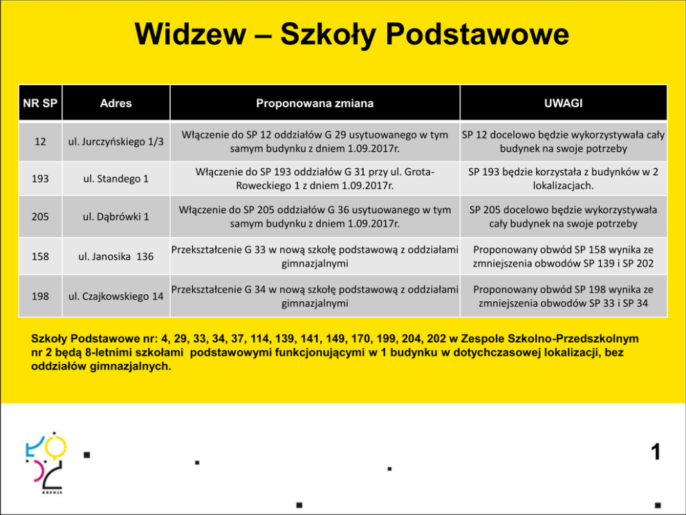 Widzew – Szkoły Podstawowe NR SP Adres Proponowana zmiana UWAGI 12 ul. Jurczyńskiego 1/3 Włączenie do SP 12 oddziałów G 29 usytuowanego w tym samym budynku z dniem 1.09.2017r. SP 12 docelowo będzie wykorzystywała cały budynek na swoje potrzeby 193 ul. Standego 1 Włączenie do SP 193 oddziałów G 31 przy ul. GrotaRoweckiego 1 z dniem 1.09.2017r. SP 193 będzie korzystała z budynków w 2 lokalizacjach. 205 ul. Dąbrówki 1 Włączenie do SP 205 oddziałów G 36 usytuowanego w tym samym budynku z dniem 1.09.2017r. SP 205 docelowo będzie wykorzystywała cały budynek na swoje potrzeby 158 ul. Janosika 136 Przekształcenie G 33 w nową szkołę podstawową z oddziałami gimnazjalnymi Proponowany obwód SP 158 wynika ze zmniejszenia obwodów SP 139 i SP 202 198 ul. Czajkowskiego 14 Przekształcenie G 34 w nową szkołę podstawową z oddziałami gimnazjalnymi Proponowany obwód SP 198 wynika ze zmniejszenia obwodów SP 33 i SP 34 Szkoły Podstawowe nr: 4, 29, 33, 34, 37, 114, 139, 141, 149, 170, 199, 204, 202 w Zespole Szkolno-Przedszkolnym nr 2 będą 8-letnimi szkołami podstawowymi funkcjonującymi w 1 budynku w dotychczasowej lokalizacji, bez oddziałów gimnazjalnych. 1 Widzew – Gimnazja Nr G Adres Proponowane zmiany 28 ul. Kopcińskiego 54 Wygaszenie z dniem 31.08.2019r. 29 ul. Jurczyńskiego 1/3 Włączenie do SP 12 z dniem 1.09.2017r. 30 ul. Nowogrodzka 6/14 Wygaszenie z dniem 31.08.2019r. 31 ul. Grota-Roweckiego 1 Włączenie do SP 93 z dniem 1.09.2017r. UWAGI Uczniowie G 28 do czasu zakończenia nauki pozostają w swoim dotychczasowym budynku. Uczniowie G29 do czasu zakończenia nauki pozostają w swoim dotychczasowym budynku. Uczniowie G 30 do czasu zakończenia nauki pozostają w swoim dotychczasowym budynku. Uczniowie G 31 do czasu zakończenia nauki pozostają w swoim dotychczasowym budynku. 32 ul. Fabryczna 4 Wygaszenie z dniem 31.08.2019r. Uczniowie G 32 do czasu zakończenia nauki pozostają w swoim dotychczasowym budynku. 33 ul. Janosika 136 Przekształcenie w szkołę podstawową z dniem 1.09.2017r. Uczniowie G 33 do czasu zakończenia nauki pozostają w swoim dotychczasowym budynku. 36 ul. Dąbrówki 1 Włączenie do SP 205 z dniem 1.09.2017r. Uczniowie G36 do czasu zakończenia nauki pozostają w swoim dotychczasowym budynku. 34 w ZSO 1 35 w ZSO 8 GMS Przekształcenie gimnazjum wchodzącego w Uczniowie G 34 do czasu zakończenia nauki pozostają w ul. Czajkowskiego 14 skład Zespołu w szkołę podstawową z swoim dotychczasowym budynku. dniem 1.09.2017r. ul. Czernika 1/3 Z dniem 1 września 2019r. ZSO nr 8 staje się XLVIII LO z mocy ustawy Przekształcenie w LMS z dniem 1 września ul. Czajkowskiego 14 2019r. z lokalizacją w dotychczasowej siedzibie Uczniowie G 35 w ZSO 8 do czasu zakończenia nauki pozostają w swoim dotychczasowym budynku. Uczniowie GMS do czasu zakończenia nauki pozostają w swoim dotychczasowym budynku. 2 Struktura sieci szkół podstawowych po zmianach z wykorzystaniem budynków gimnazjalnych Typ szkoły Liczba Szkoły podstawowe wykorzystujące swoją dotychczasową siedzibę 65 Szkoły podstawowe wykorzystujące budynki gimnazjalne w tej samej lokalizacji 7 Szkoły podstawowe funkcjonujące w 2 lokalizacjach 13 Szkoły podstawowe funkcjonujące w nowej lokalizacji 1 Nowe szkoły podstawowe 3 RAZEM 89 3 Struktura sieci szkół ponadgimnazjalnych po zmianach z wykorzystaniem budynków gimnazjalnych Typ szkoły Liczba Licea ogólnokształcące funkcjonujące w swoich dotychczasowych siedzibach 25 Licea ogólnokształcące funkcjonujące w nowych lokalizacjach 4 Szkoły zawodowe 18 RAZEM 47 4 Proponowane zmiany w granicach obwodów szkół podstawowych 5 SZKOŁA PODSTAWOWA nr 33 im. Stefana Kopcińskiego w Łodzi ul. Lermontowa 7 Z obwodu szkoły wyłączona została ulica: • Czajkowskiego Piotra - cała 6 SZKOŁA PODSTAWOWA NR 34 im. Leona Kruczkowskiego w Łodzi ul. Mieczysławy Ćwiklińskiej 9 Z obwodu szkoły wyłączone zostały ulice: • • • • Andrzejowskiej - cała Przybyszewskiego - od Puszkona do Augustów Wujaka - 1-7 Snowalniana - cała 7 SZKOŁA PODSTAWOWA nr 198 w Łodzi ul. Czajkowskiego 14 (nowa SP) Do obwodu szkoły włączone zostały ulice: • • • • • Andrzejowskiej – cała Czajkowskiego Piotra – cała Przybyszewskiego - od Puszkina do Augustów Wujaka - 1-7 Snowalniana - cała 8 SZKOŁA PODSTAWOWA nr 199 im. Juliana Tuwima w Łodzi ul. Józefa Elsnera 8. Z obwodu szkoły zostały wyłączone ulice: • Bartoka 1 - 41 • Czernika 2 - 18 9 Szkoła Podstawowa nr 114 im. prof. Jana Dembowskiego w Łodzi ul. Milionowa 64 Do obwodu szkoły włączone zostały ulice: • Bartoka 1 - 41 • Czernika 2 - 18 10 SZKOŁA PODSTAWOWA nr 139 im. Wojska Polskiego w Łodzi ul. Giewont 28 Z obwodu szkoły wyłączone zostały ulice: Brzezińska 1-131 i 2-154, Chałubińskiego cała, Ciupagowa cała, Dolina Łódki cała, Harnasia cała, Jadwigi cała, Janosika 102-164 i 99-169, Junacka cała, Kalatówki cała, Karkonoska cała, Kerna cała, Kiepury cała, Kierpcowa cała, Kłodzka cała, Kmiecia cała, Kobzowa cała, Krasińskiego cała, Listopadowa 148, Marmurowa cała, Morskie Oko cała, Nasypowa cała, Okrętowa cała, Opolska 43-83, Połoniny cała, Prezydenta cała, Pstrowskiego cała, Pisarska cała, Raszyńska cała, Reglowa cała, Sapieżyńska cała, Sawickiej cała, Spiska cała, Stokowska cała, Strążyska cała, Szałasowa cała, Szczawnicka cała, Śpiących Rycerzy cała, Śnieżna cała, Tadeusza cała, Taternicza cała, Wąwozowa cała, Wiślicka cała, Wydmowa cała, Zbójnicka cała, Zjazdowa cała. 11 SZKOŁA PODSTAWOWA nr 202 im. Jana Pawła II w Łodzi ul. Jugosłowiańska 2 Z obwodu szkoły wyłączone zostały ulice: • Beskidzka cała, • Budy cała, • Malownicza cała 12 SZKOŁA PODSTAWOWA nr 12 im. Mariana Batki w Łodzi ul. Jurczyńskiego 1/3 Do obwodu szkoły włączona została ulica: • Malownicza cała. 13 SZKOŁA PODSTAWOWA nr 158 w Łodzi ul. Janosika 136 (nowa SP) Do o