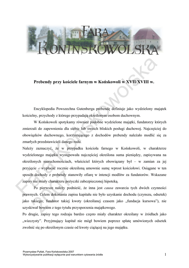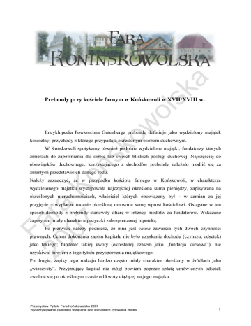 a sk Fa 20 ra 07 K oń sk ow ol Prebendy przy kościele farnym w Końskowoli w XVII/XVIII w. Encyklopedia Powszechna Gutenberga prebendę definiuje jako wydzielony majątek kościelny, przychody z którego przypadają określonym osobom duchownym. W Końskowoli spotykamy również podobne wydzielone majątki, fundatorzy których zmierzali do zapewnienia dla siebie lub swoich bliskich posługi duchowej. Najczęściej do obowiązków duchownego, korzystającego z dochodów prebendy należało modlić się za zmarłych przedstawicieli danego rodu. Należy zaznaczyć, że w przypadku kościoła farnego w Końskowoli, w charakterze wydzielonego majątku występowała najczęściej określona suma pieniędzy, zapisywana na określonych nieruchomościach, właściciel których obowiązany był – w zamian za jej przyjęcie – wypłacać rocznie określoną umownie sumę wprost kościołowi. Osiągane w ten sposób dochody z prebendy stanowiły ofiarę w intencji modlitw za fundatorów. Wskazane zapisy nie miały charakteru pożyczki zabezpieczonej hipoteką. Po pierwsze należy podnieść, że inna jest causa zawarcia tych dwóch czynności prawnych. Celem dokonania zapisu kapitału nie było uzyskanie dochodu (czynszu, odsetek) jako takiego; fundator takiej kwoty (określanej czasem jako „fundacja kursowa”), nie uzyskiwał bowiem z tego tytułu przysporzenia majątkowego. Po drugie, zapisy tego rodzaju bardzo często miały charakter określany w źródłach jako „wieczysty”. Przyjmujący kapitał nie mógł bowiem poprzez spłatę umówionych odsetek zwolnić się po określonym czasie od kwoty ciążącej na jego majątku. Przemysław Pytlak, Fara Końskowolska 2007 Wykorzystywanie publikacji wyłącznie pod warunkiem cytowania źródła 1 Po trzecie – kwota pierwotna mogła być przenoszona – w takim przypadku pierwotnie przyjmujący kapitał zwracał go w całości fundatorowi (zwalniając się w ten sposób z zobowiązań), a ten dokonywał kolejnego zapisu. W 1619 r. Stanisław Żyrzyński z Żyrzyna i Lakowic zapisał 1 w testamencie kwotę 4 tysięcy złotych, zabezpieczoną na kamienicy rajcy lubelskiego Jana Szembeka. Z tej sumy a 500 złotych należne były kościołowi farnemu w Końskowoli, gdzie spoczęły doczesne sk szczątki jego matki – Zofii z Korytnicy Żyrzyńskiej oraz 125 złotych szpitalowi przy kościele św. Anny. Na mocy testamentu ol oraz umowy z właścicielem kamienicy, każdy kolejny jej Fa 20 ra 07 K oń sk ow właściciel obowiązany był płacić od tych kwot co roku określony czynsz. Dochody w ten sposób wpływające na rzecz parafii i szpitala w Końskowoli stanowiły ofiarę za modły w intencji Zofii Żyrzyńskiej. Ksiądz Stanisław Lisowicz (zm. po 1633) miał jednak problemy, żeby odzyskać kwoty należne szpitalowi, kolejni właściciele kamienicy nie byli bowiem skłonni płacić tego czynszu. Jakkolwiek „Inwentarzach Lisowicz w Apparatów…” z 1633 r. ostrzega kolejnych proboszczów przed 1 Precyzyjniej – wyderkował. „Wyderkaf” to potoczna nazwa tzw. kupna renty, używana w Polsce od schyłku XIII w.; posiadacz kapitału dawał właścicielowi nieruchomości ustalona kwotę pieniędzy, w zamian za która każdorazowy właściciel tej nieruchomości był zobowiązany do corocznych świadczeń´ pieniężnych w wys. 5– 8% uzyskanego z niej dochodu (renta), uiszczanych właścicielowi kapitału dożywotnio lub w ciągu ustalonej liczby lat; właściciel nieruchomości (dłużnik) mógł uwolnić się od płacenia renty, zwracając pożyczkę. Wskazana przez donatora suma zapisywana była często na swych nieruchomościach w zamian za czynsz, płacony potem przez spadkobierców; w takich przypadkach zazwyczaj czynsz taki przeznaczony był na poczet ofiar za modły w intencji wyznaczonej przez donatora. Przemysław Pytlak, Fara Końskowolska 2007 Wykorzystywanie publikacji wyłącznie pod warunkiem cytowania źródła 2 przyjmowaniem kwot zapisanych na dobrach mieszczańskich, jako często przechodzących z rąk do rąk, losy kolejnych zapisów potwierdzają, że pewności nie można było mieć także w przypadku majątków należących do magnaterii. Powyżej: odpis „wyderkafu” Stanisława Żyrzynskiego z „Inwentarza Apparatów…” z 1633 r. autorstwa księdza Stanisława Lisowicza. a Dnia 15 grudnia 1651 r., Zofia z Tęczyńskich Daniłłowiczowa, ówczesna sk właścicielka Końskowoli, dokonała uposażenia Bractwa Świętego Anioła Stróża, które zostało założone z inicjatywy jej oraz Mikołaja Daniłłowicza, Podskarbiego Wielkiego ol Koronnego, jej męża, w 1644 r. Co roku – w dwóch ratach – pisarz prowentowy konińskowolski (urzędnik zamkowy), obowiązany był wypłacać łącznie 300 złotych Fa 20 ra 07 K oń sk ow polskich na potrzeby Bractwa, w szczególności na zakup niezbędnych sprzętów: świec, lamp i olejów do tychże. Akt utworzenia Bractwa Św. Anioła Stróża W roku 1653, dnia 7 stycznia, Zofia z Tęczyńskich Daniłłowiczowa, dokonała zapisu 7000 złotych polskich „na maiętności mey Konskowolskiej, obyczajem Przemysław Pytlak, Fara Końskowolska 2007 Wykorzystywanie publikacji wyłącznie pod warunkiem cytowania źródła 3 wyderkafu według zwyczaiu y prawa Koronnego”. Czynsz od tej kwoty ustalony został na 8% w skali roku. Uzyskiwana w ten sposób kwota – 560 złotych – przeznaczana miała być na wynagrodzenie kapelana (pierwszym był ksiądz Maciej Paskowicz). Kapelan obowiązany był odprawiać msze w święto Anioła Stróża i w inne święta, jak również odprawiać trzy msze tygodniowo. Pierwsza, odprawiana w piątki, poświęcona a – na przemian – Najświętszej Maryi Pannie i Męce Jezusa, odprawiana była za donatorkę. Jak zaznaczała Daniłłowiczowa, za jej życia msze sprawowane miały być sk za odpuszczenie jej grzechów, zaś po śmierci – za duszę. W poniedziałki miała być odprawiana msza w intencji duszy jej męża, zaś w czwartk