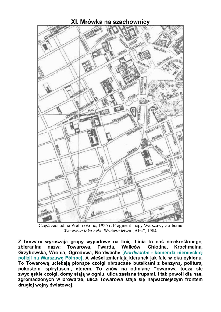 XI. Mrówka na szachownicy Część zachodnia Woli i okolic, 1935 r. Fragment mapy Warszawy z albumu Warszawa jaka była. Wydawnictwo „Alfa”, 1984. Z browaru wyruszają grupy wypadowe na linię. Linia to coś nieokreślonego, zbieranina nazw: Towarowa, Twarda, Waliców, Chłodna, Krochmalna, Grzybowska, Wronia, Ogrodowa, Nordwache [Nordwache - komenda niemieckiej policji na Warszawę Północ]. A wieści zmieniają kierunek jak fale w oku cyklonu. To Towarową uciekają płonące czołgi obrzucane butelkami z benzyną, politurą, pokostem, spirytusem, eterem. To znów na odmianę Towarową toczą się zwycięskie czołgi, domy stają w ogniu, ulica zasłana trupami. I tak powoli dla nas, zgromadzonych w browarze, ulica Towarowa staje się najważniejszym frontem drugiej wojny światowej.