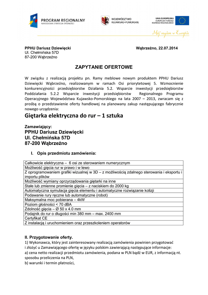 PPHU Dariusz Dziewięcki Ul. Chełmińska 57D 87-200 Wąbrzeźno Wąbrzeźno, 22.07.2014 ZAPYTANIE OFERTOWE W związku z realizacją projektu pn. Ramy meblowe nowym produktem PPHU Dariusz Dziewięcki Wąbrzeźno, realizowanym w ramach Osi priorytetowej 5. Wzmocnienie konkurencyjności przedsiębiorstw Działania 5.2. Wsparcie inwestycji przedsiębiorstw Poddziałania 5.2.2 Wsparcie inwestycji przedsiębiorstw Regionalnego Programu Operacyjnego Województwa Kujawsko-Pomorskiego na lata 2007 – 2013, zwracam się z prośbą o przedstawienie oferty handlowej na planowany zakup następującego fabrycznie nowego urządzenia: Giętarka elektryczna do rur – 1 sztuka Zamawiający: PPHU Dariusz Dziewięcki Ul. Chełmińska 57D 87-200 Wąbrzeźno I. Opis przedmiotu zamówienia: Całkowicie elektryczna – 6 osi ze sterowaniem numerycznym Możliwość gięcia rur w prawo i w lewo Z oprogramowaniem grafiki wizualnej w 3D – z możliwością zdalnego sterowania i eksportu i importu plików Możliwość wymiany oprzyrządowania giętarki na inne Stałe lub zmienne promienie gięcia – z naciskiem do 2000 kg Automatyczna symulacja gięcia elementu i automatyczne rozwiązanie kolizji Podawanie rury ręczne lub automatyczne (robot) Maksymalna moc pobierana – 4kW Poziom głośności < 70 dBA Zdolność gięcia – Ø 50 x 4.0 mm Podajnik do rur o długości min 380 mm – max. 2400 mm Certyfikat CE Z instalacją i uruchomieniem oraz przeszkoleniem operatorów II. Przygotowanie oferty. 1) Wykonawca, który jest zainteresowany realizacją zamówienia powinien przygotować i złożyć u Zamawiającego ofertę w języku polskim zawierającą następujące informacje: a) cena netto realizacji przedmiotu zamówienia, podana w PLN bądź w EUR, z informacją nt. sposobu przeliczenia na PLN, b) warunki i termin płatności, c) termin i warunki dostawy, d) inne informacje mogące mieć wpływ na ocenę oferty. 2) Oferta powinna zawierać warunki gwarancji i serwisu. 3) Oferta powinna być opatrzona pieczątką firmową oraz posiadać datę sporządzenia. 4) Oferta musi być podpisana przez oferenta według zasad reprezentacji. 5) Oferta powinna być ważna minimum do: 31.12.2014r. III. Termin i miejsce składania oferty. Oferty należy składać w terminie do dnia 18.08.2014 (decyduje termin wpłynięcia oferty do Zamawiającego). 1) Ofertę można składać: a) pocztą elektroniczną jako zeskanowany dokument na adres: [email protected] b) pocztą tradycyjną lub kurierem na adres: PPHU Dariusz Dziewięcki, ul. Chełmińska 57D, 87-200 Wąbrzeźno, Polska d) osobiście w sekretariacie firmy pod adresem: PPHU Dariusz Dziewięcki, ul. Chełmińska 57D, 87-200 Wąbrzeźno, Polska 2) Planowany termin rozstrzygnięcia postępowania i wyłonienia oferenta nastąpi nie później niż 31.08.2014 r. 3) Zapytanie ofertowe zamieszczono w siedzibie Zamawiającego w miejscu publicznie dostępnym oraz na stronie internetowej www.dziewiecki.eu IV. Kryteria oceny ofert. Wybór najkorzystniejszej oferty nastąpi w oparciu o następujące kryteria: - najkorzystniejsza cena - zgodność towaru z parametrami zapytania - warunki i termin płatności - warunki i termin dostawy V. Dodatkowe informacje. 1) W postępowaniu wyboru najkorzystniejszej oferty, Zamawiający: a) w przypadku otrzymania ofert o jednakowej ocenie zastrzega sobie możliwość dowolnego wyboru lub przeprowadzenie dodatkowego postępowania lub dodatkowych rozmów, b) zastrzega sobie prawo anulowania lub zmiany niniejszego zapytania ofertowego bez podania przyczyny, c) zastrzega sobie prawo, lecz nie obowiązek do rozpatrzenia ofert częściowych, d) nie będzie ponosił żadnych kosztów związanych z udziałem oferentów w zapytaniu ofertowym.
