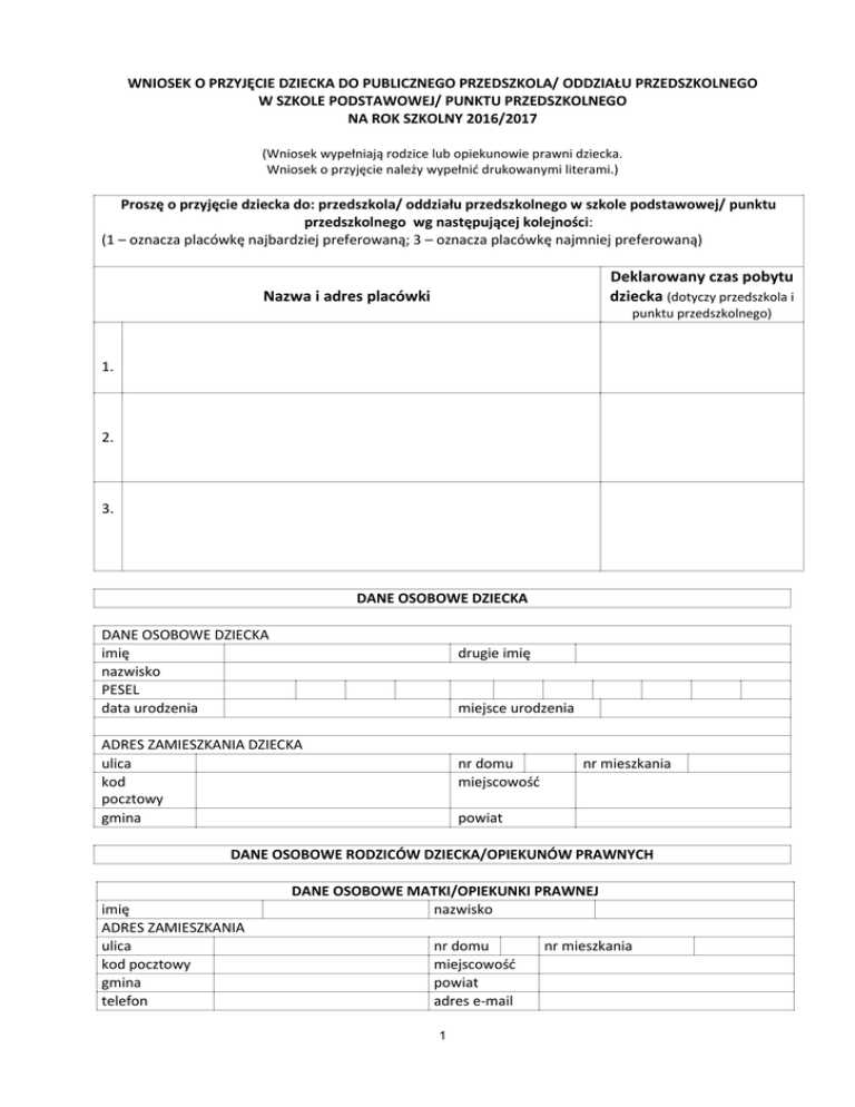 WNIOSEK O PRZYJĘCIE DZIECKA DO PUBLICZNEGO PRZEDSZKOLA/ ODDZIAŁU PRZEDSZKOLNEGO W SZKOLE PODSTAWOWEJ/ PUNKTU PRZEDSZKOLNEGO NA ROK SZKOLNY 2016/2017 (Wniosek wypełniają rodzice lub opiekunowie prawni dziecka. Wniosek o przyjęcie należy wypełnić drukowanymi literami.) Proszę o przyjęcie dziecka do: przedszkola/ oddziału przedszkolnego w szkole podstawowej/ punktu przedszkolnego wg następującej kolejności: (1 – oznacza placówkę najbardziej preferowaną; 3 – oznacza placówkę najmniej preferowaną) Deklarowany czas pobytu dziecka (dotyczy przedszkola i Nazwa i adres placówki punktu przedszkolnego) 1. 2. 3. DANE OSOBOWE DZIECKA DANE OSOBOWE DZIECKA imię nazwisko PESEL data urodzenia drugie imię miejsce urodzenia ADRES ZAMIESZKANIA DZIECKA ulica kod pocztowy gmina nr domu miejscowość nr mieszkania powiat DANE OSOBOWE RODZICÓW DZIECKA/OPIEKUNÓW PRAWNYCH imię ADRES ZAMIESZKANIA ulica kod pocztowy gmina telefon DANE OSOBOWE MATKI/OPIEKUNKI PRAWNEJ nazwisko nr domu miejscowość powiat adres e-mail 1 nr mieszkania komórkowy MIEJSCE ZATRUDNIENIA nazwa firmy adres firmy telefon kontaktowy imię ADRES ZAMIESZKANIA ulica kod pocztowy gmina telefon komórkowy MIEJSCE ZATRUDNIENIA nazwa firmy DANE OSOBOWE OJCA/OPIEKUNA PRAWNEGO nazwisko nr domu miejscowość powiat adres e-mail nr mieszkania adres firmy telefon kontaktowy I etap rekrutacji Kryteria obowiązkowe (art. 20c ust. 2 ustawy z dnia 7 września 1991 r. o systemie oświaty (Dz.U. z 2004 r. nr 256,poz. 2572 ze zm.) - (w przypadku spełniania danego kryterium proszę postawić znak „X ”w rubryce po prawej stronie) 1. Wielodzietność rodziny kandydata 2. załącznik: oświadczenie o wielodzietności rodziny kandydata. Niepełnosprawność kandydata 3. załącznik: orzeczenie o potrzebie kształcenia specjalnego wydane ze względu na niepełnosprawność, orzeczenie o niepełnosprawności lub o stopniu niepełnosprawności lub orzeczenie równoważne w rozumieniu przepisów ustawy z dnia 27 sierpnia 1997 r. rehabilitacji zawodowej i społecznej oraz zatrudnianiu osób niepełnosprawnych (Dz.U. z 2011 r. nr 127, poz. 721 ze zm.). Niepełnosprawność jednego z rodziców kandydata załącznik: orzeczenie o niepełnosprawności lub o stopniu niepełnosprawności lub orzeczenie równoważne w rozumieniu przepisów ustawy z dnia 27 sierpnia 1997 r. rehabilitacji zawodowej i społecznej oraz zatrudnianiu osób niepełnosprawnych (Dz.U. z 2011 r. nr 127, poz. 721 ze zm.). 2 4. Niepełnosprawność obojga rodziców kandydata 5. załącznik: orzeczenie o niepełnosprawności lub o stopniu niepełnosprawności lub orzeczenie równoważne w rozumieniu przepisów ustawy z dnia 27 sierpnia 1997 r. rehabilitacji zawodowej i społecznej oraz zatrudnianiu osób niepełnosprawnych (Dz.U. z 2011 r. nr 127, poz. 721 ze zm.). Niepełnosprawność rodzeństwa kandydata 6. załącznik: orzeczenie o potrzebie kształcenia specjalnego wydane ze względu na niepełnosprawność, orzeczenie o niepełnosprawności lub o stopniu niepełnosprawności lub orzeczenie równoważne w rozumieniu przepisów ustawy z dnia 27 sierpnia 1997 r. rehabilitacji zawodowej i społecznej oraz zatrudnianiu osób niepełnosprawnych (Dz.U. z 2011 r. nr 127, poz. 721 ze zm.). Samotne wychowywanie kandydata w rodzinie 7. załącznik: prawomocny wyrok sądu rodzinnego orzekający rozwód lub separację lub akt zgonu oraz oświadczenie o samotnym wychowywaniu dziecka oraz niewychowywaniu żadnego dziecka wspólnie z jego rodzicem). Objęcie kandydata pieczą zastępczą załącznik: dokument potwierdzający objęcie dziecka pieczą zastępczą zgodnie z ustawą z dnia 9 czerwca 2011 r. o wspieraniu rodziny i systemie pieczy zastępczej (Dz.U. z 2013 r. poz.135). II etap rekrutacji Kryteria dodatkowe ( uchwała Rady Gminy Klembów) (w przypadku spełniania danego kryterium proszę postawić znak „X” w rubryce po prawej stronie) 1. 2. 3. Dziecko pięcioletnie i czteroletnie oraz dziecko z odroczonym obowiązkiem szkolnym ubiegające się o przyjęcie do przedszkola lub oddziału przedszkolnego w szkole podstawowej położonej w odległości do 3 km od miejsca faktycznego zamieszkania dziecka. Dziecko, które zamieszkuje w obwodzie szkoły, w której funkcjonuje oddział przedszkolny. Dziecko, którego oboje rodzice (prawni opiekunowie) pracują, wykonują pracę na podstawie umowy cywilnoprawnej, uczą się w trybie dziennym, prowadzą gospodarstwo rolne lub pozarolniczą działalność gospodarczą. Kryterium stosuje się również do pracującego/studiującego rodzica samotnie wychowującego dziecko. załącznik: zaświadczenie z zakładu pracy o zatrudnieniu, a w przypadku samo zatrudnienia aktualna informacja z Centralnej Ewidencji Informacji o Działalności Gospodarczej lub zaświadczenie z uczelni. 4. Dziecko, którego rodzeństwo uczęszcza i będzie uczęszczało do przedszkola pierwszego wyboru/do oddziału przedszkolnego w szkole pierwszego wyboru. 5. Dziecko, którego rodzic lub rodzice (prawny opiekun/ prawni opiekunowie) mieszka/mieszkają na terenie Gminy Klembów i rozlicza/rozliczają podatek dochodowy od osób fizycznych w Urzędzie Skarbowym w Wołominie. 6. Dziecko, którego rodzeństwo również ubiega się o przyjęcie do tego samego 3 przedszkola lub oddziału przedszkolnego w szkole podstawowej (rodzeństwo wychowywane w rodzinie prowadzącej wspólne gospodarstwo domowe). INFORMACJE O DZIECKU Informacje o stanie zdrowia dziecka mogące mieć znaczenie podczas pobytu dziecka w przedszkolu/ oddziale przedszkolnym w szkole podstawowej/ punkcie przedszkolnym: Pouczenia: 1. Postawienie znaku „X” przy danym kryterium jest oświadczeniem (rodzica/prawnego opiekuna/rodziców/prawnych opiekunów) o spełnieniu danego kryterium. 2. Złożenie fałszywego oświadczenia grozi odpowiedzialnością karną. Jestem świadomy/świadoma odpowiedzialności karnej za złożenie fałszywego oświadczenia. ………………………………… data …