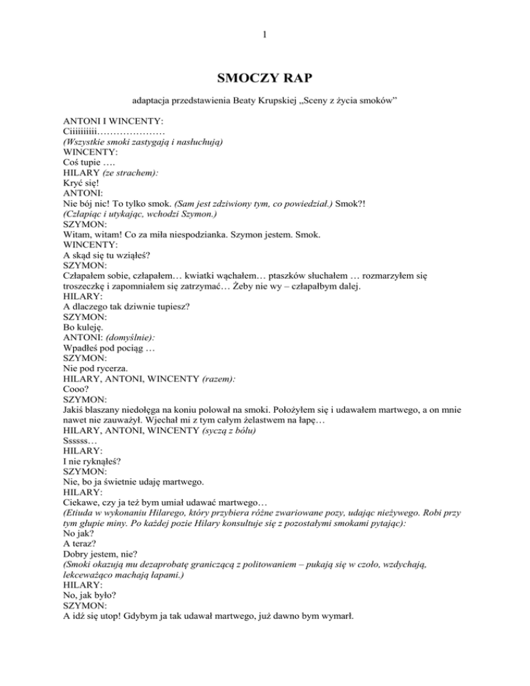 1 SMOCZY RAP adaptacja przedstawienia Beaty Krupskiej „Sceny z życia smoków” ANTONI I WINCENTY: Ciiiiiiiiii………………… (Wszystkie smoki zastygają i nasłuchują) WINCENTY: Coś tupie …. HILARY (ze strachem): Kryć się! ANTONI: Nie bój nic! To tylko smok. (Sam jest zdziwiony tym, co powiedział.) Smok?! (Człapiąc i utykając, wchodzi Szymon.) SZYMON: Witam, witam! Co za miła niespodzianka. Szymon jestem. Smok. WINCENTY: A skąd się tu wziąłeś? SZYMON: Człapałem sobie, człapałem… kwiatki wąchałem… ptaszków słuchałem … rozmarzyłem się troszeczkę i zapomniałem się zatrzymać… Żeby nie wy – człapałbym dalej. HILARY: A dlaczego tak dziwnie tupiesz? SZYMON: Bo kuleję. ANTONI: (domyślnie): Wpadłeś pod pociąg … SZYMON: Nie pod rycerza. HILARY, ANTONI, WINCENTY (razem): Cooo? SZYMON: Jakiś blaszany niedołęga na koniu polował na smoki. Położyłem się i udawałem martwego, a on mnie nawet nie zauważył. Wjechał mi z tym całym żelastwem na łapę… HILARY, ANTONI, WINCENTY (syczą z bólu) Ssssss… HILARY: I nie ryknąłeś? SZYMON: Nie, bo ja świetnie udaję martwego. HILARY: Ciekawe, czy ja też bym umiał udawać martwego… (Etiuda w wykonaniu Hilarego, który przybiera różne zwariowane pozy, udając nieżywego. Robi przy tym głupie miny. Po każdej pozie Hilary konsultuje się z pozostałymi smokami pytając): No jak? A teraz? Dobry jestem, nie? (Smoki okazują mu dezaprobatę graniczącą z politowaniem – pukają się w czoło, wzdychają, lekceważąco machają łapami.) HILARY: No, jak było? SZYMON: A idź się utop! Gdybym ja tak udawał martwego, już dawno bym wymarł. 2 HILARY: No to mi pokaż! (prosi) Pokaż, Szymonie… SZYMON: Weźcie go stąd, bo mu guza nabiję! Co za durne smoczysko! SZYMON: Zjadłbym coś… WINCENTY: Chyba kogoś, ha,ha,ha!!!! (Hilary i Antoni też się śmieją) Lasy tu olbrzymie, zwierząt nie brakuje, a i na człowieka czasem się natkniesz. ANTONI: Wolę dziczyzną – trochę twardsza, ale wyrzutów sumienia nie mam po niej… HILARY: Ja też miałem kiedyś wyrzuty sumienia –-- że mi uciekł taki jeden! SZYMON: Nie, panowie! Prawdziwie nowoczesny smok to szczupły (zmierzył pozostałych wzrokiem) WE-GE-TA-RIA-NIN! HILARY,WINCENTY,ANTONI: Na smoka wawelskiego! SZYMON: Na kogo? ANTONI (nieco ciszej): Był taki jeden… WINCENTY: Baraniny mu się zachciało! ANTONI: Nadziewanej siarką! HILARY, WINCENTY,ANTONI: Ohyda!!! SZYMON: Ohyda! Właśnie! Pomyślcie ile dni musiał to wszystko trawić? HILARY: Tylko kilka… SZYMON: Tylko kilka? HILARY: Tylko kilka…minut. Potem musiał się napić wody …z …Wisły. SZYMON: Samobójca, czy co?! WINCENTY (rzuca się na niego z płaczem): Gdyby ciebie tak suszyło, napiłbyś się czegokolwiek… SZYMON: Na pewno nie! Tylko Żywiec Zdrój, albo Kropla Bez Kitu! ANTONI: Bez czego? WINCENTY: (łkając) Bez tchu pił, aż pękł! (rozpłakuje się) SZYMON: (w zamyśleniu, smutno): Wypadki chodzą po smokach… HILARY: 3 Chodzić mogą, ale żeby zaraz wybuchać? SZYMON: Od dzisiaj panowie biorę się za was! W ciągu miesiąca macie zgubić te wielkie brzuszyska! HILARY, WINCENTY, ANTONI: (zdziwione miny, nic nie mówią) SZYMON: Jako ostatnie cztery smoki na tej planecie musicie o siebie dbać! Minister Zdrowia radzi: Nie jedz mięsa! Musicie zgubić te kilkadziesiąt kilo, to może i pożyjecie o te sto lat dłużej! ANTONI: (zdziwiony) To co, mam szyszunie wsuwać? WINCENTY: (z żalem) Ale to zniszczy całe nasze życie – potyczki z rycerzami, podkradanie krów z pastwiska i te królewny na szczycie wieży, których strzegliśmy! (rozmarzył się) SZYMON: Mojego nie zniszczyło… ANTONI: To co robisz w czasie wolnym? SZYMON: Biegam, surfuję po necie i …rapuję trochę… ANTONI: Proszę, proszę … artysta! HILARY: Ja też trochę rypuję! Jak kiedyś rypłem o ziemię, to… SZYMON: Weźcie go stąd, bo mu guza nabiję! Co za durne smoczysko! HILARY (nie przejmując się niczym): Odchudzać się będę, Choć nie jestem talentem! ANTONI I WINCENTY: Oj, nie! Ręce do góry! Niech walą się mury! ANTONI I WINCENTY (próbują go powstrzymać) SZYMON (stoi i boku i kręci głową) Królewna mnie polubi… ANTONI I WINCENTY: Kiedy sadło zgubisz!!! Ha, ha, ha !!! SZYMON (zamyślony wykrzykuje) Mam! ANTONI, WINCENTY I HILARY: Co masz? SZYMON: Połączmy przyjemne z pożytecznym i stwórzmy RAP FITNESS! ANTONI: A jak się nauczymy … to otworzymy szkołę!!! HILARY: Taniec z gwiazdami! ANTONI: I będziemy zarabiać KASĘ !!! HILARY: 4 Zatańczy Pani? (skłania się nisko i próbuje zatańczyć z Antonim- ten się opiera) (When a Man loves a Woman) SZYMON: Jak nie przestaniesz, to się znajdziesz daleko od noszy! Smoczy móżdżku! To się robi tak! (Szymon zaczyna tańczyć-pozostałe się dołączają) -------------- (po tańcu) WINCENTY: Ale kto przyjdzie do szkoły prowadzonej przez smoki? Królowa ze swoją córką? Takiego hasła jeszcze nie było: Przyjdź do nas, przecież nikt cię nie zje! ANTONI: Chyba że nauczyciel się zdenerwuje! ANTONI, WINCENTY I HILARY: Ha,ha,ha,ha! SZYMON: LOL, a kto będzie uczył w tej szkole? Wy? ANTONI: Tak! Ja-mam trzy klasy gimnazjum! (Szymon stoi zdziwiony) WINCENTY: Ja – dwie! HILARY: A ja jedną, ale jest taka piosenka: ‘We don’t need no education!’ (i zaczyna nucić) SZYMON: Akurat tobie to by się ta edukacja BARDZO przydała! Zakuty łbie! HILARY: Tak ich właśnie nazywam-zanim ich zjem! Albo konserwy! Taki żart, do śmiechu-ha,ha,ha…(w innym nastroju) i wtedy właśnie dużo rozmawiamy, on mówi, że on nie chciał, ale musiał, ja kiwam ze zrozumieniem głową , on mi opowiada całe swoje życie, że ma żonę i dzieci i że było mu bardzo miło pogawędzić, ale musi już lecieć, a wtedy ja go delikatnie naciągam, żeby jeszcze trochę został, bo właśnie jest głównym daniem wieczoru i …wreszcie ja konsumuję nasz związek… (Szymon wymachuje jakimś warzywem) 