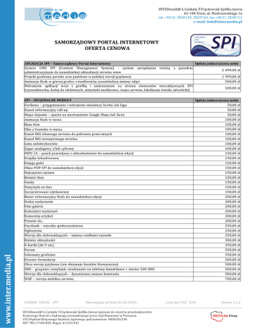 SAMORZĄDOWY PORTAL INTERNETOWY OFERTA CENOWA APLIKACJA SPI – Samorządowy Portal Internetowy Opłata jednorazowa netto System CMS SPI (Content Management System) - system zarządzania treścią z panelem 2 499,00 zł administracyjnym do samodzielnej aktualizacji serwisu www Projekt graficzny portalu oraz podstron w polskiej wersji językowej 1 999,00 zł Animacja flash w górnej grafice z możliwością samodzielnej zmiany zdjęć 500,00 zł Wdrożenie aplikacji wraz z grafiką i umieszczenie na stronie elementów interaktywnych SPI 500,00 zł (wyszukiwarka, dodaj do ulubionych, statystyki analityczne, mapa serwisu, lokalizacja ścieżki, odnośniki) SPI – OPCJONALNE MODUŁY Favikona – przygotowanie i wdrożenie miniatury herbu lub logo Kanał informacyjny roll-up Mapa dojazdu – oparta na mechanizmie Google Maps lub Zumi Animacja flash w menu Baza firm Film z Youtube w menu Kanał RSS własnego serwisu do pobrania przez innych Kanał RSS zewnętrznego serwisu Lista subskrybentów Zegar analogowy i/lub cyfrowy INFO 24 – pasek przewijany z aktualnościami do samodzielnej edycji Książka teleadresowa Księga gości Okno POP-UP do samodzielnej edycji Najczęściej czytane Rotator ikon Sondy Statystyki on-line Zarejestrowani użytkownicy Baner informacyjny flash do samodzielnej edycji Dodaj wydarzenie Foto galeria Kalendarz wydarzeń Komentuj artykuł Pytanie do... Facebook – wtyczka społecznościowa Ogłoszenia Wersja dla słabowidzących – zmiana wielkości czcionki Rotator aktualności E-kartki (do 9 szt.) Forum Schematy graficzne Kreator formularzy Obca wersja językowa (nie obejmuje kosztów tłumaczenia) SMS – grupowe rozsyłanie wiadomości na telefony komórkowe + starter 500 SMS Wersja dla słabowidzących – dynamiczna zmiana kontrastu WAP – wersja mobilna serwisu CENNIK USŁUG - SPI Obowiązuje od dnia 01.03.2012r. Opłata jednorazowa netto 50,00 zł 50,00 zł 50,00 zł 100,00 zł 100,00 zł 100,00 zł 100,00 zł 100,00 zł 100,00 zł 100,00 zł 150,00 zł 150,00 zł 150,00 zł 150,00 zł 150,00 zł 150,00 zł 150,00 zł 150,00 zł 150,00 zł 200,00 zł 200,00 zł 200,00 zł 200,00 zł 200,00 zł 200,00 zł 250,00 zł 250,00 zł 250,00 zł 300,00 zł 350,00 zł 350,00 zł 350,00 zł 500,00 zł 500,00 zł 500,00 zł 500,00 zł 700,00 zł Ceny bez VAT 23% Strona 1 z 2 SAMORZĄDOWY PORTAL INTERNETOWY OFERTA CENOWA SPI – HOSTING Serwer SPI – przestrzeń dyskowa 50 GB; miesięczny limit ruchu 100 GB, nielimitowana ilość domen, kont pocztowych, kont FTP, baz danych, archiwizacja co 24 h, abonament na ulepszenia Dodatkowy transfer: po przekroczeniu limitu ruchu – za 1 GB Dodatkowa przestrzeń dyskowa: po przekroczeniu limitu – za 500 MB Forma płatności SPI – DODATKOWE USŁUGI Aktualizacje SPI: jedna dziennie w aplikacji na podstawie otrzymanych materiałów w formie elektronicznej, bez naruszenia struktury serwisu, w terminie jednego dnia roboczego Aktualizacja jednorazowa: jedna dziennie w aplikacji na podstawie otrzymanych materiałów w formie elektronicznej, bez naruszenia struktury serwisu, w terminie jednego dnia roboczego Przeniesienie danych z istniejącej strony www – informacje stałe (położenie, historia, itp.) oraz informacje typu aktualności (komunikaty, przetargi, itp.) za każde 12 m-cy – zakres określony na podstawie indywidualnej weryfikacji Kamera internetowa – wdrożenie kompleksowe Interaktywny plan miasta/gminy/powiatu System Informacji o Środowisku Muzyka na stronie Dźwięki specjalne klawiszy Wykonanie schematu graficznego serwisu Zakup zdjęcia z bazy iStock Skanowanie zdjęć z odbitek lub negatywu Obróbka graficzna zdjęć Wykonanie zdjęć u klienta (plus koszty dojazdu) Rejestracja w wyszukiwarkach google.pl, interia.pl. onet.pl, wp.pl Uruchomienie kampanii AdWords w wyszukiwarce google.pl Wykonanie banera animowanego SWF lub GIF Wykonanie banera statycznego PNG lub JPG Tłumaczenie na język angielski lub niemiecki przez tłumacza przysięgłego Instrukcja obsługi aplikacji CMS SPI – wersja drukowana stat24 – statystyki oglądalności i mapa kliknięć IVONA WebReader – mówiąca strona internetowa Szkolenie w siedzibie INTERmedi@ dla nowych Klientów (2 osoby, do 2 godz.) Forma płatności SPI – REJESTRACJA I PRZEDŁUŻENIE DOMEN Rejestracja nowej domeny krajowej, światowej i europejskiej krajowa.pl – przedłużenie krajowa.com.pl | światowa.com | europejska.eu – przedłużenie CENNIK USŁUG - SPI Obowiązuje od dnia 01.03.2012r. Cena netto abonament roczny 750,00 zł miesięcznie po przekroczeniu 5,00 zł 5,00 zł Cena netto abonament roczny 1 200,00 zł opłata jednorazowa naliczana miesięcznie 30,00 zł opłata jednorazowa od 600,00 zł opłata jednorazowa opłata jednorazowa opłata jednorazowa opłata jednorazowa opłata jednorazowa opłata za szt. opłata za szt. opłata za szt. opłata za szt. opłata za szt. opłata jednorazowa opłata jednorazowa opłata jednorazowa opłata jednorazowa 1800 znaków/strona opłata jednorazowa - od 2500,00 zł od 1000,00 zł 700,00 zł 400,00 zł 100,00 zł od 200,00 zł od 50,00 zł od 10,00 zł od 20,00 zł od 10,00 zł 250,00 zł 100,00 zł 100,00 zł 50,00 zł 45,00 zł 32,00 zł ZAPYTAJ ZAPYTAJ GRATIS Forma płatności opłata jednorazowa abonament roczny abonament roczny Ceny bez VAT 23% Cena netto 1,00 zł 100,00 zł 80,00 zł Strona 2 z 2