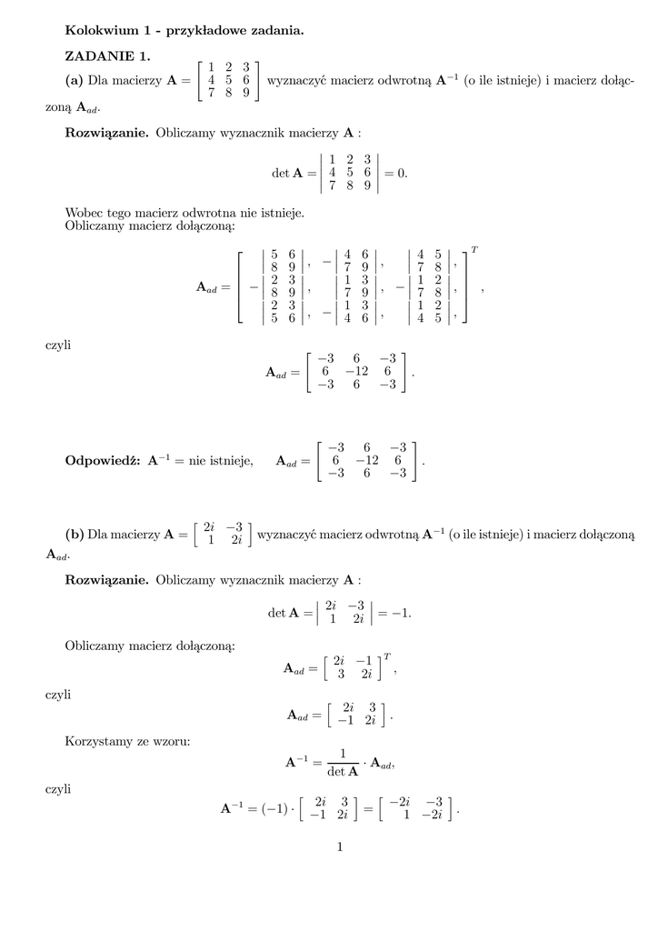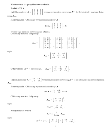Kolokwium 1 - przykładowe zadania. ZADANIE 1. (a) Dla macierzy A