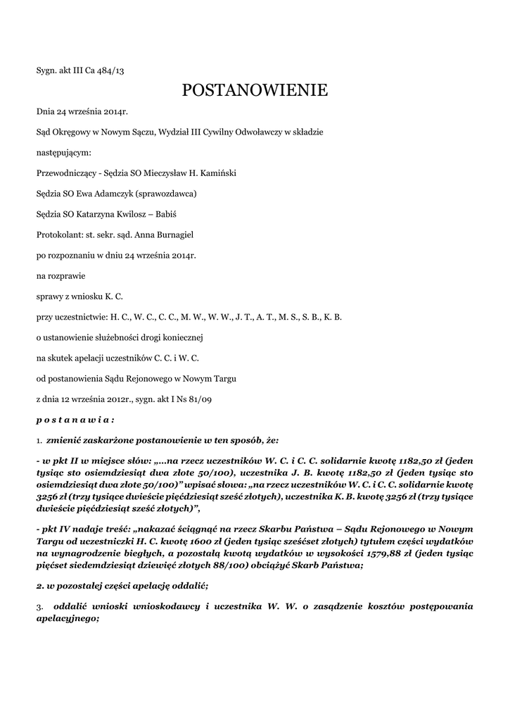 Sygn. akt III Ca 484/13 POSTANOWIENIE Dnia 24 września 2014r. Sąd Okręgowy w Nowym Sączu, Wydział III Cywilny Odwoławczy w składzie następującym: Przewodniczący - Sędzia SO Mieczysław H. Kamiński Sędzia SO Ewa Adamczyk (sprawozdawca) Sędzia SO Katarzyna Kwilosz – Babiś Protokolant: st. sekr. sąd. Anna Burnagiel po rozpoznaniu w dniu 24 września 2014r. na rozprawie sprawy z wniosku K. C. przy uczestnictwie: H. C., W. C., C. C., M. W., W. W., J. T., A. T., M. S., S. B., K. B. o ustanowienie służebności drogi koniecznej na skutek apelacji uczestników C. C. i W. C. od postanowienia Sądu Rejonowego w Nowym Targu z dnia 12 września 2012r., sygn. akt I Ns 81/09 postanawia: 1. zmienić zaskarżone postanowienie w ten sposób, że: - w pkt II w miejsce słów: „…na rzecz uczestników W. C. i C. C. solidarnie kwotę 1182,50 zł (jeden tysiąc sto osiemdziesiąt dwa złote 50/100), uczestnika J. B. kwotę 1182,50 zł (jeden tysiąc sto osiemdziesiąt dwa złote 50/100)” wpisać słowa: „na rzecz uczestników W. C. i C. C. solidarnie kwotę 3256 zł (trzy tysiące dwieście pięćdziesiąt sześć złotych), uczestnika K. B. kwotę 3256 zł (trzy tysiące dwieście pięćdziesiąt sześć złotych)”, - pkt IV nadaje treść: „nakazać ściągnąć na rzecz Skarbu Państwa – Sądu Rejonowego w Nowym Targu od uczestniczki H. C. kwotę 1600 zł (jeden tysiąc sześćset złotych) tytułem części wydatków na wynagrodzenie biegłych, a pozostałą kwotą wydatków w wysokości 1579,88 zł (jeden tysiąc pięćset siedemdziesiąt dziewięć złotych 88/100) obciążyć Skarb Państwa; 2. w pozostałej części apelację oddalić; 3. oddalić wnioski wnioskodawcy i uczestnika W. W. o zasądzenie kosztów postępowania apelacyjnego; 4. nakazać ściągnąć od wnioskodawcy na rzecz Skarbu Państwa – Sądu Okręgowego w Nowym Sączu kwotę 3428,30 zł (trzy tysiące czterysta dwadzieścia osiem złotych 30/100) tytułem wydatków poniesionych tymczasowo przez Skarb Państwa w postępowaniu apelacyjnym. Sygn. akt III Ca 484/13 UZASADNIENIE Postanowieniem z dnia 12 września 2012 r. Sąd Rejonowy w Nowym Targu ustanowił na rzecz każdoczesnego właściciela nieruchomości stanowiącej dz. zmod. (...), (...), (...), (...) położonej w S. służebność drogi koniecznej o szer. 3, 5 m obciążającej dz. zmod. (...), (...), (...), 2660, (...) położone w S. pasem gruntu oznaczonym linią czerwoną przerywaną i literami A‑B‑C-D-E-F-G-H-I-J-K-L-Ł-M-N-0-A jak na mapie sytuacyjnej geodety mgr inż. B. W. z dnia 21 października 2009 r. (pkt I). Nadto zasądził od wnioskodawcy K. C. na rzecz uczestników W. C. i C. C. solidarnie kwotę 1 182, 50 zł, uczestnika J. B. kwotę 1182, 50 zł, uczestników J. T. i A. T. solidarnie kwotę 1 210 zł, uczestniczki M. S. 1650 zł, uczestnika S. B. 1 100 zł tytułem wynagrodzenia, z ustawowymi odsetkami na wypadek zwłoki w płatności (pkt II). Kosztami postępowania w zakresie wydatku na wynagrodzenie biegłych geodety i budowlanego w kwocie 5 202, 67 zł obciążył Skarb Państwa wobec zwolnienia wnioskodawcy K. C. od ich ponoszenia (pkt III), nakazał ściągnięcie na rzecz Skarbu Państwa od uczestników W. C. i C. C. solidarnie kwotę 3 179, 88 zł tytułem wydatku na wynagrodzenie biegłych geodety i budowlanego (pkt IV), w pozostałej części koszty postępowania wzajemnie zniósł (pkt V). Sąd ustalił m.in., że wnioskodawca K. C. i uczestniczka H. C. na zasadzie wspólności ustawowej są właścicielami nieruchomości położonej w S. stanowiącej dz. zmod. (...), (...), (...) z obr. (...) Uczestniczka H. C. (1) jest właścicielką dz. zmod. (...) z obr.(...) położonej w S.. Właścicielami dz. (...) z obr. (...) położonej w S. są uczestnicy J. T. i A. T. na zasadzie wspólności ustawowej. Właścicielką dz. (...), (...) jest uczestniczka M. S.. Uczestnik S. B. jest posiadaczem samoistnym dz. (...). Uczestnicy M. W. w 3/32 części i W. W. w 29/32 części są współwłaścicielami dz. zmod. (...). Działki (...) nie mają dostępu do drogi publicznej . Jest to nieruchomość ogrodzona siatką, gdzie w części wschodniej usytuowany jest parterowy, jednorodzinny dom, a w pozostałej części znajduje się ogród kwiatowy i warzywny. Dz. zmod. (...) położona jest bezpośrednio przy drodze publicznej i od tej działki w kierunku południowym do nieruchomości władnącej ma przebiegać służebność drogi koniecznej na szer. 3, 5 m i łączną długość 115 m. Część dz. (...) od strony wschodniej znajduje się poza ogrodzeniem i tutaj szlak drogi koniecznej przebiega utwardzonym przez asfalt gruntem, zajmując również pas gruntu na szer. 1, 5 m za ogrodzeniem w kierunku zachodnim. Dz.(...) nie jest zabudowana. Szlak drogi koniecznej omija dz. (...) i klinem wchodzi w dz. (...)zajmując pas gruntu od strony zachodniej do ogrodzenia nieruchomości stanowiącej dz. (...), (...), który poza ogrodzeniem dz. (...), (...), (...), (...) od trony zachodniej jest utwardzony stanowiąc ścieżkę, a poza ogrodzeniem od strony wschodniej na szer. 1, 5 m stanowi grunt porośnięty trawą i ogródki kwiatowe. Na działkach tych nie ma zabudowań. Jedynie na działkach (...) znajdują się domki letniskowe. Szlak ten zajmuje pow. 43 m( 2) działki (...),ale z tego pow. 33 m( 2) znajduje się poza ogrodzeniem działki stanowiąc funkcjonalne przejście dla nieruchomości władnącej funkcjonujące od lat 70-ych. Jeżeli nieruchomość władnąca ma mieć zapewniony funkcjonalny dojazd do drogi publicznej, należy istniejący dostęp poszerzyć do wielkości 3,5 . W związku z tym z dz. (...) zostanie przeznaczone dodatkowo 10 m( 2) i ta część nie będzie mogła pełnić funkcji podwórka. Szlak drogi koniecznej po dz. (...), (...) dzieli te działki przez środek oddzielając budynek mieszkalny od gospodarczego na dz. (...) i przecina sad na dz. (...)na dwie połowy zajmując pow. 149, 80 m( 2). Obcią
