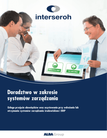 OHSAS/PN-N 18001 ISO 14001/EM AS Doradztwo w zakresie systemów zarzadzania Usługa przejecia obowiazków oraz asystowania przy wdrazaniu lub utrzymaniu systemów zarzadzania srodowiskiem i BHP Wdrazanie lub utrzymanie systemów ISO 14001/EMAS oraz BHP zgodnymi z normami OHSAS/PN-N 18001 lub pokrewnymi Praca z systemami zarządzania środowiskiem oraz BHP nie będzie już stanowiła dla Państwa problemu Wskażemy optymalną drogę do osiągnięcia sprawnie funkcjonującego i zgodnego z wymaganiami systemu zarządzania. Oferta Interseroh: Kompleksowa obsługa dla systemów zarządzania środowiskiem i BHP Pełne wsparcie przy wdrażaniu, certyfikacji i utrzymaniu systemów zarządzania: od opracowania dokumentacji systemowej po udziały w audytach kontrolnych i wewnętrznych. Usługi dopasowane do indywidualnych potrzeb klienta Realizacja wybranych prac na etapie wdrożenia, certyfikacji i utrzymania systemów zarządzania środowiskiem i BHP, np.: procedury systemowe, instrukcje stanowiskowe, oceny ryzyka zawodowego, identyfikacja i ocena aspektów środowiskowych, ocena zgodności. Szkolenia z zakresu systemów zarządzania Profesjonalne warsztaty i szkolenia dostosowane do Państwa potrzeb. Interesują Państwa nasze pozostałe usługi? Zapoznajcie się Państwo z naszą ofertą: Przejęcie obowiązku odzysku i recyklingu opakowań Green Business Kompleksowa gospodarka odpadami Doradztwo w zakresie BHP Doradztwo środowiskowe Facility management Wsparcie w realizacji obowiązku odzysku baterii i akumulatorów Edukacja ekologiczna Państwa korzyści: Przeprowadzenie bezpłatnego, niezobowiązującego audytu systemowego w celu oceny aktualnego stanu zarządzania nad obszarami ochrony środowiska i BHP Rzetelne i sprawne wdrożenie wybranych systemów zarządzania Gwarancja utrzymania certyfikowanych systemów zarządzania Wieloletnie doświadczenie i praktyczna wiedza naszych specjalistów Eliminacja ryzyka błędów i niezgodności w procesie wdrażania i funkcjonowania systemu Chetnie Panstwu doradzimy Telefon: +48 22 742 10 22 INTERSEROH Polska Sp. z o.o. ul. Kubickiego 17, lok. 27, 02-954 Warszawa www.interseroh.pl resources SAVED ® 04/2014 E-Mail: [email protected]