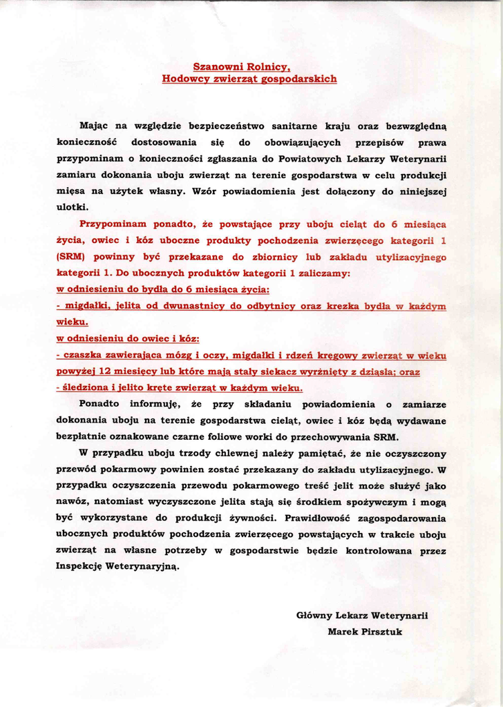 Szanowni Rolnicy, Hodowcy zwierz ąt gospodarskich Maj ą c na wzglę dzie bezpiecze ństwo sanitarne kraju oraz bezwzgl ę dną konieczno ść dostosowania si ę do obowi ązujących przepisów prawa przypominam o konieczno ś ci zgł aszania do Powiatowych Lekarzy Weterynarii zamiaru dokonania uboju zwierz ąt na terenie gospodarstwa w celu produkcji mię sa na użytek w łasny. Wzór powiadomienia jest do łączony do niniejszej ulotki. Przypominam ponadto, że powstaj ące przy uboju ciel ąt do 6 miesiąca życia, owiec i kóz uboczne produkty pochodzenia zwierz ęcego kategorii 1 (SRM) powinny być przekazane do zbiornicy lub zakładu utylizacyjnego kategorii 1. Do ubocznych produktów kategorii 1 zaliczamy: w odniesieniu do byd ła do 6 miesiąca życia: - migdał ki, jelita od dwunastnicy do odbytnicy oraz krezka byd ła w każdym wieku. w odniesieniu do owiec i kóz: - czaszka zawieraj ąca mózg i oczy, migda łki i rdze ń kręgowy zwierząt w wieku powyżej 12 miesi ę cy lub które maj ą sta ły siekacz wyr żnię ty z dziąsła; oraz - śledziona i jelito kr ęte zwierz ąt w każdym wieku. Ponadto informuj ę , że przy składaniu powiadomienia o zamiarze dokonania uboju na terenie gospodarstwa ciel ąt, owiec i kóz b ę dą wydawane bezp ł atnie oznakowane czarne foliowe worki do przechowywania SRM. W przypadku uboju trzody chlewnej nale ży pamię tać , ż e nie oczyszczony przewód pokarmowy powinien zosta ć przekazany do zakł adu utylizacyjnego. W przypadku oczyszczenia przewodu pokarmowego tre ść jelit mo że s łużyć jako nawóz, natomiast wyczyszczone jelita staj ą się ś rodkiem spo żywczym i mogą być wykorzystane do produkcji żywno ści. Prawid łowo ść zagospodarowania ubocznych produktów pochodzenia zwierz ę cego powstaj ących w trakcie uboju zwierz ąt na własne potrzeby w gospodarstwie b ę dzie kontrolowana przez Inspekcj ę Weterynaryjn ą . Główny Lekarz Weterynarii Marek Pirsztuk Powiadomienie o zamiarze przeprowadzenia uboju ciel ąt do szóstego miesi ąca życia, owiec lub kóz w celu produkcji mi ę sa przeznaczonego na u żytek własny I. Informacja o zamiarze przeprowadzenia uboju Imię i nazwisko, miejsce zamieszkania oraz adres posiadacza zwierz ęcia: Imię i nazwisko, miejsce zamieszkania oraz adres podmiotu prowadz ącego gospodarstwo: 1) Gatunek zwierząt poddawanych ubojowi: Liczba zwierząt poddawanych ubojowi: Numer identyfikacyjny zwierz ęcia lub zwierząt poddawanych ubojowi: 2) Miejsce uboju: Termin uboju: Imię i nazwisko oraz adres osoby uprawnionej do przeprowadzenia uboju: Inne dane, w tym numer telefonu, przekazuj ącego powiadomienie: II. Oświadczenie o zagospodarowaniu materia łu szczególnego ryzyka Oświadczam, że pokryj ę koszty zagospodarowania materia łu szczególnego ryzyka dokonanego zgodnie z rozporz ądzeniem Parlamentu Europejskiego i Rady (WE) nr 999/2001 z dnia 22 maja 2001 r. ustanawiaj ącym zasady dotyczące zapobiegania, kontroli i zwalczania niektórych pasa żowalnych gąbczastych encefalopatii (Dz. Urz. WE L 147 z 31.05.2001, str. 1, z pó źn. zm .; Dz. Urz. UE Polskie wydanie specjalne, rozdz. 3, t. 32, str. 289, z późn. zm .) i rozporządzeniem (WE) nr 1774/2002 Parlamentu Europejskiego i Rady z dnia 3 października 2002 r. ustanawiaj ącym przepisy sanitarne dotycz ące produktów ubocznych pochodzenia zwierzęcego nieprzeznaczonych do spo życia przez ludzi (Dz. Urz. WE L 273 z 10.10.2002, str. 1, z pó źn. zm .; Dz. Urz. UE Polskie wydanie specjalne, rozdz. 3, t. 37, str. 92, z późn. zm .). III. Informacja o zg łoszeniu mięsa do badania poubojowego Zgłaszam do badania poubojowego mi ę so pozyskane / nie zg łaszam do badania poubojowego mięsa pozyskanego 3) ze zwierząt poddanych ubojowi w celu produkcji mi ęsa na użytek własny. (data i podpis) 1)Dotyczy uboju zwierz ąt w gospodarstwie innym niż gospodarstwo, w którym zwierzęta były utrzymywane. 2)Dotyczy cieląt do szóstego miesiąca życia, owiec i kóz, je żeli z przepisów o systemie identyfikacji i rejestracji zwierząt wynika obowiązek oznakowania zwierzęcia. 3)Niepotrzebne skreślić .