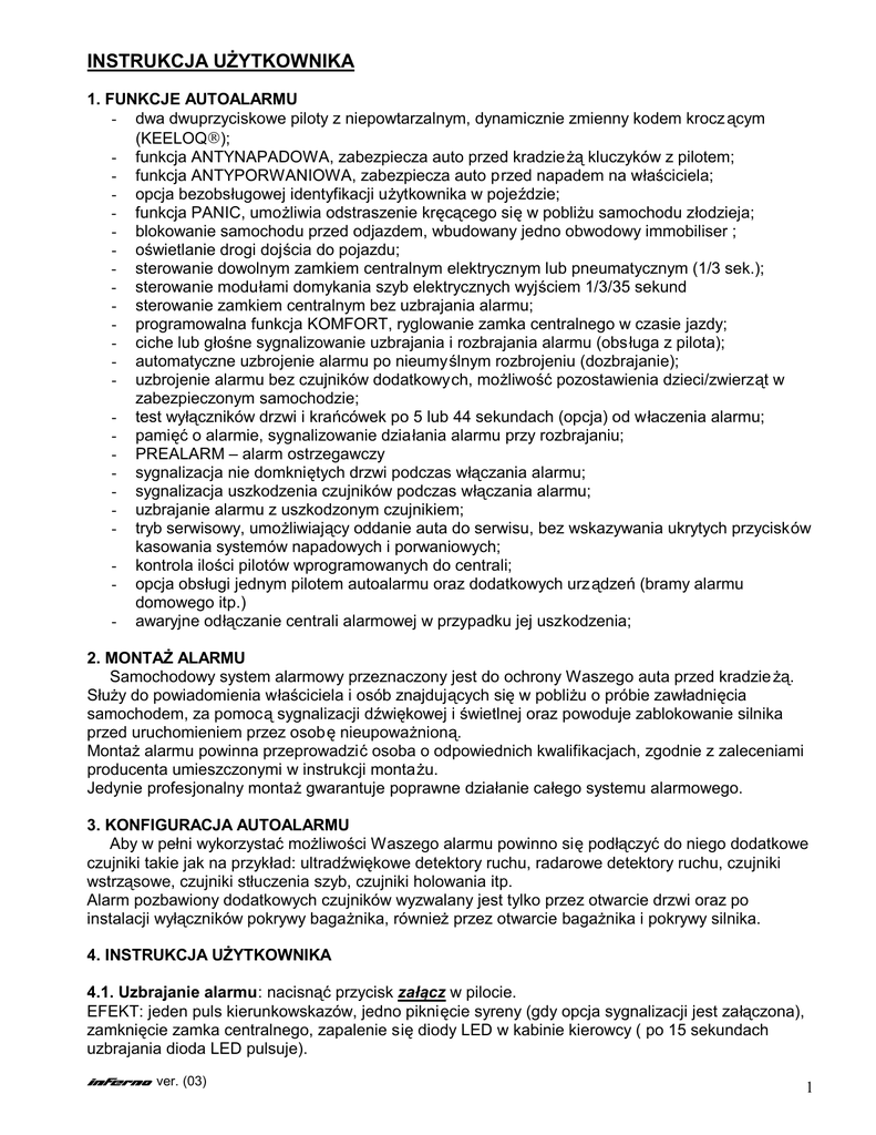 INSTRUKCJA UŻYTKOWNIKA 1. FUNKCJE AUTOALARMU - dwa dwuprzyciskowe piloty z niepowtarzalnym, dynamicznie zmienny kodem krocz ącym (KEELOQ); - funkcja ANTYNAPADOWA, zabezpiecza auto przed kradzieżą kluczyków z pilotem; - funkcja ANTYPORWANIOWA, zabezpiecza auto przed napadem na właściciela; - opcja bezobsługowej identyfikacji użytkownika w pojeździe; - funkcja PANIC, umożliwia odstraszenie kręcącego się w pobliżu samochodu złodzieja; - blokowanie samochodu przed odjazdem, wbudowany jedno obwodowy immobiliser ; - oświetlanie drogi dojścia do pojazdu; - sterowanie dowolnym zamkiem centralnym elektrycznym lub pneumatycznym (1/3 sek.); - sterowanie modułami domykania szyb elektrycznych wyjściem 1/3/35 sekund - sterowanie zamkiem centralnym bez uzbrajania alarmu; - programowalna funkcja KOMFORT, ryglowanie zamka centralnego w czasie jazdy; - ciche lub głośne sygnalizowanie uzbrajania i rozbrajania alarmu (obsługa z pilota); - automatyczne uzbrojenie alarmu po nieumyślnym rozbrojeniu (dozbrajanie); - uzbrojenie alarmu bez czujników dodatkowych, możliwość pozostawienia dzieci/zwierząt w zabezpieczonym samochodzie; - test wyłączników drzwi i krańcówek po 5 lub 44 sekundach (opcja) od właczenia alarmu; - pamięć o alarmie, sygnalizowanie działania alarmu przy rozbrajaniu; - PREALARM – alarm ostrzegawczy - sygnalizacja nie domkniętych drzwi podczas włączania alarmu; - sygnalizacja uszkodzenia czujników podczas włączania alarmu; - uzbrajanie alarmu z uszkodzonym czujnikiem; - tryb serwisowy, umożliwiający oddanie auta do serwisu, bez wskazywania ukrytych przycisków kasowania systemów napadowych i porwaniowych; - kontrola ilości pilotów wprogramowanych do centrali; - opcja obsługi jednym pilotem autoalarmu oraz dodatkowych urz ądzeń (bramy alarmu domowego itp.) - awaryjne odłączanie centrali alarmowej w przypadku jej uszkodzenia; 2. MONTAŻ ALARMU Samochodowy system alarmowy przeznaczony jest do ochrony Waszego auta przed kradzie żą. Służy do powiadomienia właściciela i osób znajdujących się w pobliżu o próbie zawładnięcia samochodem, za pomocą sygnalizacji dźwiękowej i świetlnej oraz powoduje zablokowanie silnika przed uruchomieniem przez osobę nieupoważnioną. Montaż alarmu powinna przeprowadzić osoba o odpowiednich kwalifikacjach, zgodnie z zaleceniami producenta umieszczonymi w instrukcji montażu. Jedynie profesjonalny montaż gwarantuje poprawne działanie całego systemu alarmowego. 3. KONFIGURACJA AUTOALARMU Aby w pełni wykorzystać możliwości Waszego alarmu powinno się podłączyć do niego dodatkowe czujniki takie jak na przykład: ultradźwiękowe detektory ruchu, radarowe detektory ruchu, czujniki wstrząsowe, czujniki stłuczenia szyb, czujniki holowania itp. Alarm pozbawiony dodatkowych czujników wyzwalany jest tylko przez otwarcie drzwi oraz po instalacji wyłączników pokrywy bagażnika, również przez otwarcie bagażnika i pokrywy silnika. 4. INSTRUKCJA UŻYTKOWNIKA 4.1. Uzbrajanie alarmu: nacisnąć przycisk załącz w pilocie. EFEKT: jeden puls kierunkowskazów, jedno piknięcie syreny (gdy opcja sygnalizacji jest załączona), zamknięcie zamka centralnego, zapalenie się diody LED w kabinie kierowcy ( po 15 sekundach uzbrajania dioda LED pulsuje). Inferno ver. (03) 1 4.1.1. Ciche uzbrajanie alarmu: Jeżeli mamy ustawioną opcję głośnego potwierdzenia załączenia/wyłączenia alarmu, to przytrzymanie przycisku załącz na dłużej niż dwie sekundy spowoduje, że alarm uzbroi się bez potwierdzenia syrenką. 4.1.2. Głośne uzbrajanie alarmu: Jeżeli mamy ustawioną opcję cichego potwierdzenia załączenia/wyłączenia alarmu, to przytrzymanie przycisku załącz na dłużej niż dwie sekundy spowoduje, że alarm uzbroi się z potwierdzeniem syrenką. 4.2. Sygnalizacja nie domkniętych drzwi: jeżeli po naciśnięciu przycisku załącz w pilocie syrenka szybko piknie cztery razy oznacza to że jedne z drzwi zostały nieprawidłowo domknięte, lub jeden z wyłączników krańcowych drzwi jest uszkodzony. 4.3. Sygnalizacja uszkodzenia czujników dodatkowych: jeżeli po naciśnięciu przycisku załącz w pilocie syrenka szybko piknie trzy razy oznacza to, że czujnik dodatkowy jest uszkodzony. 4.4. Sygnalizacja uszkodzenia czujników PREALARMU: jeżeli po naciśnięciu przycisku załącz w pilocie syrenka szybko piknie sześć razy oznacza to, że czujnik PREALARMU jest uszkodzony. UWAGA! Sygnalizacja nie domkniętych drzwi oraz uszkodzenia czujników zawsze jest potwierdzana pikaniem syrenki, bez względu na ustawienie opcji cichego/głośnego sygnalizowania. 4.5. Wyłączanie czujników dodatkowych: w trakcie uzbrajania alarmu ( dioda LED świeci ciągle) nacisnąć przycisk załącz w pilocie. EFEKT: jeden dłuższy puls kierunkowskazów, piknięcie syreny, wyłączenie zasilania czujników dodatkowych (wejście nadal aktywne). 4.6. Rozbrajanie alarmu: nacisnąć przycisk wyłącz w pilocie. EFEKT: otwarcie zamka centralnego, dwa piknięcia syreny (gdy opcja sygnalizacji jest załączona), dwa pulsy kierunkowskazów, zgaśnięcie diody LED w kabinie kierowcy. 4.6.1. Ciche rozbrajanie alarmu: Jeżeli mamy ustawioną opcję głośnego potwierdzenia załączenia/wyłączenia alarmu, to przytrzymanie przycisku wyłącz na dłużej niż dwie sekundy spowoduje że alarm rozbroi się bez potwierdzenia syrenką. 4.6.2. Głośne rozbrajanie alarmu: Jeżeli mamy ustawioną opcję cichego potwierdzenia załączenia/wyłączenia alarmu, to przytrzymanie przycisku wyłącz na dłużej niż dwie sekundy spowoduje że alarm rozbroi się z potwierdzeniem syrenką. 4.7. Pamięć alarmu: jeżeli podczas rozbrajania alarmu syrena piknie: trzy razy oznacza to że pobudzone było wejście czujników dodatkowych, cztery razy oznacza to że pobudzone było wejście czujników drzwiowych. UWAGA! Pamięć alarmu zawsze jest potwierdzana pikaniem syrenki, bez względu na ustawienie opcji cichego/głośnego sygnalizowania