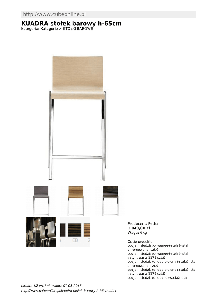 http://www.cubeonline.pl KUADRA stołek barowy h-65cm kategoria: Kategorie > STOŁKI BAROWE Producent: Pedrali 1 049,00 zł Waga: 6kg strona: 1/3 wydrukowano: 07-03-2017 http://www.cubeonline.pl/kuadra-stolek-barowy-h-65cm.html Opcje produktu: opcje: : siedzisko- wenge+stelaż- stal chromowana szt.0 opcje: : siedzisko- wenge+stelaż- stal satynowana 1179 szt.0 opcje: : siedzisko- dąb bielony+stelaż- stal chromowana szt.0 opcje: : siedzisko- dąb bielony+stelaż- stal satynowana 1179 szt.0 opcje: : siedzisko- ebano+stelaż- stal chromowana 849.00 szt.0 opcje: : siedzisko- ebano+stelaż- stal satynowana 1179 szt.0 opcje: : siedzisko- zebrano+stelaż- stal chromowana 849.00 szt.0 opcje: : siedzisko- zebrano+stelaż- stal satynowana 1179 szt.0 opcje: : siedzisko- dąb czarny+stelaż- stal chromowana szt.0 opcje: : siedzisko- dąb czarny+stelaż- stal satynowana 1179 szt.0 Kod QR: KUADRA, wyprodukowany przez Pedrali to elegancki, wygodny sto?ek barowy. Jego siedzisko jest zrobione ze sklejki fornirowanej (do wyboru kolory: d?b wenge, d?b bielony, ebano, zebrano, czarny). Stela? wykonany jest ze stali chromowanej lub satynowanej, ma przekrój kwadratowy 20x20mm. strona: 2/3 wydrukowano: 07-03-2017 http://www.cubeonline.pl/kuadra-stolek-barowy-h-65cm.html WYMIARY (CM): wysoko?? siedziska- 65 wysoko?? ca?kowita- 89 szeroko??- 45 g??boko??- 54 MATERIA?: stela?- stal chromowana lub satynowana, siedzisko- fornirowane- d?b wenge, d?b bielony, ebano, zebrano Inne produkty Pedrali: http://www.cubeonline.pl/manufacturer/pedrali strona: 3/3 wydrukowano: 07-03-2017 http://www.cubeonline.pl/kuadra-stolek-barowy-h-65cm.html