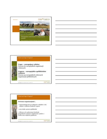 12/06/2013 DIS(13)4473 Utrzymanie rentowności w niepewnych czasach Wiktor Szmulewicz, Wiceprzewodniczący Copa, 6 czerwca 2013 r. Czym są Copa i Cogeca? Copa – europejscy rolnicy Zrzesza 60 europejskich organizacji rolniczych Cogeca – europejskie spółdzielnie rolnicze Zrzesza 35 europejskich rolniczych organizacji spółdzielczych Copa-Cogeca | Głos europejskich rolników i ich spółdzielni | 2 Czym są Copa i Cogeca? Dwiema organizacjami... • reprezentującymi 30 milionów rolników i ich rodzin w sektorze hodowli i upraw • oraz około 40000 spółdzielni • Główny cel: podwyższyć dochody gospodarstw poprzez zwiększenie zysków z rynku oraz wsparcie publiczne Copa-Cogeca | Głos europejskich rolników i ich spółdzielni | 3 1 12/06/2013 Znaczenie unijnego sektora hodowli - 2,5 mln gospodarstw hoduje bydło w UE-27; - wartość produkcji zwierzęcej: +2,8 % od 2002 r. przy obniżeniu poziomu produkcji mięsa owiec (30 %), wołowiny (-3 %) i produktów mlecznych (3 %); - najniższe przychody w rolnictwie; - sektor znaczący z punktu widzenia eksportu z UE do krajów rozwiniętych (wieprzowina do państw ASEAN, produkty mleczne do Kanady i USA) Copa-Cogeca | Głos europejskich rolników i ich spółdzielni | 4 Najważniejsze wyzwania stojące przed europejskim rolnictwem 1. Wzrasta światowe zapotrzebowanie na żywność we wszystkich kategoriach mięsa; 2. Koszty produkcji wzrastają szybciej, niż ceny uzyskiwane przez producentów - przepisy unijne (dobrostan zwierząt, kwestie sanitarne); - koszty środków produkcji (pasze, energia...) 3. Brak stabilności na rynkach jest nowym zjawiskiem w Europie, z którym nowa WPR musi sobie poradzić. Copa-Cogeca | Głos europejskich rolników i ich spółdzielni | 5 Plan działań na rzecz sektora hodowli 1. Przeniesienie kosztów produkcji na dalsze ogniwa łańcucha żywnościowego - europejskie obserwatorium cen; - uczciwe praktyki handlowe; - relacje handlowe i organizacje producentów 2. Wyjątkowe wahania na rynku pasz - usprawnienie produkcji białek roślinnych w Europie; - ponowne wprowadzenie przetworzonych białek zwierzęcych; - możliwość składowania zapasów surowców w UE; - możliwość zawierania umów pomiędzy producentami pasz i hodowcami Copa-Cogeca | Głos europejskich rolników i ich spółdzielni | 6 2 12/06/2013 Plan działań na rzecz sektora hodowli 3. Instrumenty WPR - aktualizacja cen interwencyjnych i referencyjnych; - utrzymanie refundacji wywozowych; - potrzeba wzmocnienia zdolności do inwestycji; - polityka promocji na rzecz zachęcania do konsumpcji mięsa (nacisk nie tylko na jakość) 4. Horyzont 2020 – programy badawcze - zwiększenie wydajności pasz; - lepsze wykorzystanie produktów ubocznych (biogospodarka); - środki zapobiegawcze na rzecz zdrowia zwierząt; - doskonalenie technologii selekcji genetycznej w celu poprawienia dobrostanu zwierząt Copa-Cogeca | Głos europejskich rolników i ich spółdzielni | 7 Copa-Cogeca apeluje o: - Jak najszybsze wprowadzenie europejskiego obserwatorium cen dla różnych rodzajów mięsa (wołowiny, wieprzowiny i drobiu); - Grupy doradcze sektora mięsa powinny koncentrować się na sytuacji rynkowej i rozkładaniu cen w całym łańcuchu żywnościowym. Nie można planować gospodarki rolnej w perspektywie krótkoterminowej. Dlatego też wszystkie informacje pozwalające rolnikom na dostosowanie swoich decyzji i dopasowanie się do nieustannie zmieniających się warunków są przydatne. W związku z tym dobrze byłoby stworzyć obserwatorium cen obejmujące koszty nakładów, ceny produktów, produkcję oraz wskaźniki podaży/ popytu; - W sektorze wieprzowiny należy organizować co trzy miesiące posiedzenia grupy roboczej Prognozy oraz grupy doradczej Wieprzowina oraz szeroko udostępniać wnioski z tych posiedzeń. W perspektywie średnioterminowej, przeprowadzanie dwóch ankiet w sektorze wieprzowiny w roku (zamiast jednej) usprawniłoby działanie systemu monitoringu Copa-Cogeca | The voice of European farmers and their cooperatives | 8 Copa-Cogeca apeluje o: - Jasną definicję nieuczciwych praktyk handlowych; - Niezależny organ rozwiązujący spory i gwarantujący odpowiedni poziom anonimowości, gdy to konieczne; - Jasne zasady i sankcje w przypadku naruszeń. stosowane Copa-Cogeca | The voice of European farmers and their cooperatives | 9 3 12/06/2013 Copa-Cogeca apeluje o: poszerzenie przepisów odnośnie stosunków handlowych i negocjacji handlowych obowiązujących w sektorze mleka o sektor wołowiny. Copa-Cogeca | The voice of European farmers and their cooperatives | 10 Copa-Cogeca domaga się: - dla sektorów wołowiny, owiec, wieprzowiny i drobiu dobrowolnego uznania organizacji producentów, a zwłaszcza spółdzielni, organizacji międzybranżowych oraz wsparcia współpracy producentów, a także tworzenia przez rolników krótkich lokalnych łańcuchów dostaw żywności, które ograniczają presję wywieraną przez pośredników Copa-Cogeca | The voice of European farmers and their cooperatives | 11 Copa-Cogeca apeluje o: - intensyfikację badań nad odmianami roślin białkowych (bobik, soja) w celu zwiększenia zbiorów; - utrzymanie potencjału produkcyjnego lucerny w Europie; - zwiększenie dostępu do nowych odmian, w tym odmian zbóż; - zwiększenie zastosowania makuchów sojowych w sektorze hodowli; - zwiększenie spójności polityk europejskich w celu usunięcia przeszkód w produkcji białek roślinnych, jakie mogą stanowić czynniki iLUC. Copa-Cogeca | The voice of European farmers and their cooperatives | 12 4 12/06/2013 Copa-Cogeca apeluje o: - Wzmocnienie budżetu w celu udostępnienia testów w odpowiednim czasie; Rozpoczęcie dyskusji z państwami członkowskimi w celu ułatwienia procesu podejmowania decyzji; - Łatwy do zastosowania próg tolerancji dla technicznie niemożliwej do uniknięcia obecności śladów przetworzonych białek zwierzęcych ze względu na transfery w zakładach produkcyjnyc