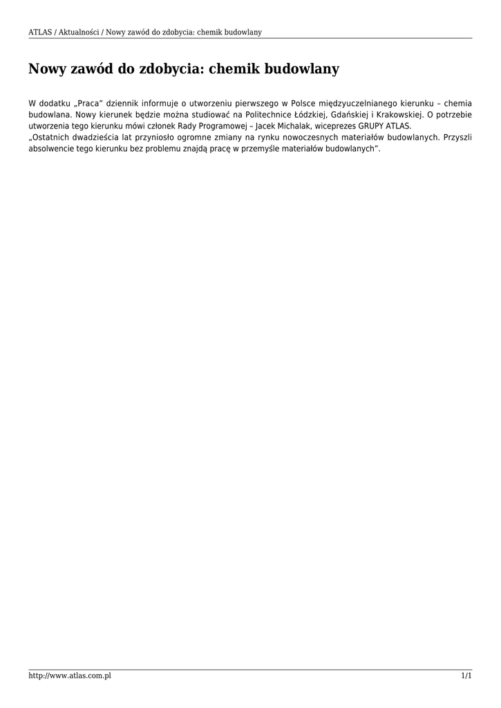ATLAS / Aktualności / Nowy zawód do zdobycia: chemik budowlany Nowy zawód do zdobycia: chemik budowlany W dodatku „Praca” dziennik informuje o utworzeniu pierwszego w Polsce międzyuczelnianego kierunku – chemia budowlana. Nowy kierunek będzie można studiować na Politechnice Łódzkiej, Gdańskiej i Krakowskiej. O potrzebie utworzenia tego kierunku mówi członek Rady Programowej – Jacek Michalak, wiceprezes GRUPY ATLAS. „Ostatnich dwadzieścia lat przyniosło ogromne zmiany na rynku nowoczesnych materiałów budowlanych. Przyszli absolwencie tego kierunku bez problemu znajdą pracę w przemyśle materiałów budowlanych”. http://www.atlas.com.pl 1/1