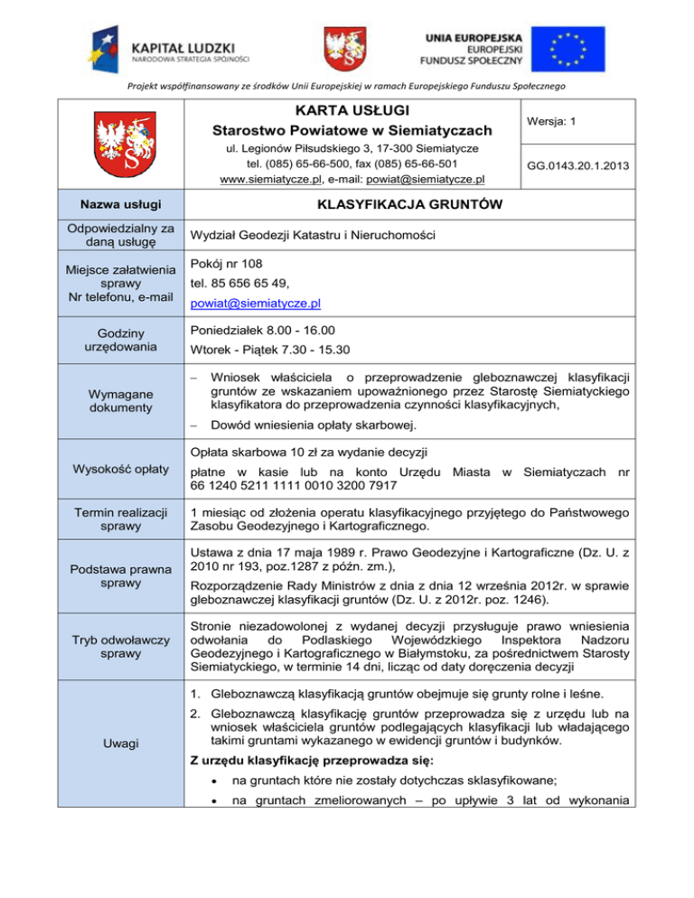 Projekt współfinansowany ze środków Unii Europejskiej w ramach Europejskiego Funduszu Społecznego KARTA USŁUGI Starostwo Powiatowe w Siemiatyczach ul. Legionów Piłsudskiego 3, 17-300 Siemiatycze tel. (085) 65-66-500, fax (085) 65-66-501 www.siemiatycze.pl, e-mail: [email protected] Miejsce załatwienia sprawy Nr telefonu, e-mail Godziny urzędowania GG.0143.20.1.2013 KLASYFIKACJA GRUNTÓW Nazwa usługi Odpowiedzialny za daną usługę Wersja: 1 Wydział Geodezji Katastru i Nieruchomości Pokój nr 108 tel. 85 656 65 49, [email protected] Poniedziałek 8.00 - 16.00 Wtorek - Piątek 7.30 - 15.30 Wniosek właściciela o przeprowadzenie gleboznawczej klasyfikacji gruntów ze wskazaniem upoważnionego przez Starostę Siemiatyckiego klasyfikatora do przeprowadzenia czynności klasyfikacyjnych, Dowód wniesienia opłaty skarbowej. Wymagane dokumenty Opłata skarbowa 10 zł za wydanie decyzji Wysokość opłaty płatne w kasie lub na konto Urzędu Miasta w Siemiatyczach nr 66 1240 5211 1111 0010 3200 7917 Termin realizacji sprawy 1 miesiąc od złożenia operatu klasyfikacyjnego przyjętego do Państwowego Zasobu Geodezyjnego i Kartograficznego. Podstawa prawna sprawy Tryb odwoławczy sprawy Ustawa z dnia 17 maja 1989 r. Prawo Geodezyjne i Kartograficzne (Dz. U. z 2010 nr 193, poz.1287 z późn. zm.), Rozporządzenie Rady Ministrów z dnia z dnia 12 września 2012r. w sprawie gleboznawczej klasyfikacji gruntów (Dz. U. z 2012r. poz. 1246). Stronie niezadowolonej z wydanej decyzji przysługuje prawo wniesienia odwołania do Podlaskiego Wojewódzkiego Inspektora Nadzoru Geodezyjnego i Kartograficznego w Białymstoku, za pośrednictwem Starosty Siemiatyckiego, w terminie 14 dni, licząc od daty doręczenia decyzji 1. Gleboznawczą klasyfikacją gruntów obejmuje się grunty rolne i leśne. Uwagi 2. Gleboznawczą klasyfikację gruntów przeprowadza się z urzędu lub na wniosek właściciela gruntów podlegających klasyfikacji lub władającego takimi gruntami wykazanego w ewidencji gruntów i budynków. Z urzędu klasyfikację przeprowadza się: na gruntach które nie zostały dotychczas sklasyfikowane; na gruntach zmeliorowanych – po upływie 3 lat od wykonania urządzeń melioracji wodnych; na gruntach objętych postępowaniem scaleniowym; na gruntach, na których starosta zarządził przeprowadzenie modernizacji ewidencji gruntów i budynków albo okresowej; weryfikacji danych ewidencyjnych – w przypadku zmiany użytków gruntowych na gruntach podlegających klasyfikacji; po wystąpieniu klęski żywiołowej powodującej zmiany środowiska glebowego; po zalesieniu gruntów na podstawie przepisów o wspieraniu rozwoju obszarów wiejskich ze środków pochodzących z Sekcji Gwarancji Europejskiego Funduszu Orientacji i Gwarancji Rolnej lub na podstawie przepisów o wspieraniu obszarów wiejskich z udziałem środków Europejskiego Funduszu Rolnego na rzecz Rozwoju Obszarów Wiejskich. Operat z przeprowadzenia gleboznawczej klasyfikacji gruntów wykonywany jest na koszt właściciela, przez klasyfikatora wskazanego przez wnioskodawcę i upoważnionego przez starostę. Wzory wniosków Wniosek OPRACOWAŁ: SPRAWDZIŁ: ZATWIERDZIŁ: Jolanta Olędzka Marta Wendołowicz Jerzy Woźniak